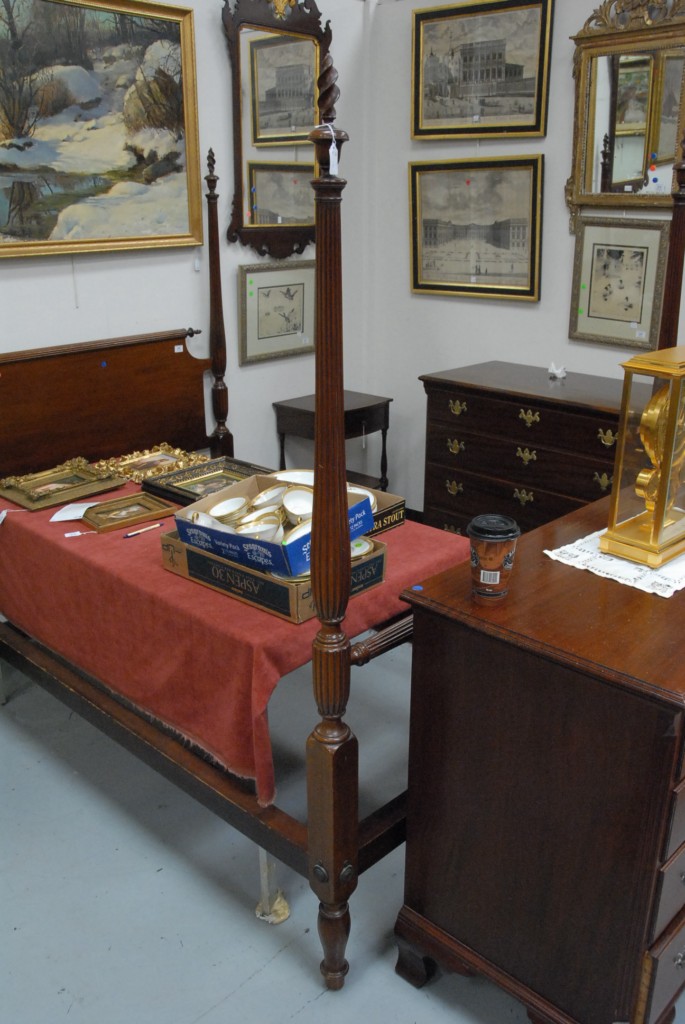 Margolis mahogany four post double bed having flame finials on tall fluted posts, signed in block Margolis 1937. height 71in. width 54in.