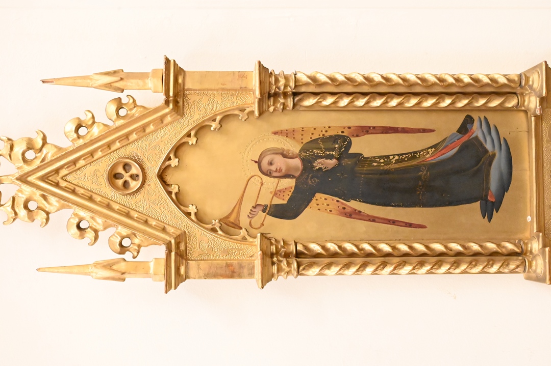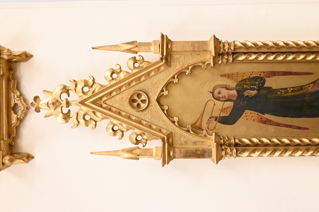 Condition: Chipping to paint, several cracks to board, losses. Please refer to photo. Both present well. Gilt/paint loss to icons, both with small dent/chip to lower part of board, cracking, frames with losses and repairs
