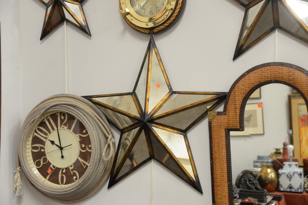 Six Piece Decorative Wall Hangings, to include two clocks, one mirror (as is), along with three matching mirrored stars, largest 33″ x 22 1/2″, Provenance: David and Cynthia Kim, 22 Stoney Wylde Lane, Greenwich, Connecticut. View home by visiting: https://www.zillow.com/homedetails/22-Stoney-Wylde-Ln-Greenwich-CT-06830/177238281_zpid/.