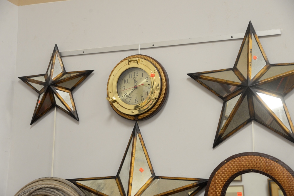 Lot 396: Six Piece Decorative Wall Hangings, to include two clocks, one mirror (as is), along with three matching mirrored stars, largest 33″…