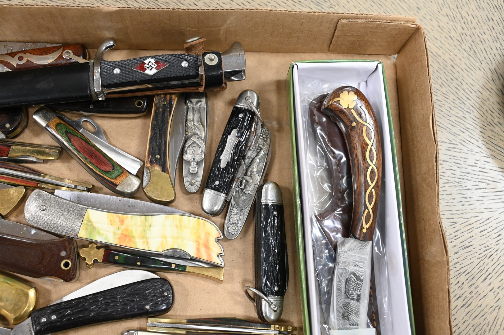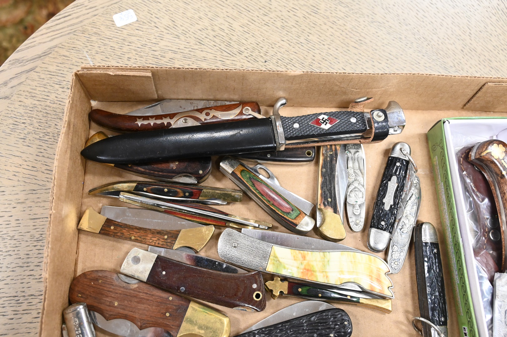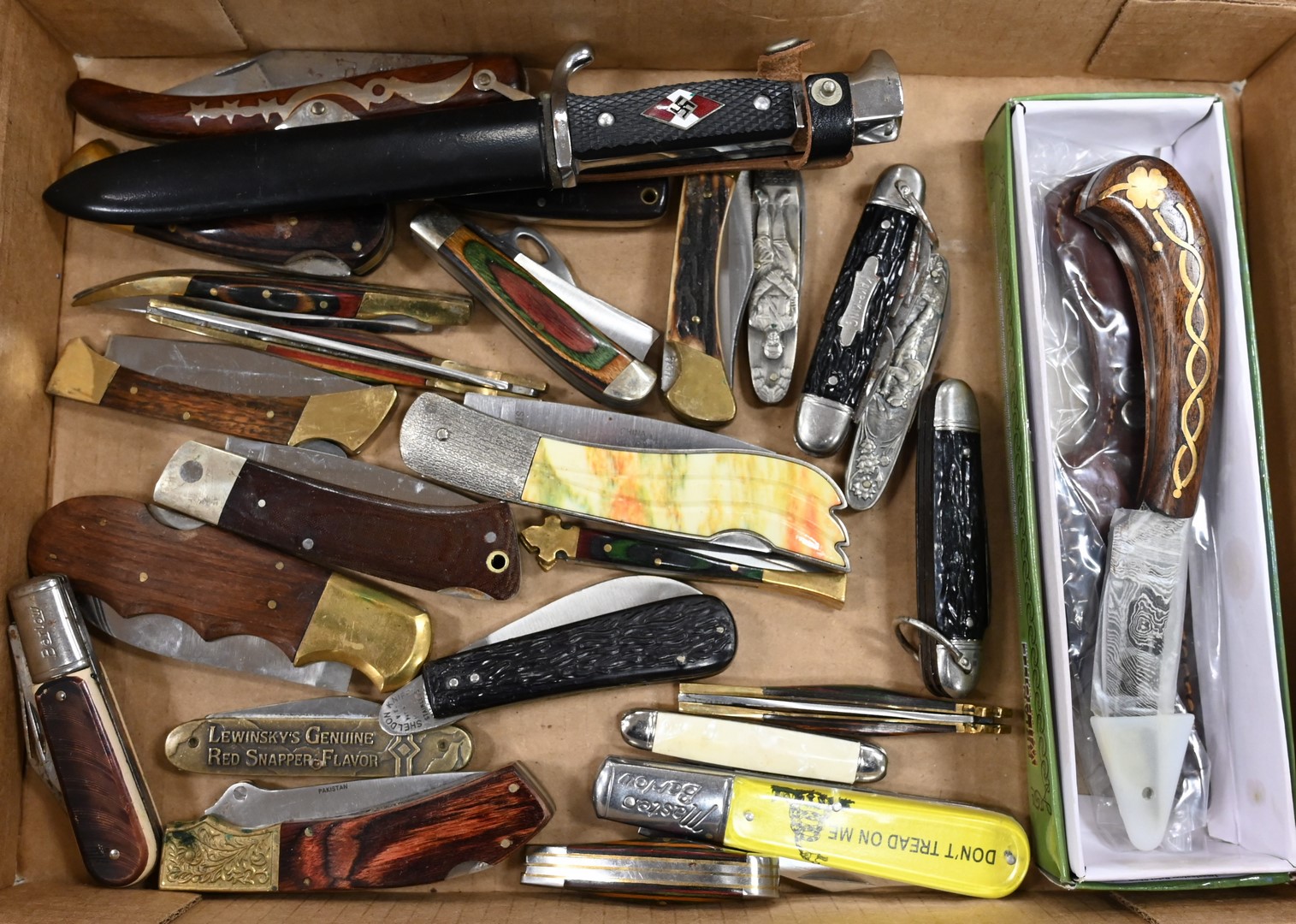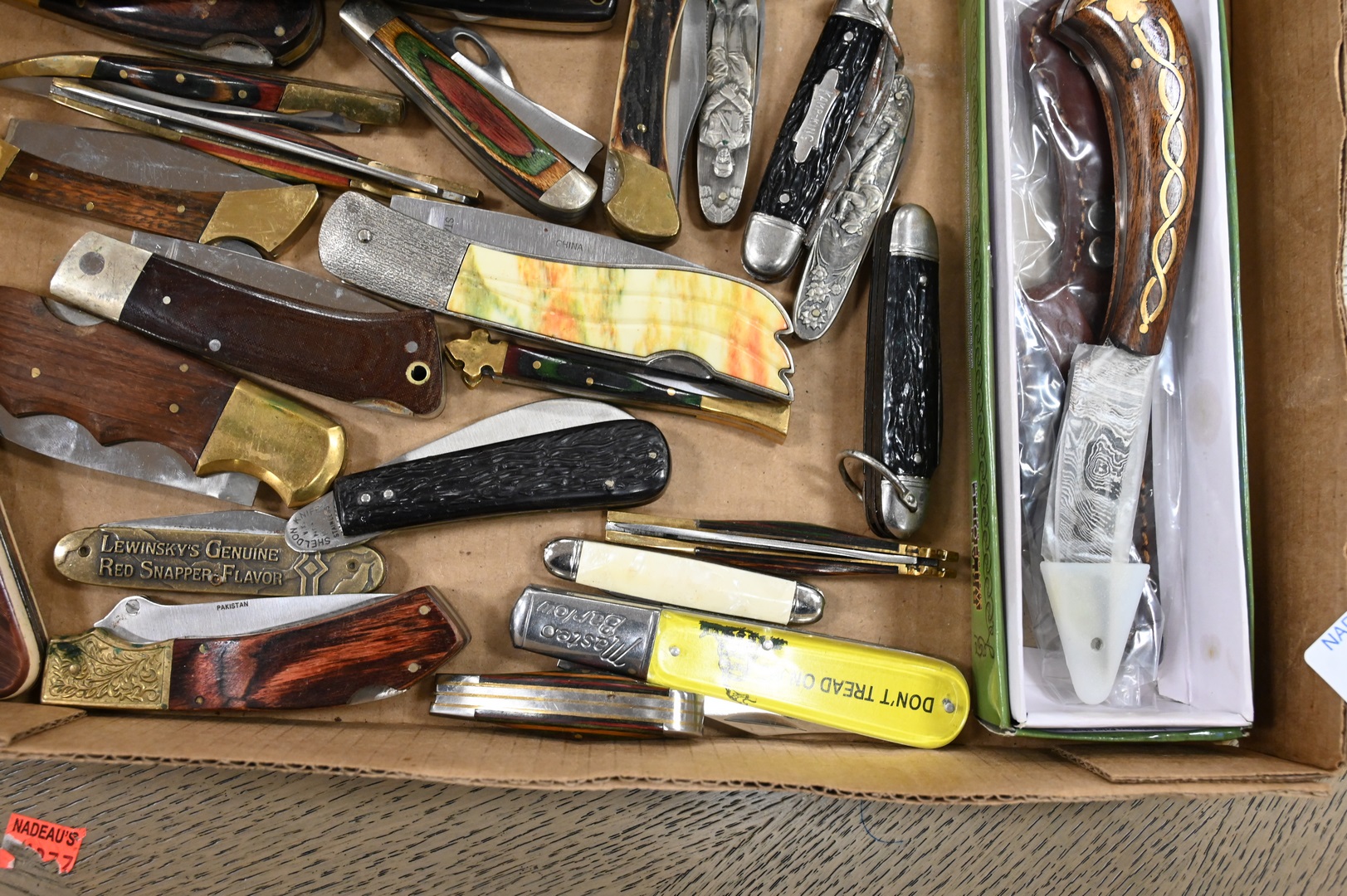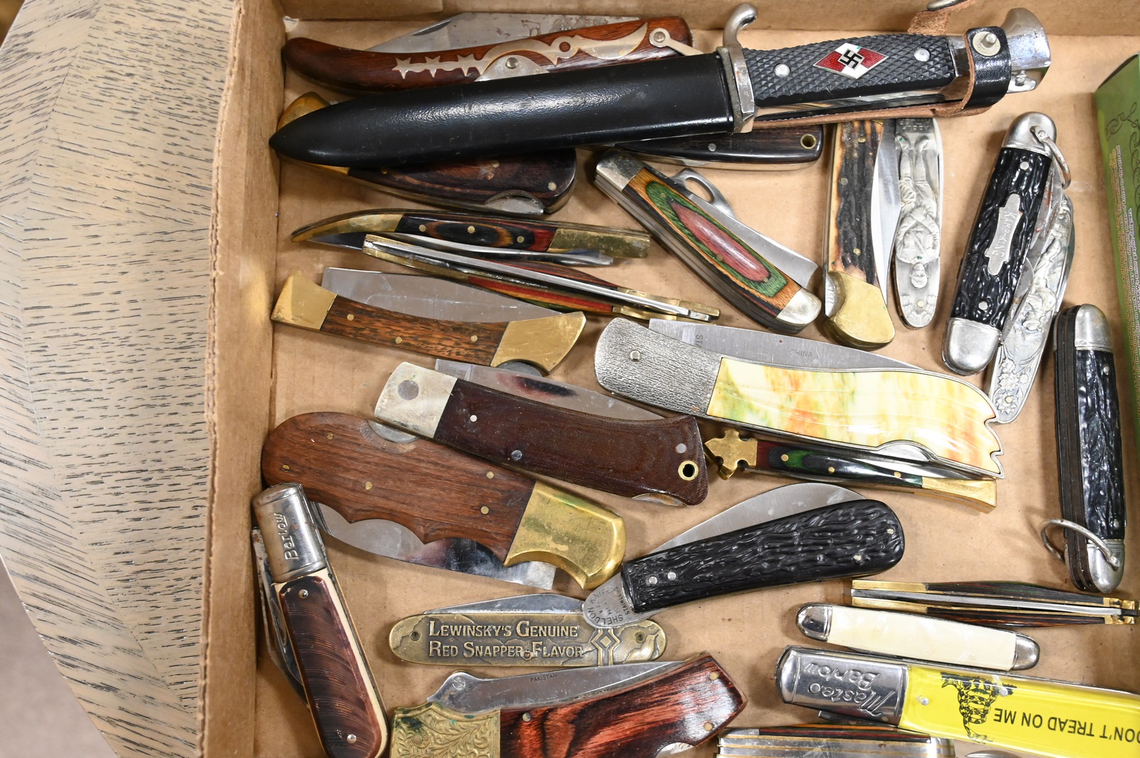 Tray Lot of Pocket and Buck Knives, to include Kamp-King, Barlo, Figural, etc, Provenance: Estate of Cyril H. Moore Jr, Kent, Connecticut.