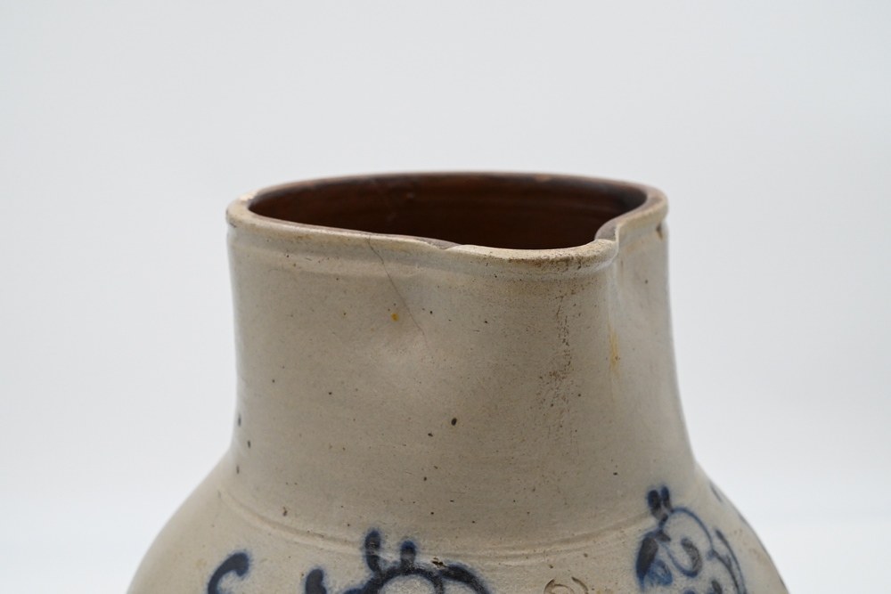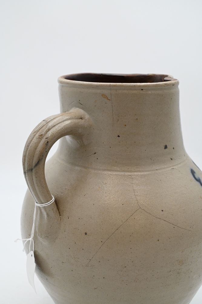 Lot 396: Two Gallon Stoneware Batter Pitcher having blue flowers and dated 1836 height 13 inches Provenance: Fifty Year Personal Collection of Clocks and American Antiques from Thomas Bailey, Manchester, Connecticut.