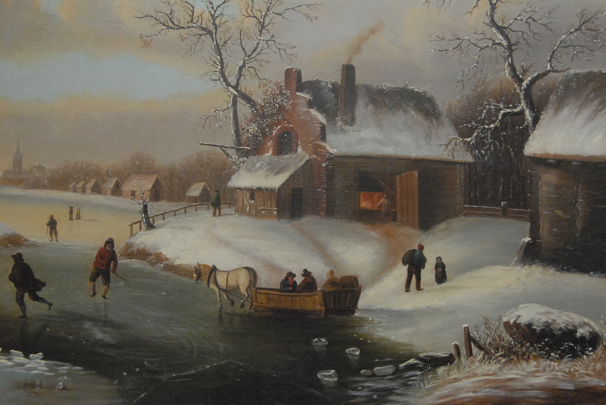 Lot 397: 19th Century American c. 1855 WINTER SCENE WITH ICE SKATERS oil on canvas unsigned 26 1/2 x 36 1/2