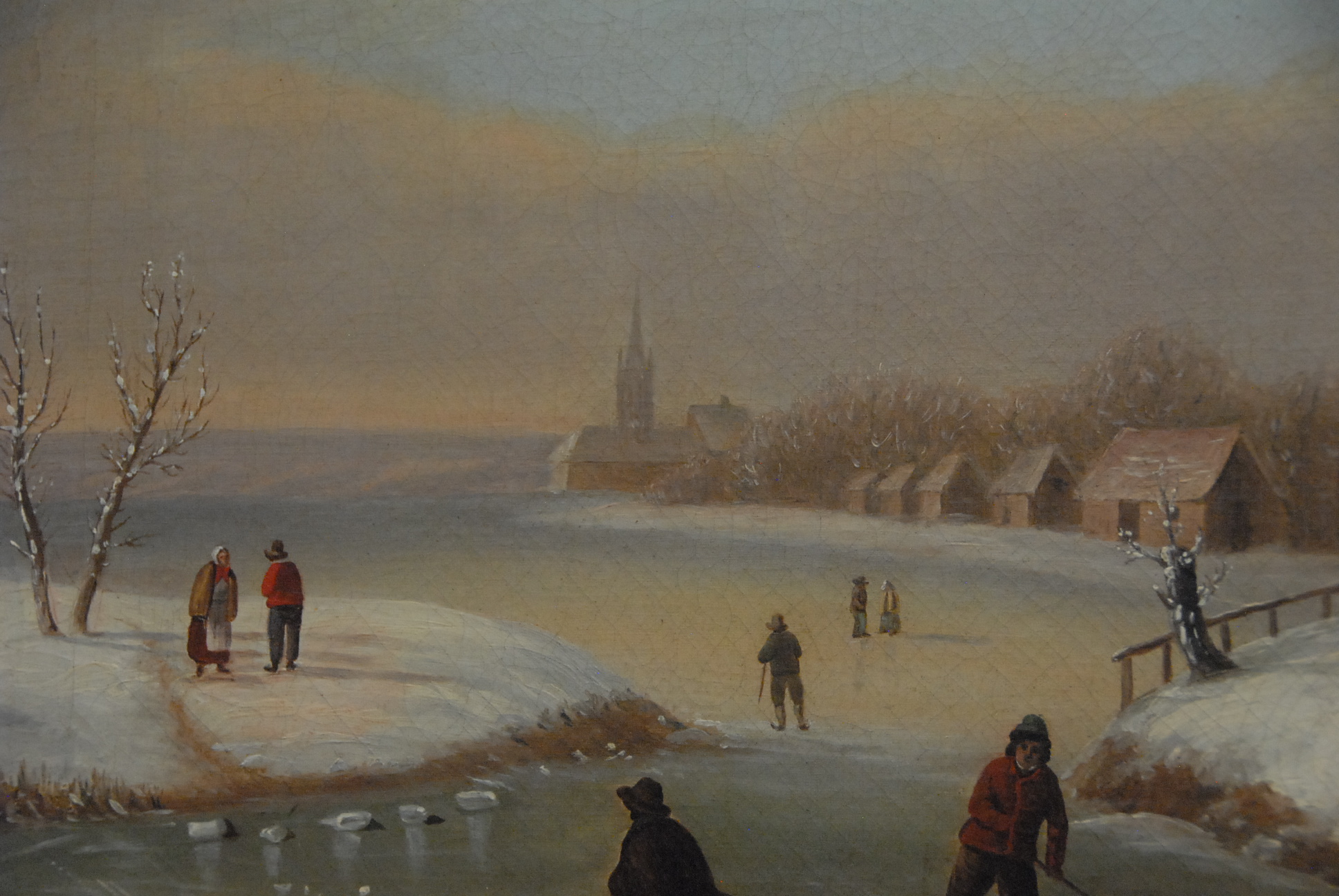 19th Century American c. 1855 WINTER SCENE WITH ICE SKATERS oil on canvas unsigned 26 1/2 x 36 1/2