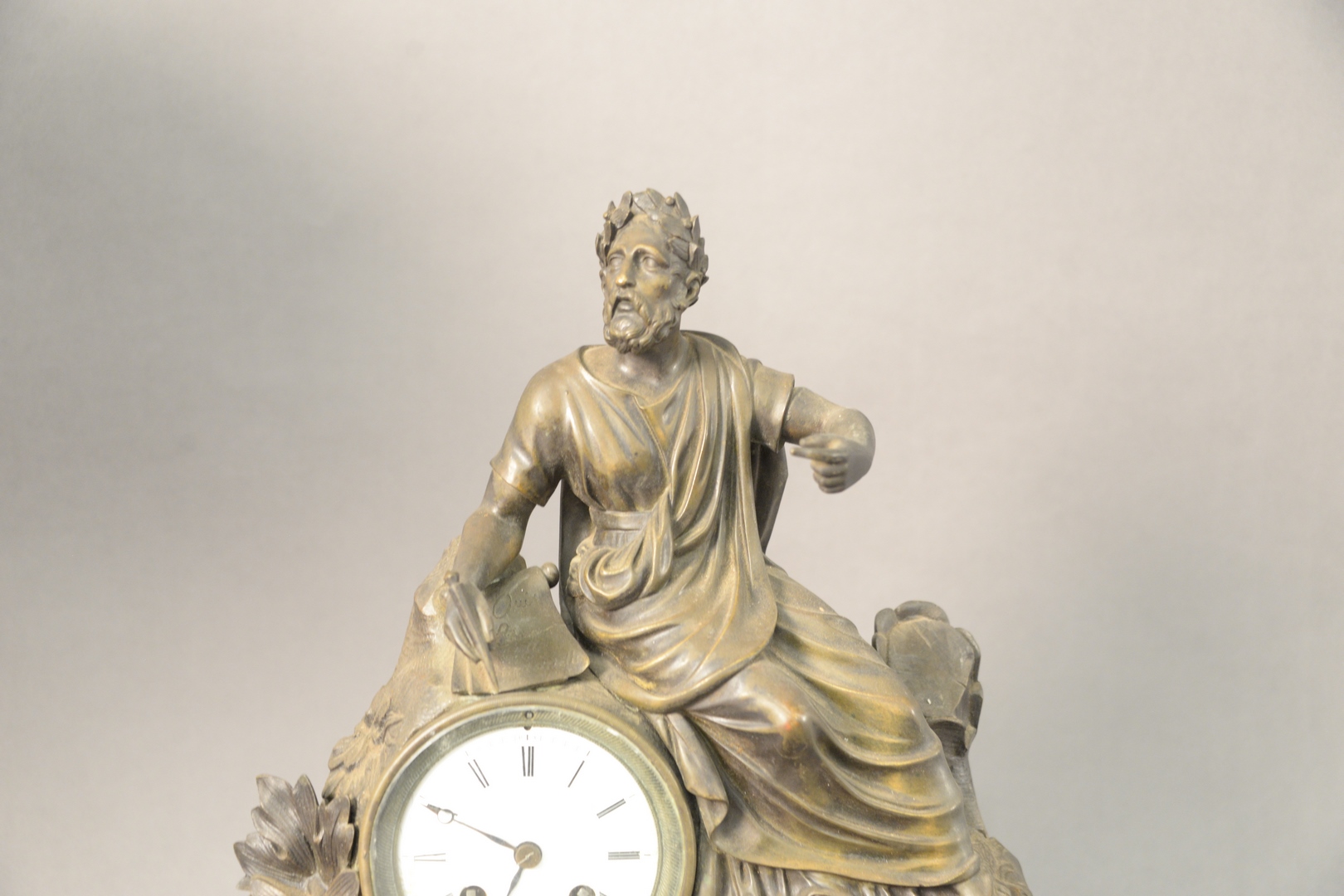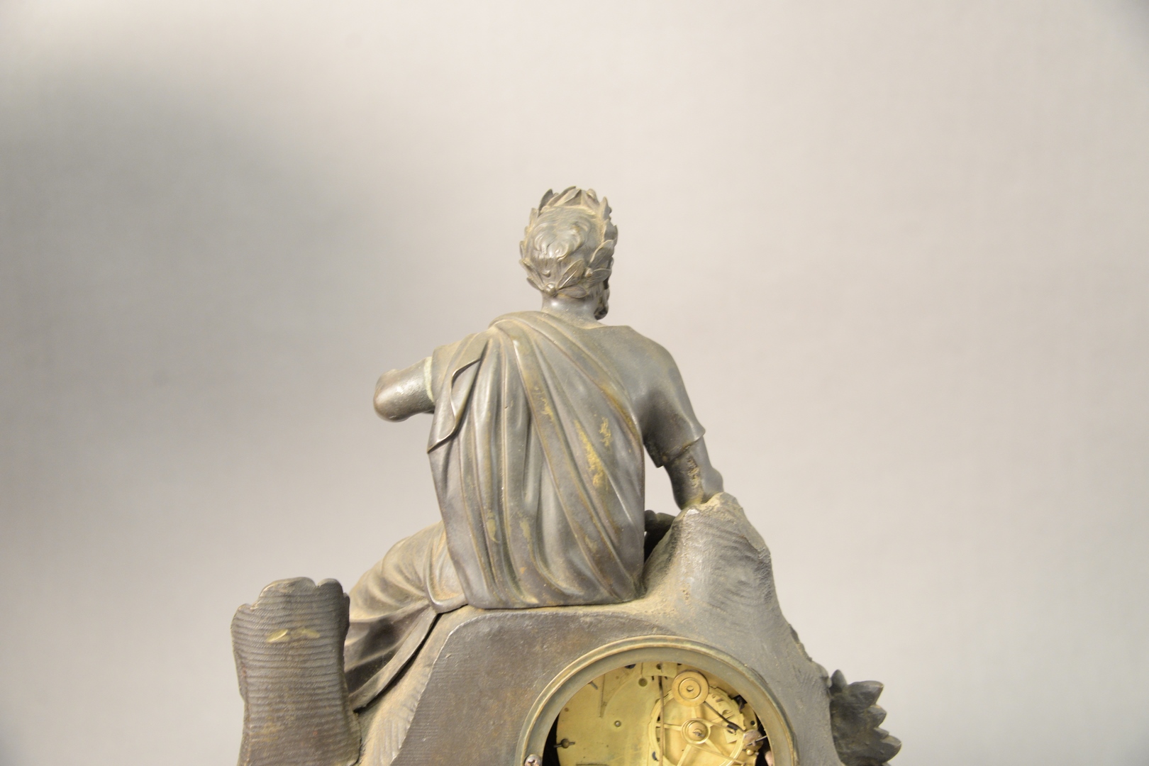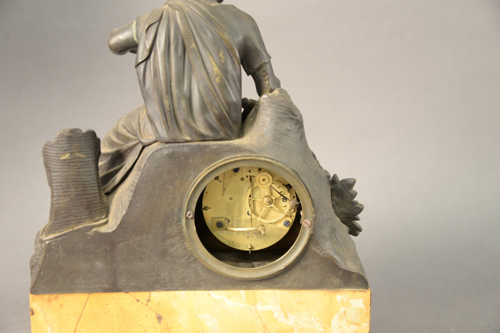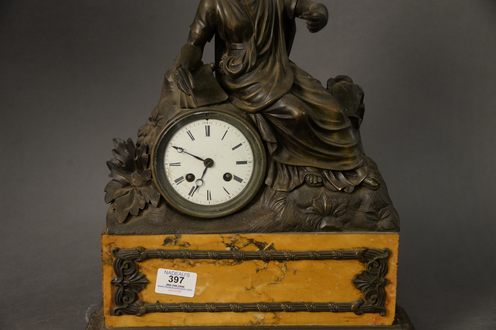 Lot 397: French Empire Bronze Figural Clock, mounted on orange marble base, having brass mounted details, height 16 1/2 inches, width 14 inches.