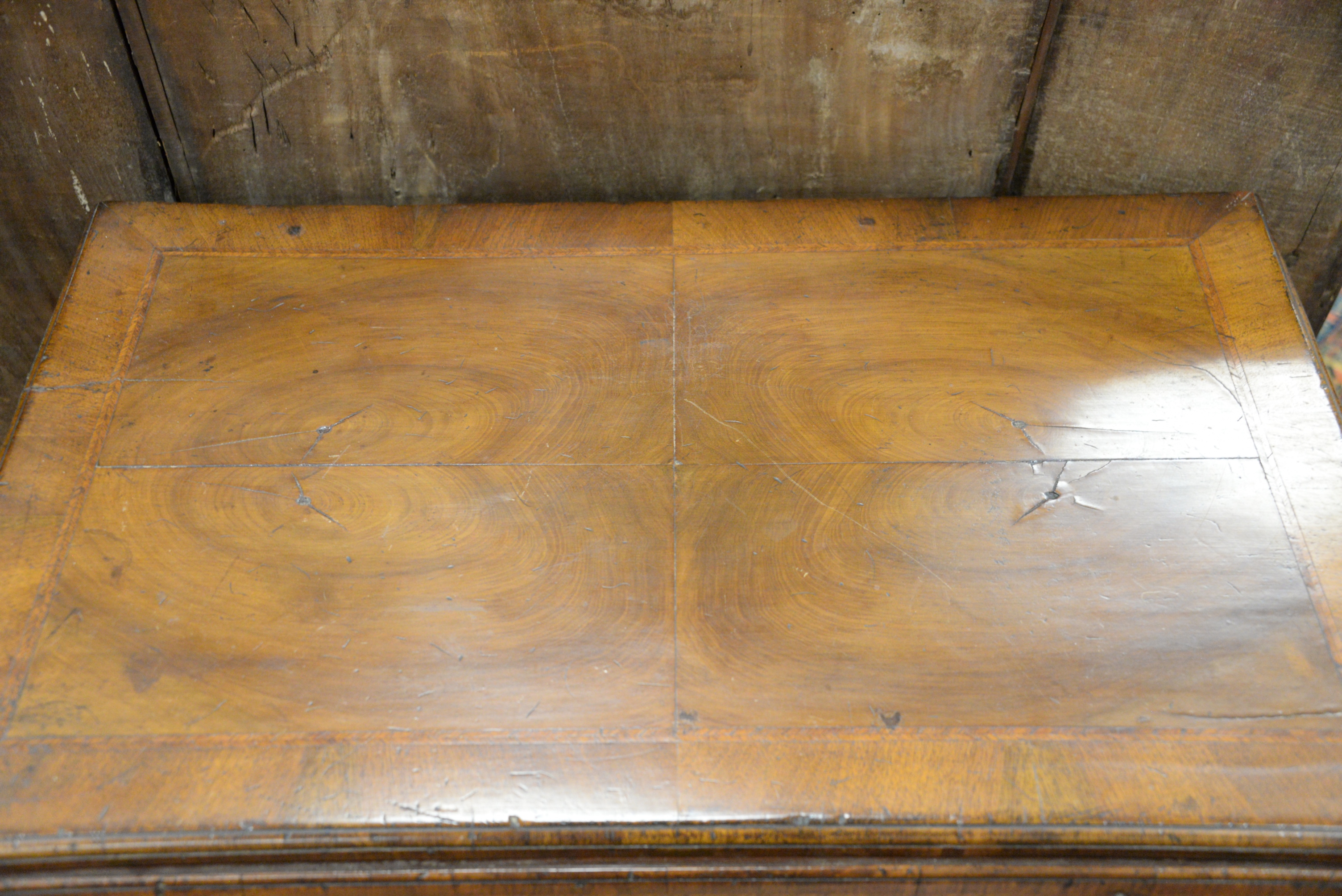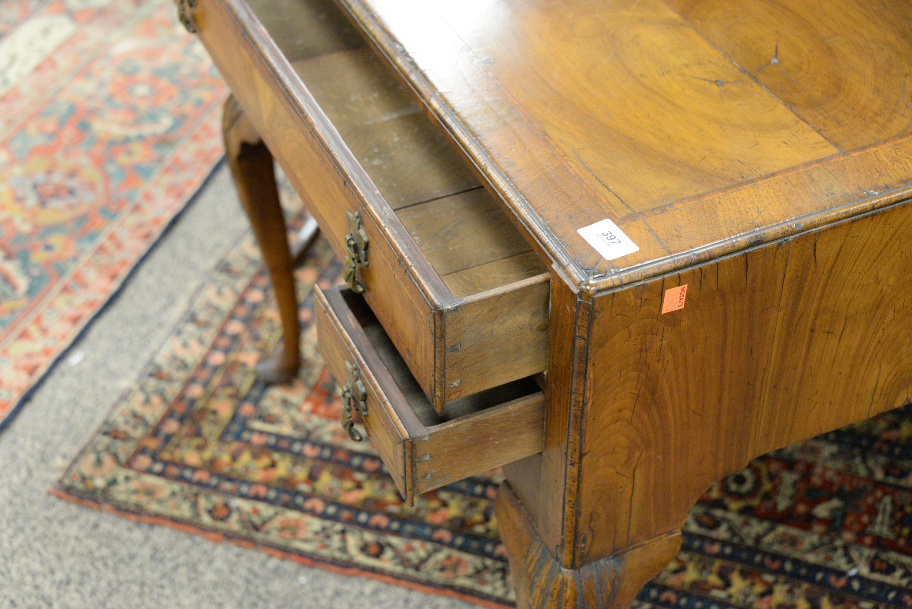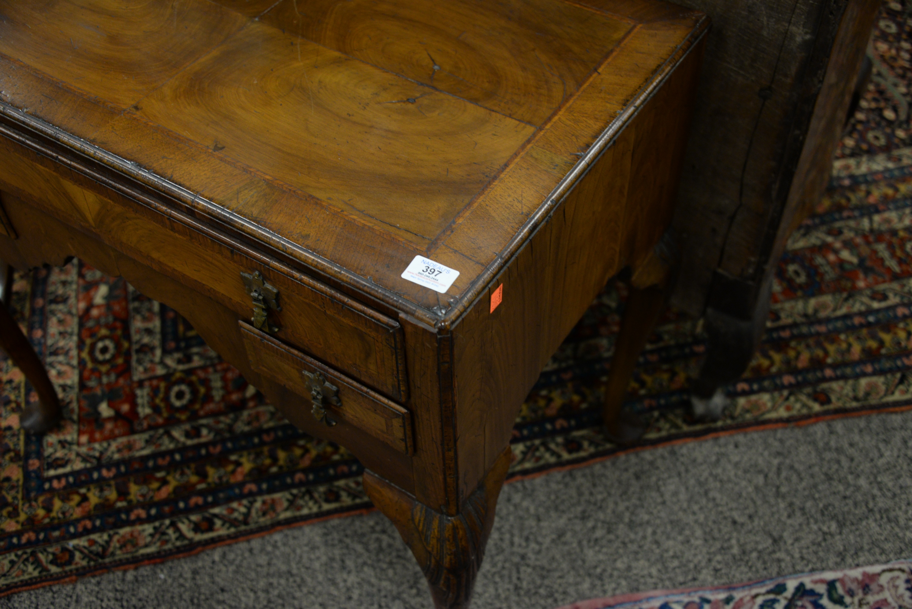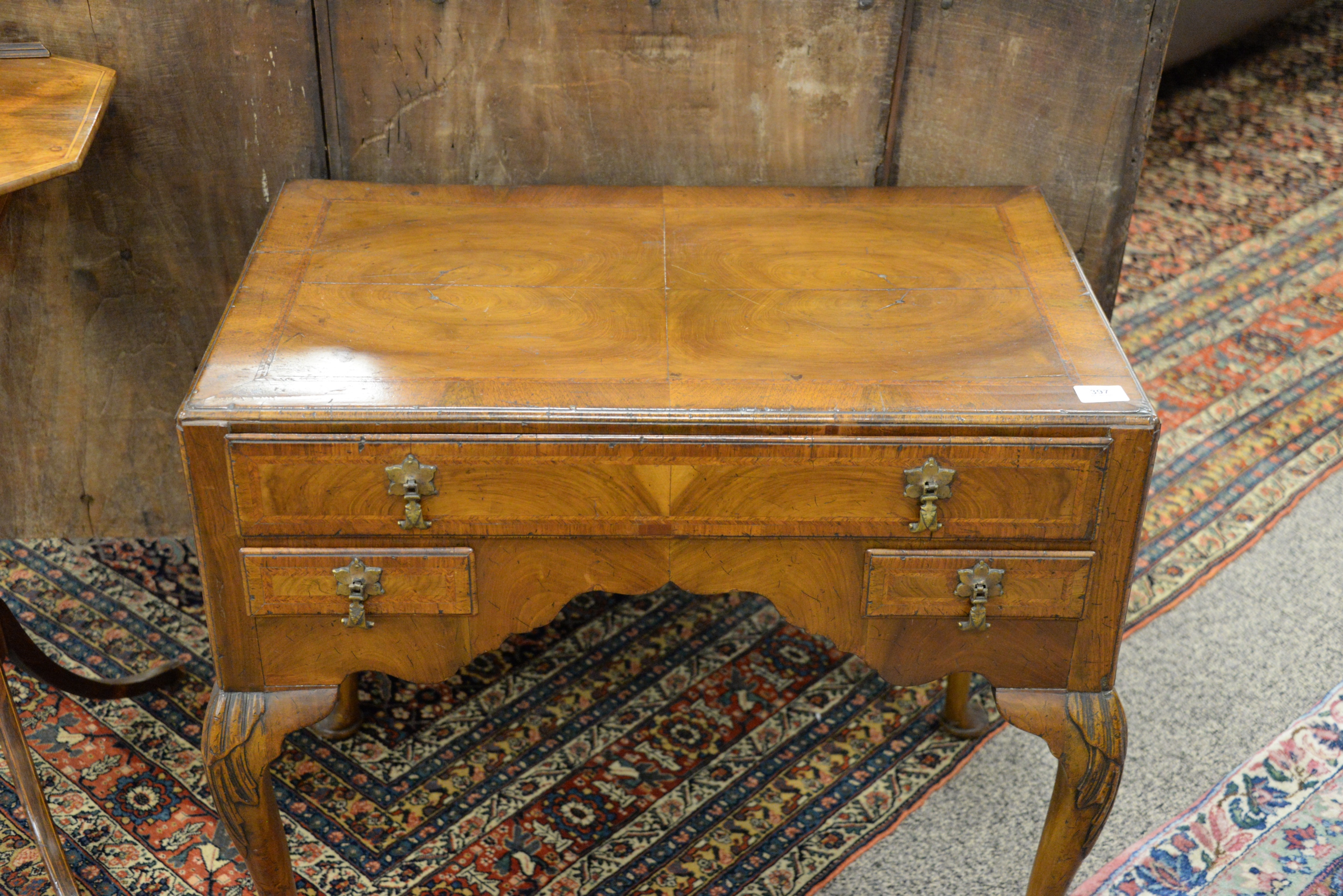 George III Style Walnut Lowboy, having herringbone and banded inlaid top over one long and two short drawers, on carved cabriole legs ending in pad feet, height 28 inches, top 18 1/2″ x 30″.