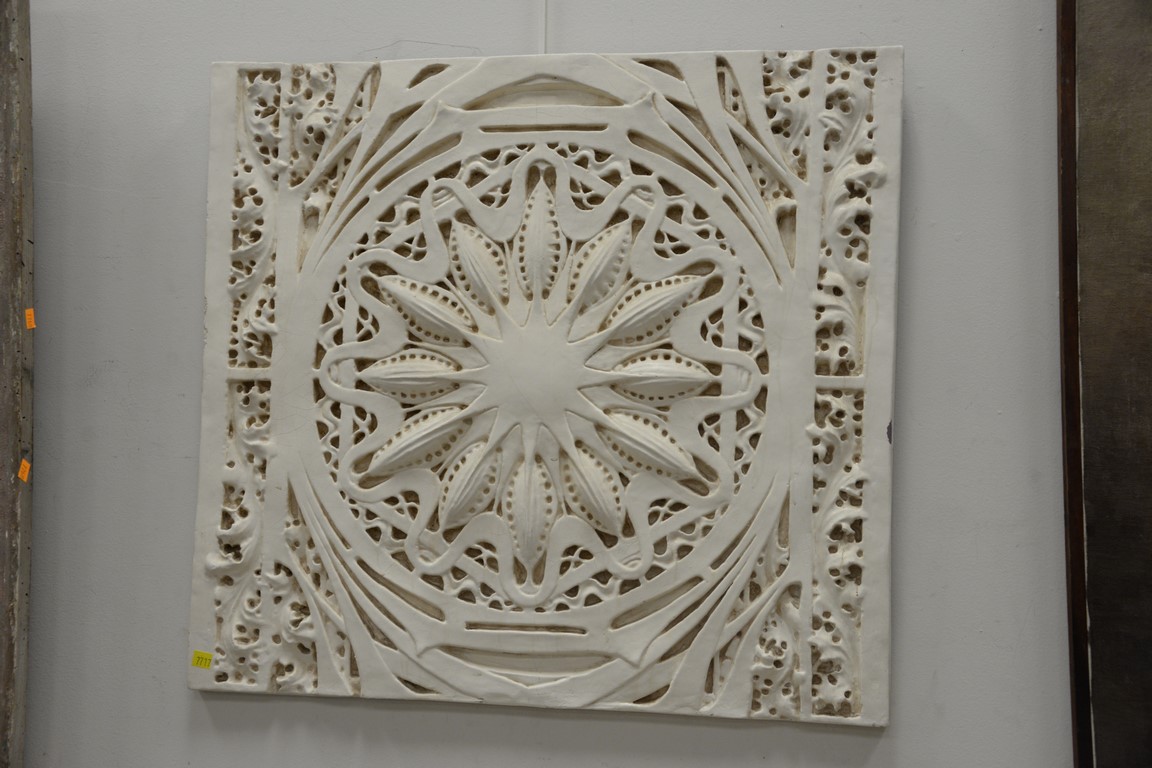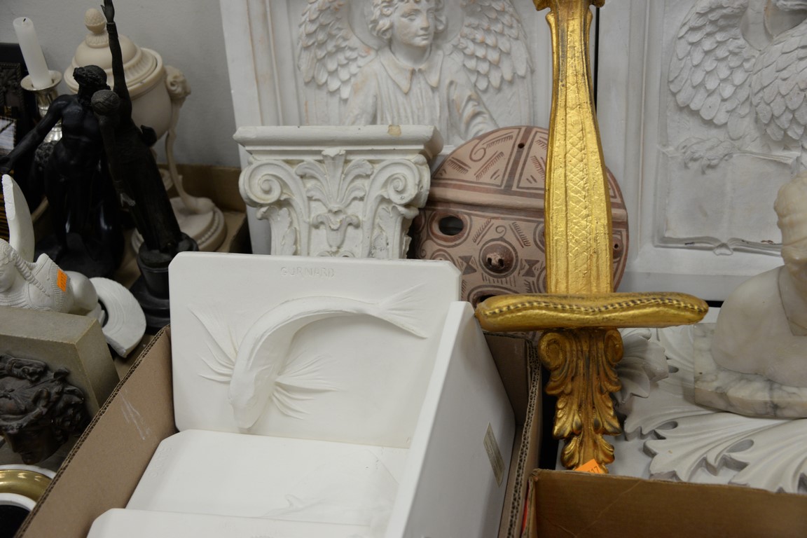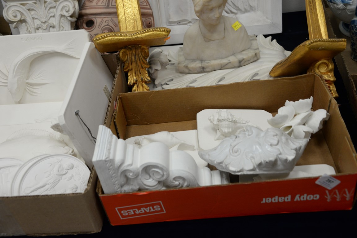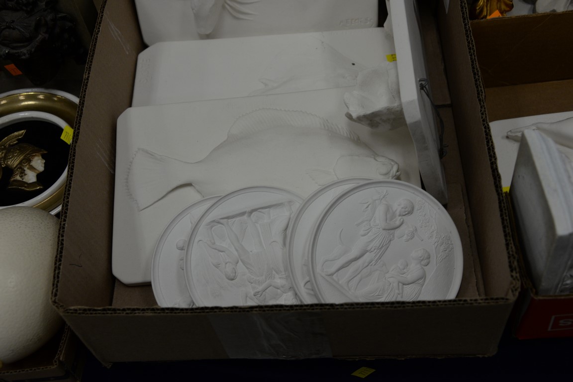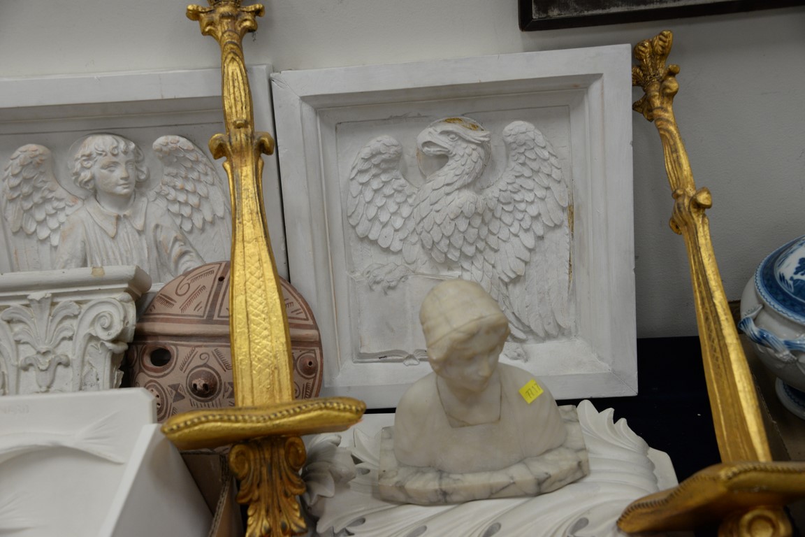 Group of plaster plaques and a marble bust of a woman. ht. 9 in.