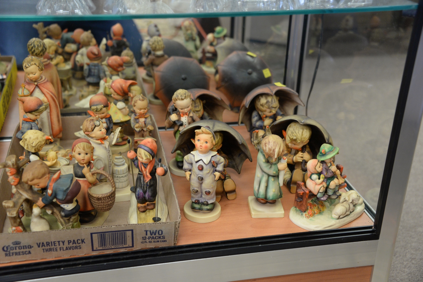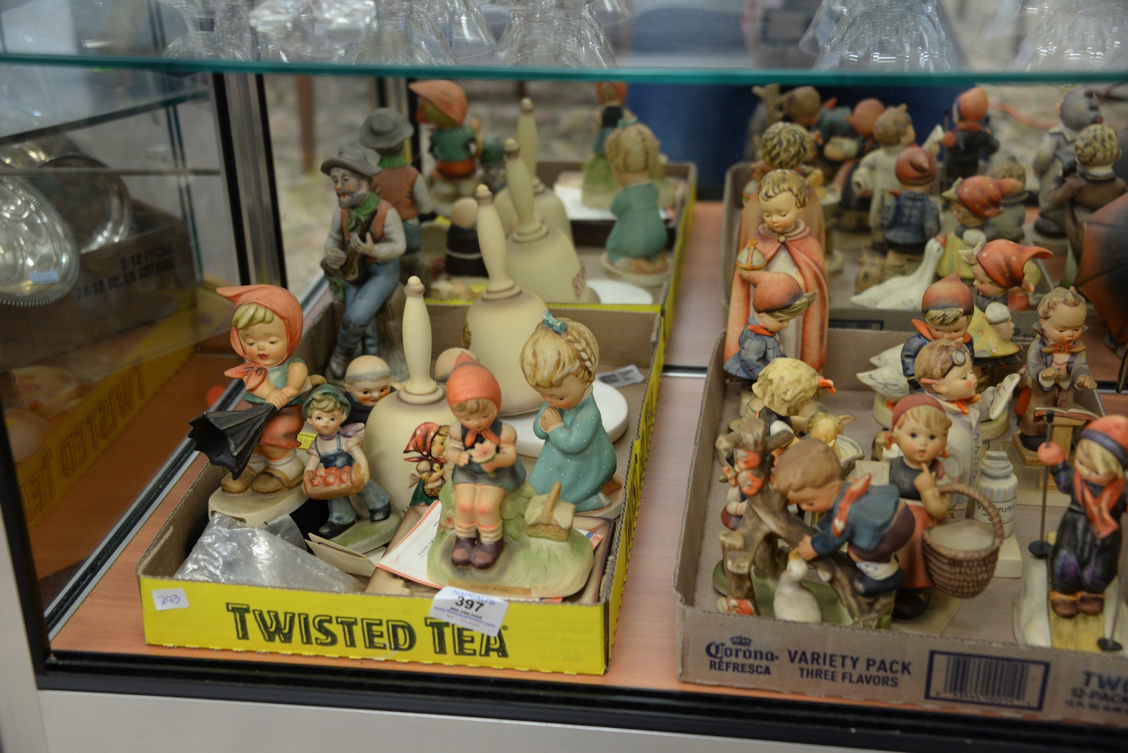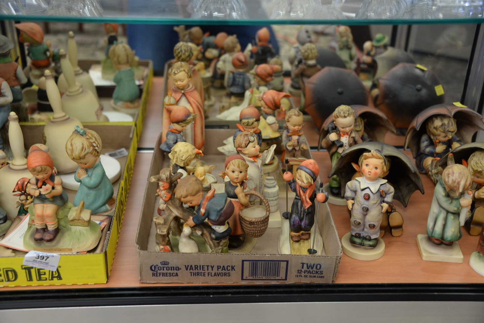Lot 397: Large Group of Various Hummels, along with seven various figures, to include two pairs of umbrella boys and girls, tallest height 7 inches.