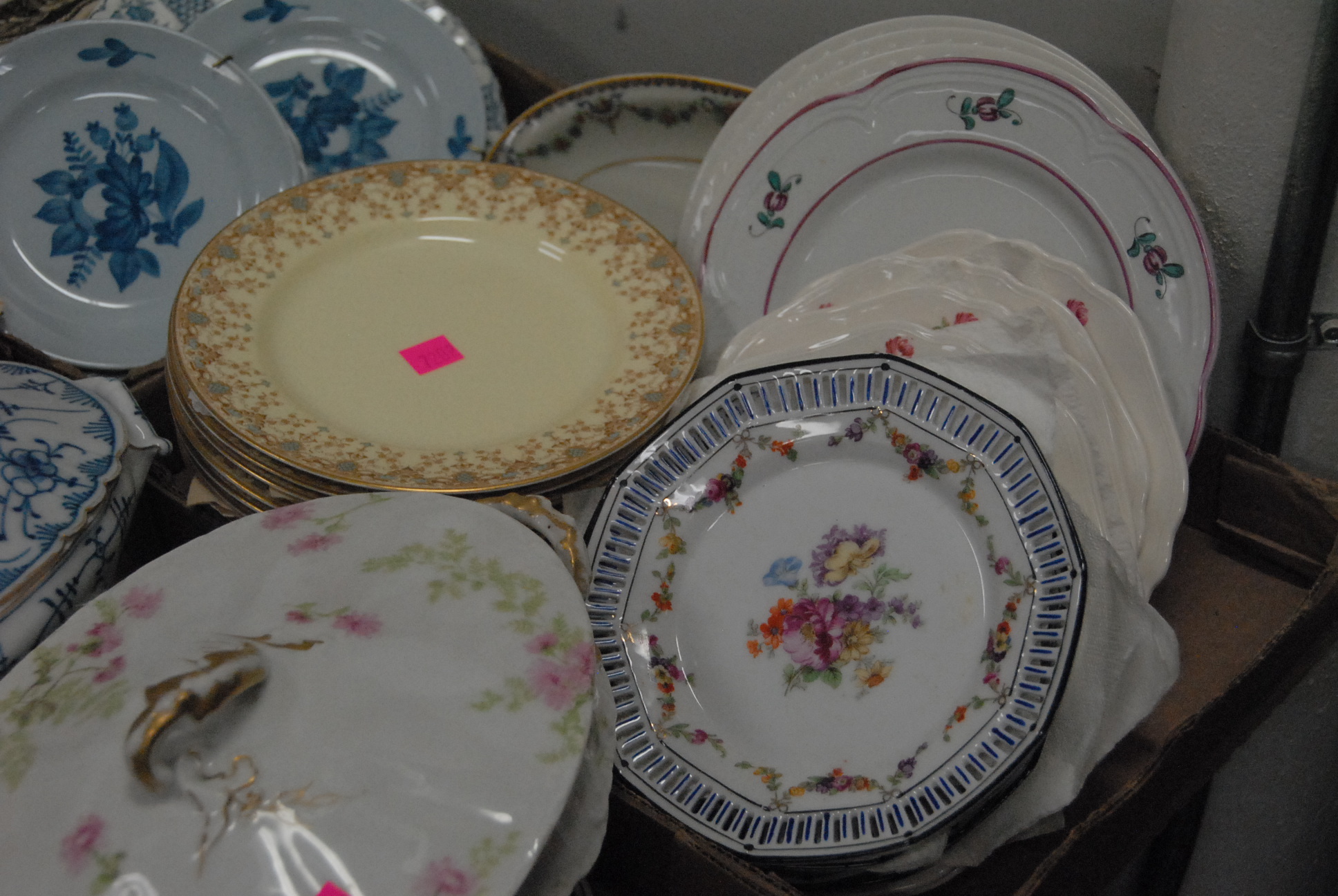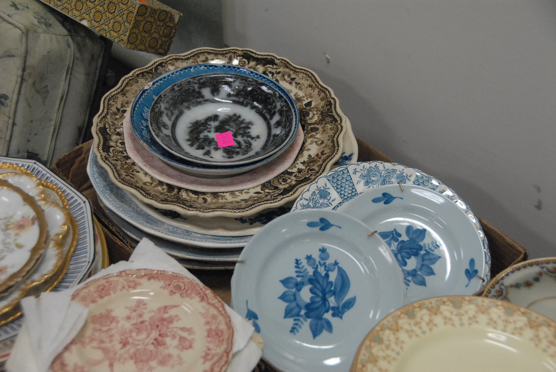 Majolica umbrella stand and six box lots of Staffordshire Mulberry covered vegetable dishes and sets of plates.