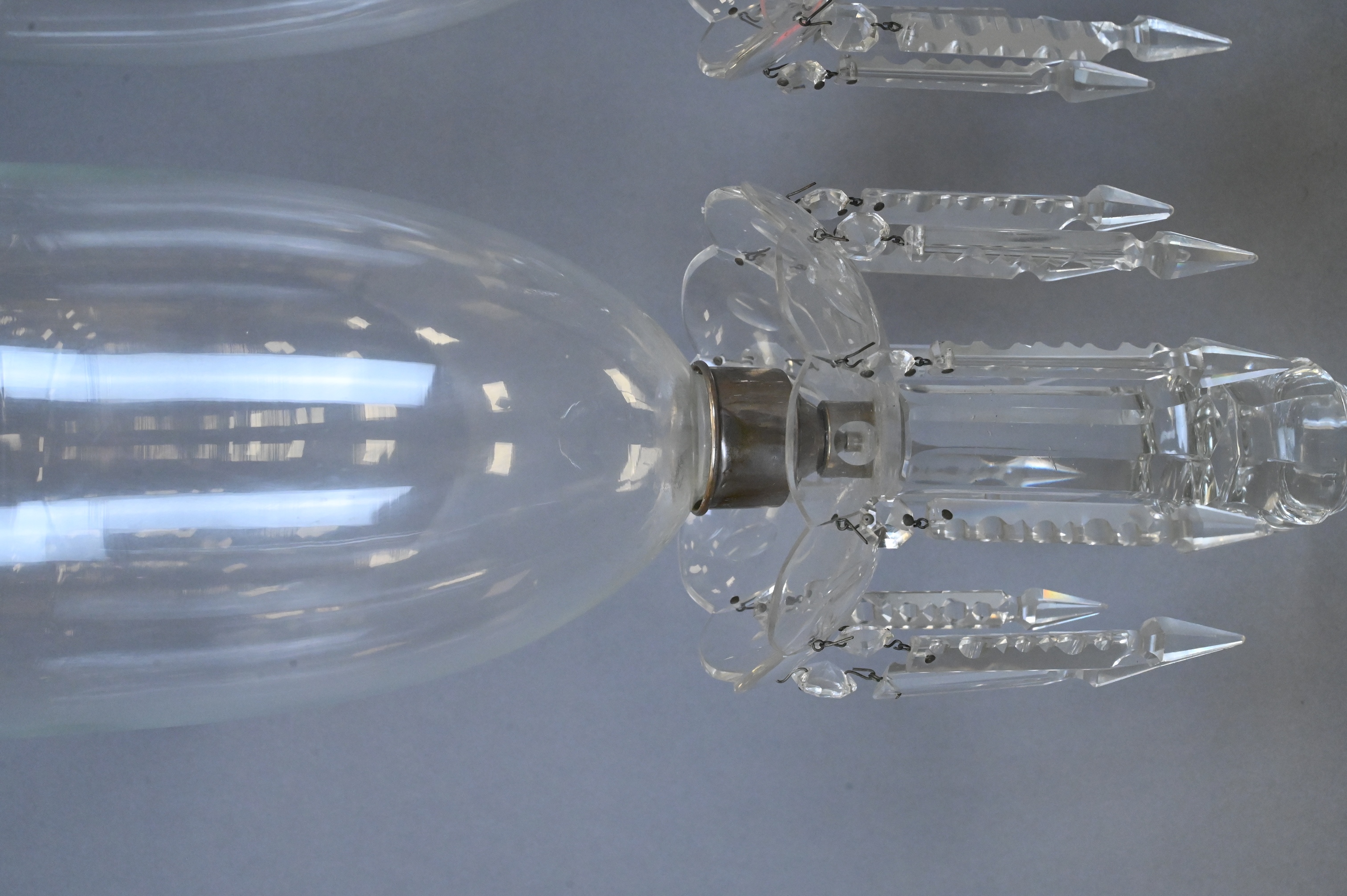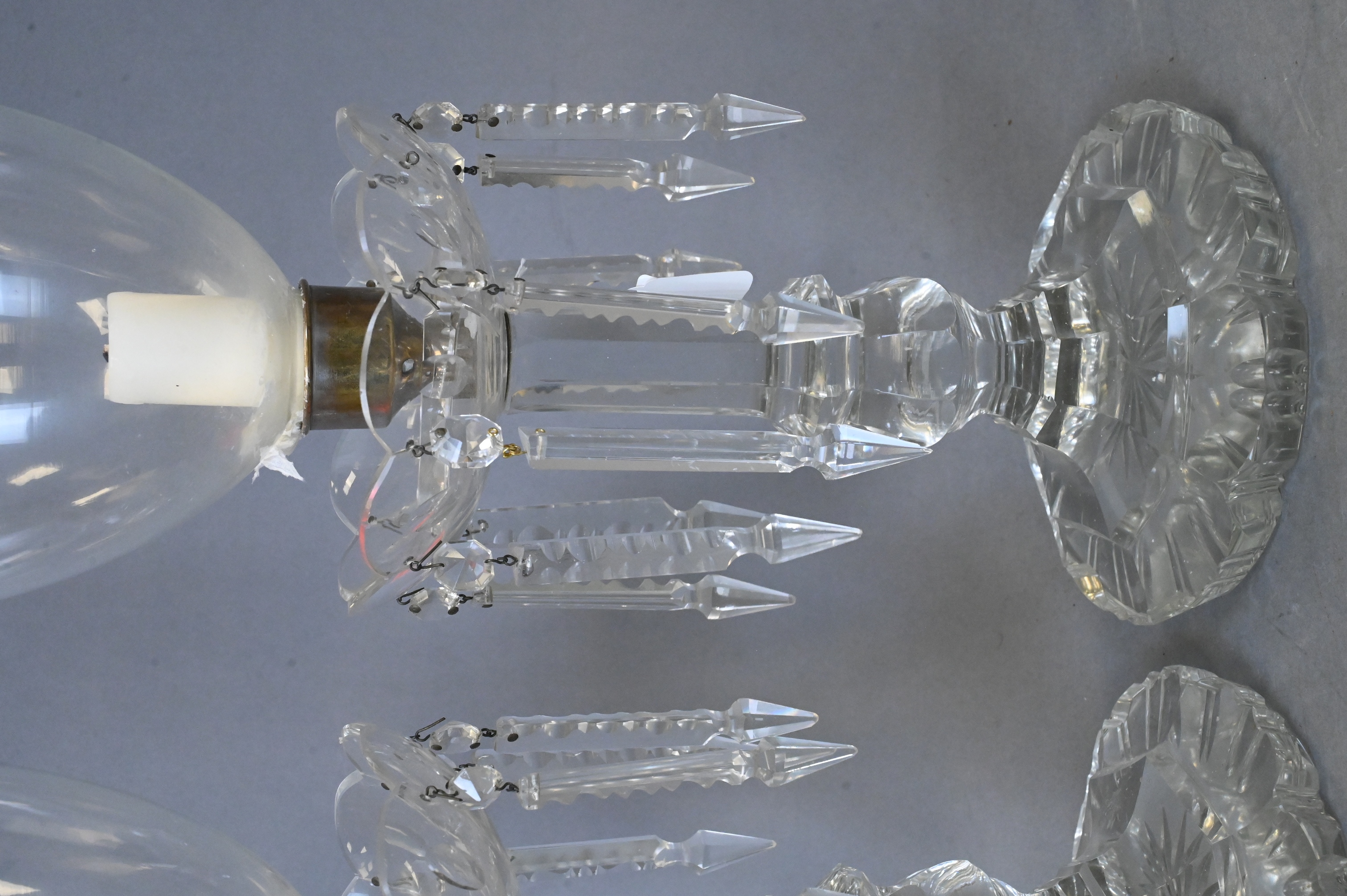 Each with cut and faceted baluster standard supporting a ring hung with cut glass prisms, surmounted by a tall removable hurricane shade. Raised on a scalloped circular base with star-cut decoration