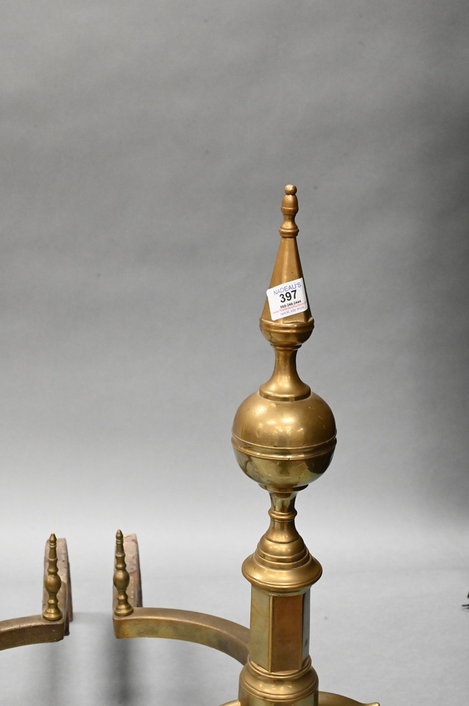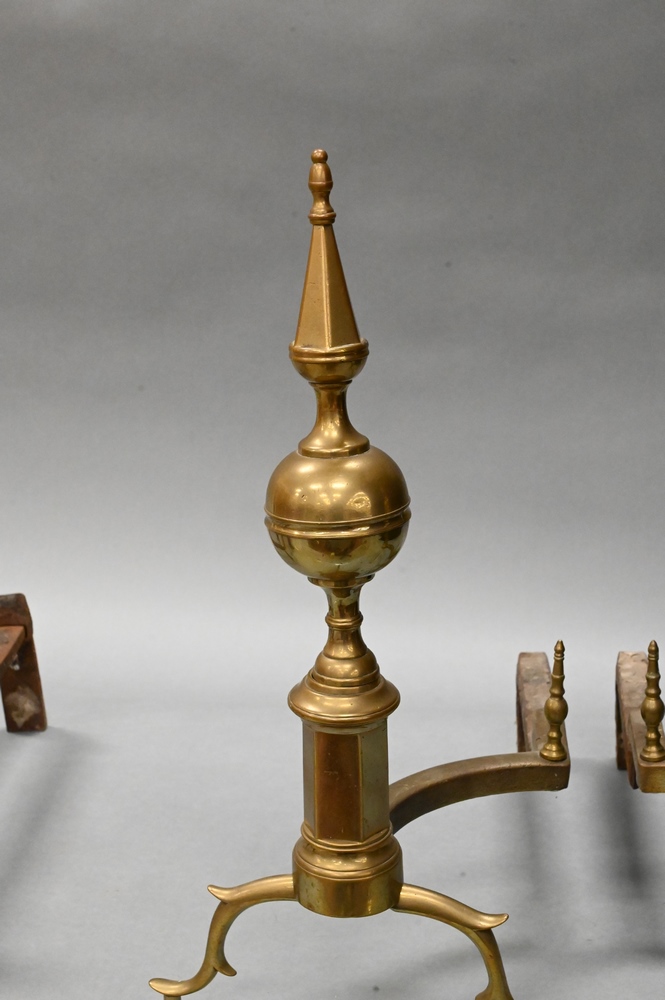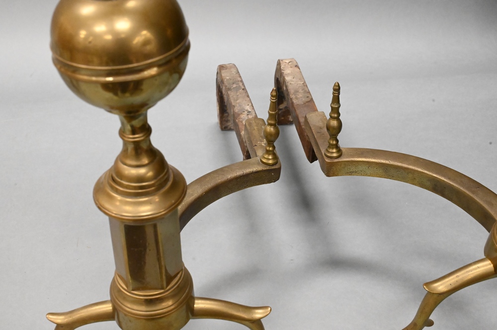 Lot 397: Pair of Federal Brass Steeple Top Andirons, having log stops, signed New York, height 23 1/2 inches.