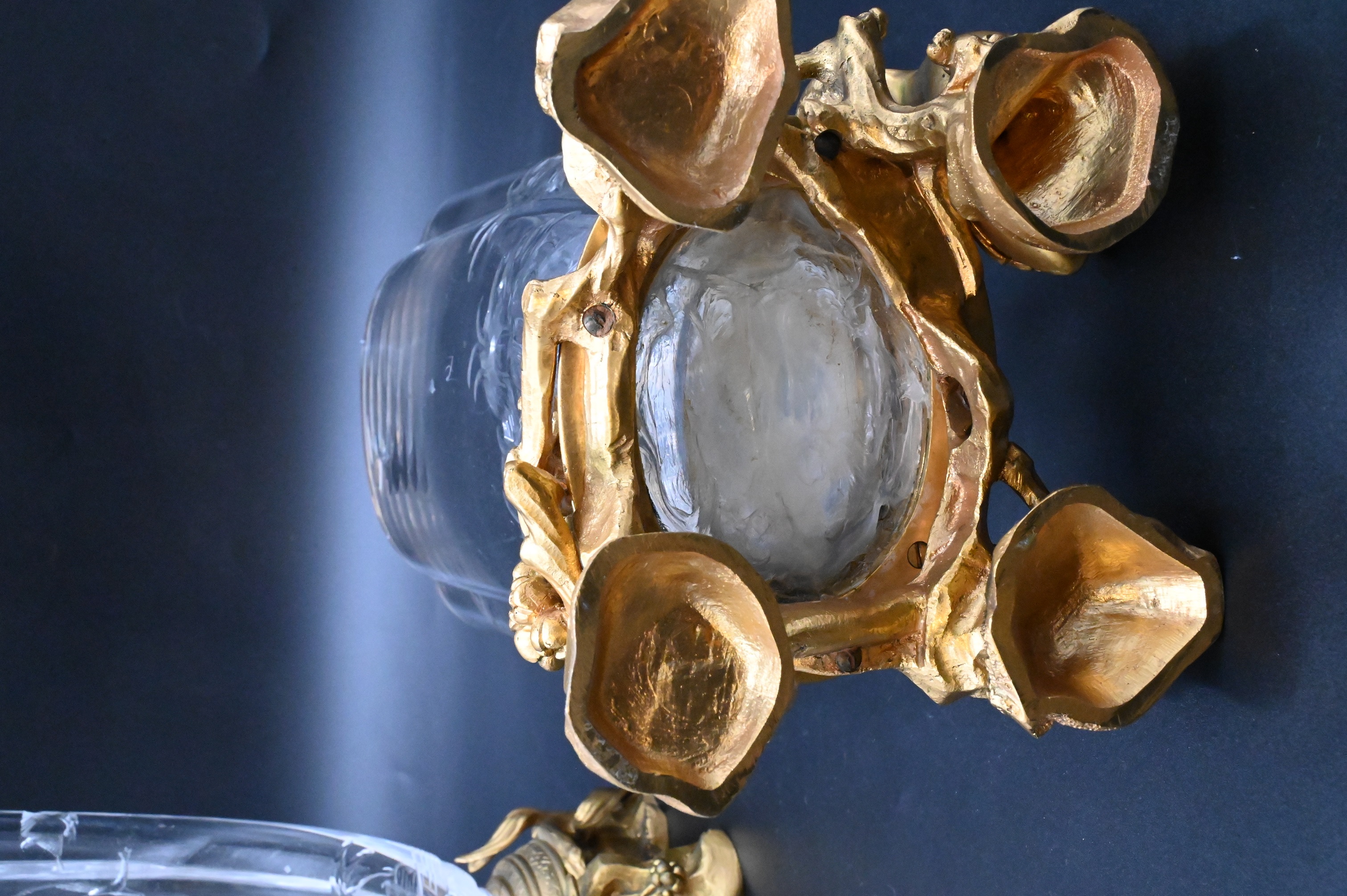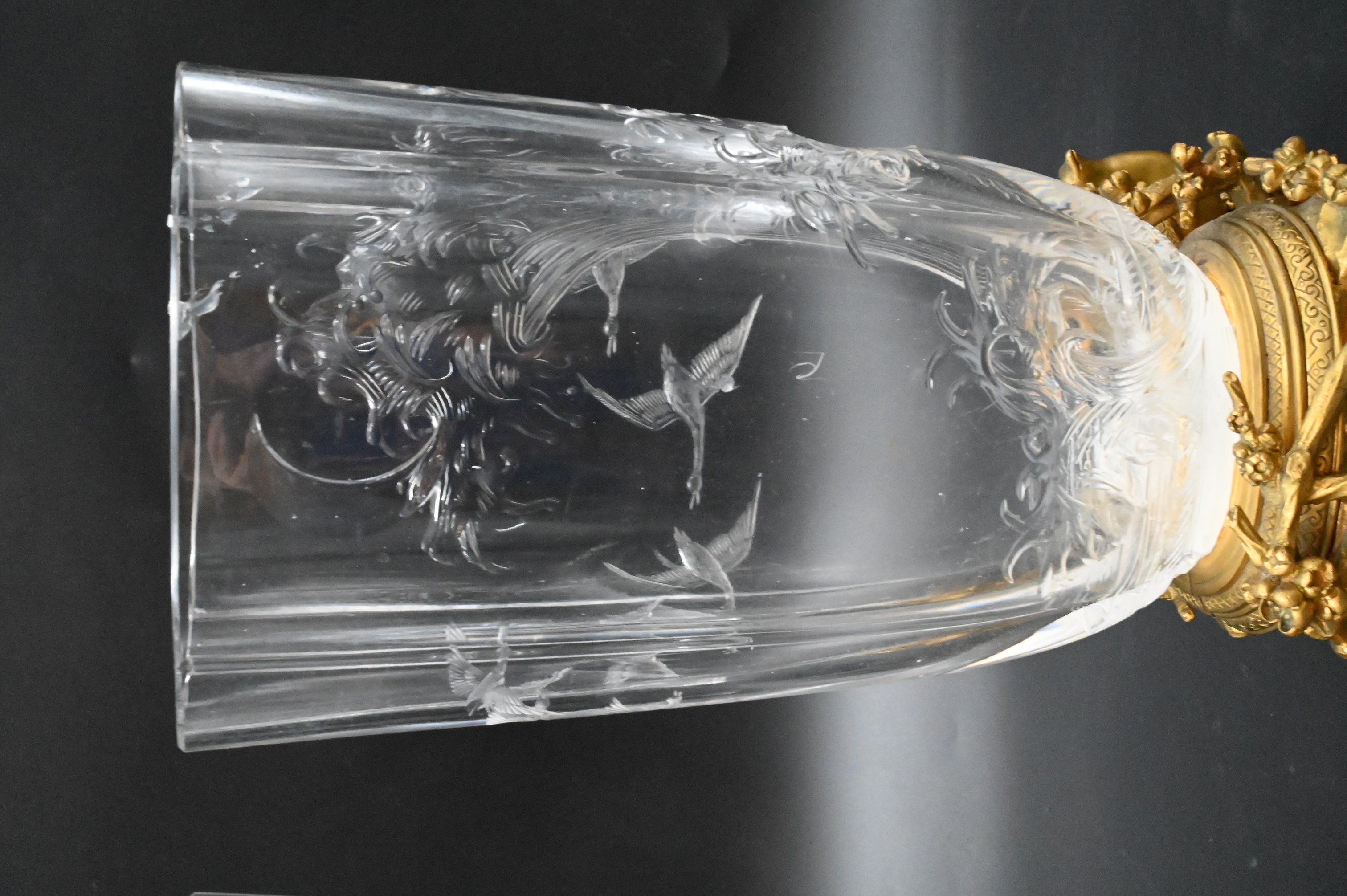 the glass quatrefoil, intaglio, moulded and wheel cut with with crashing waves, insects, and birds in flight, bronze base mount cast relief with rocks, vegetation, and a guinea fowl