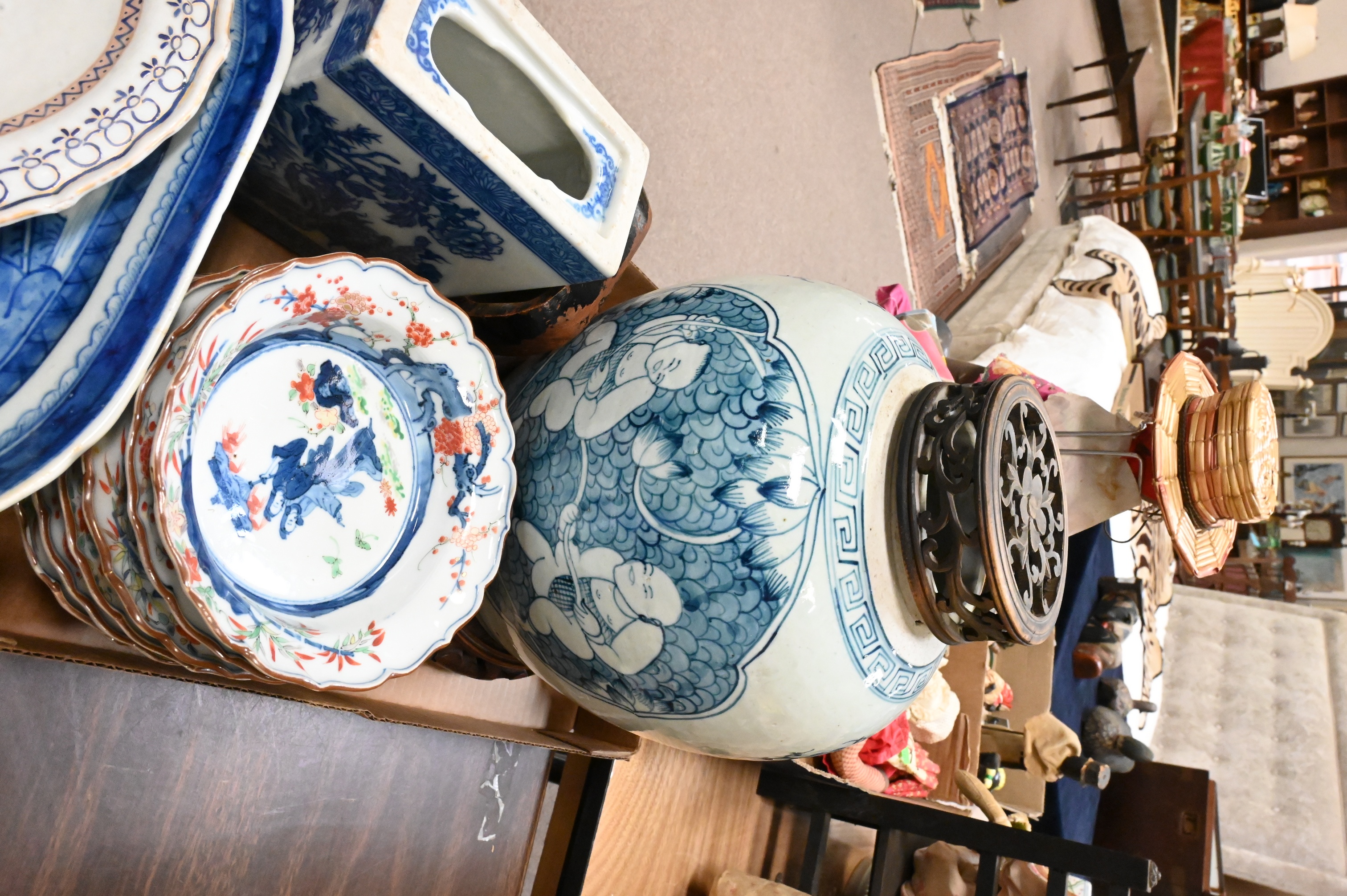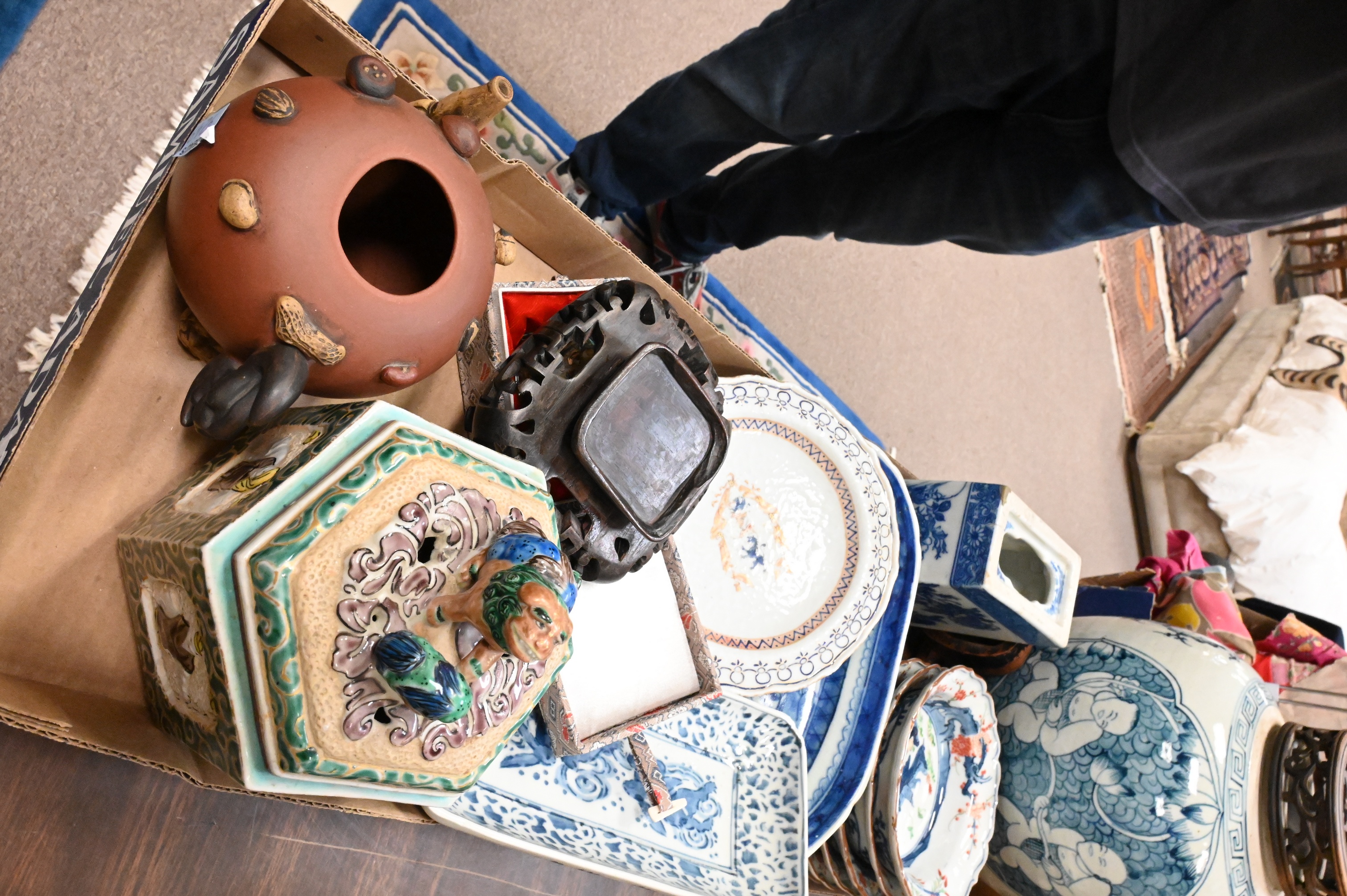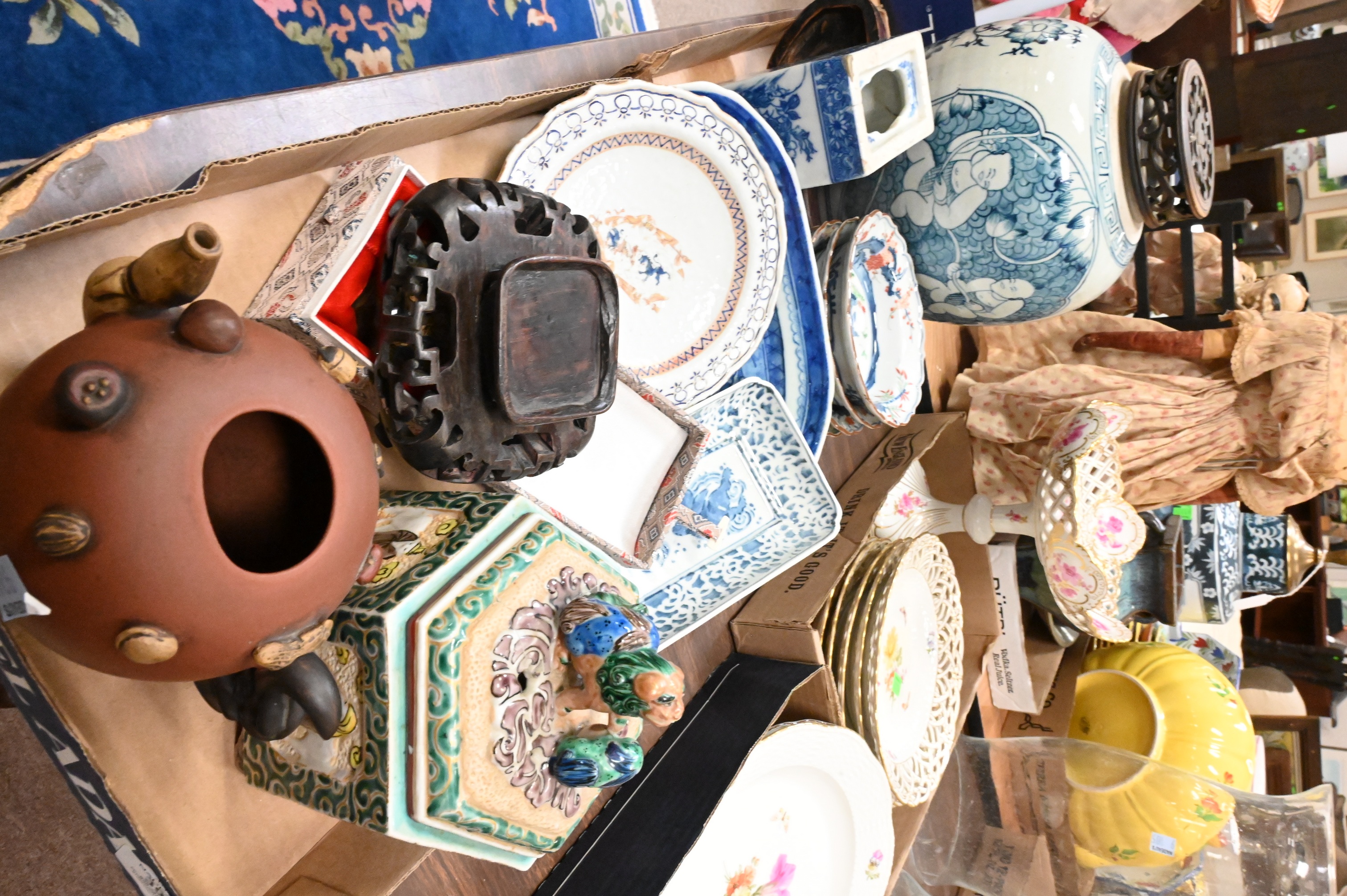 Republic Yixing nut and seed clay teapot (now lacking lid) height 4 inches, enameled ceramic incense burner (repairs to lid) blue and white covered ginger jar with carved wood lid, height 9 3/4 inches, blue and white Canton landscape platter, pierced porcelain brush pot, orange peel glaze armorial plate, snuff bottle depicting a bridge crossing scene on one side and a ship scene on the other side, etc…