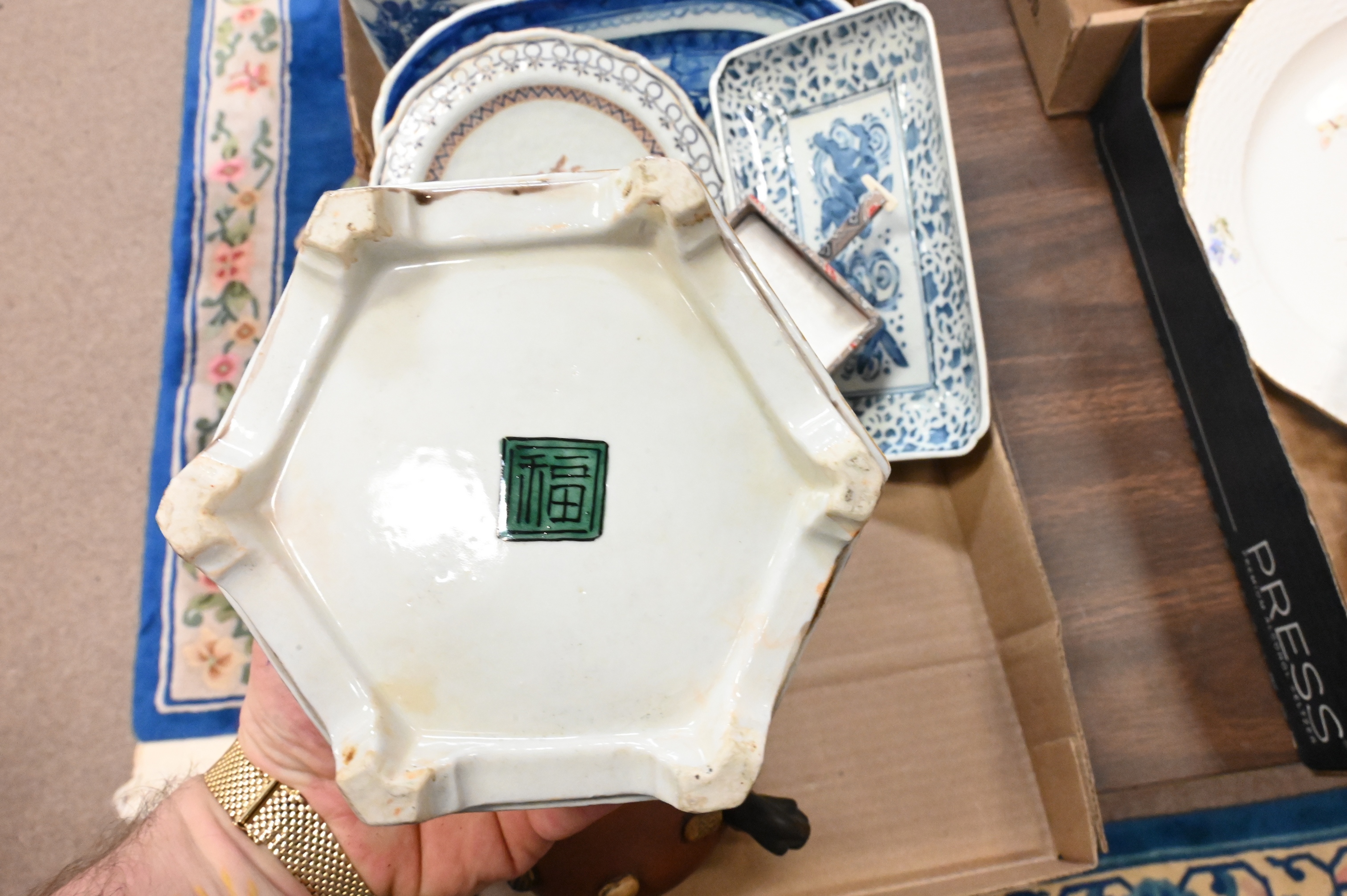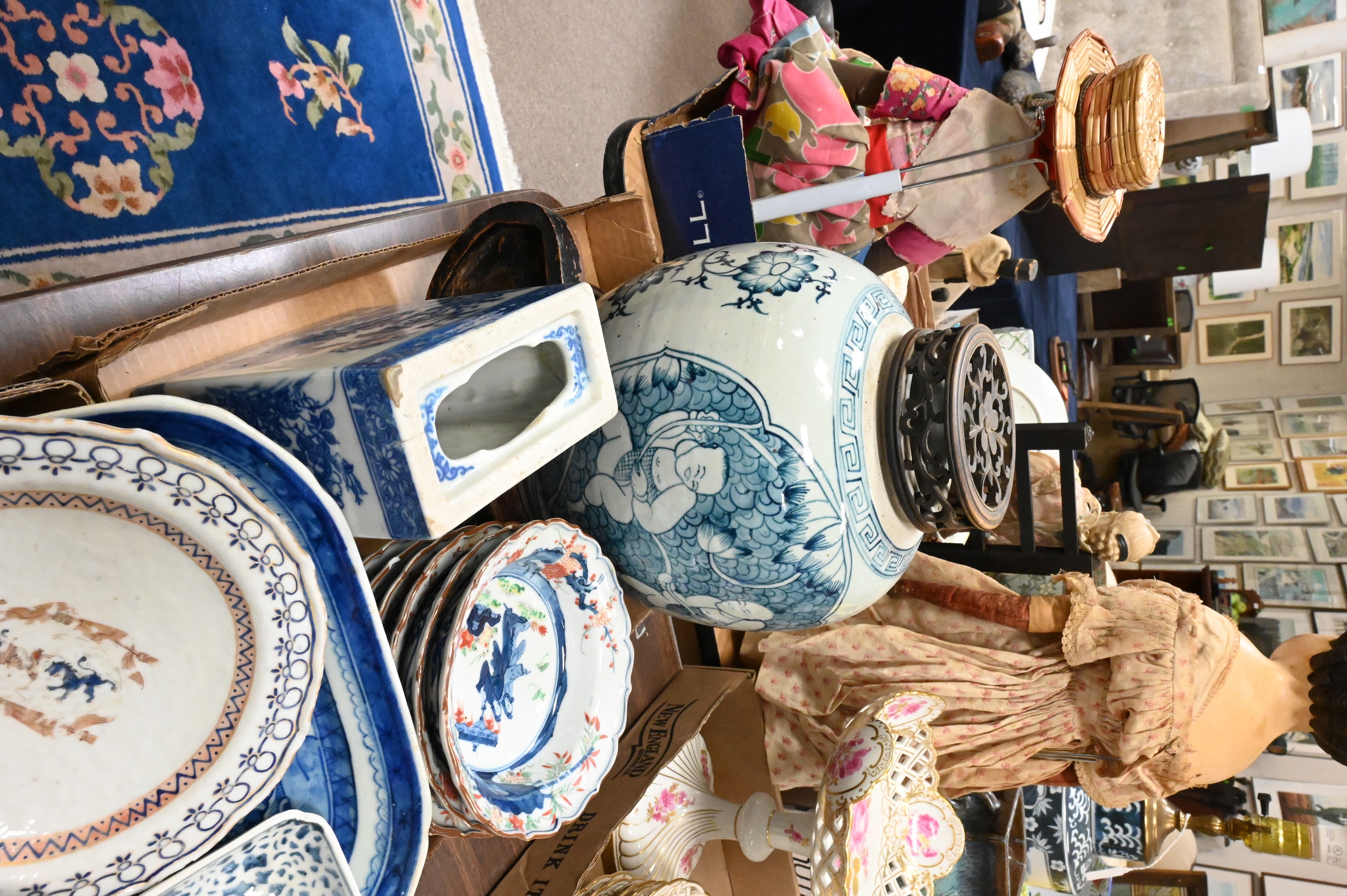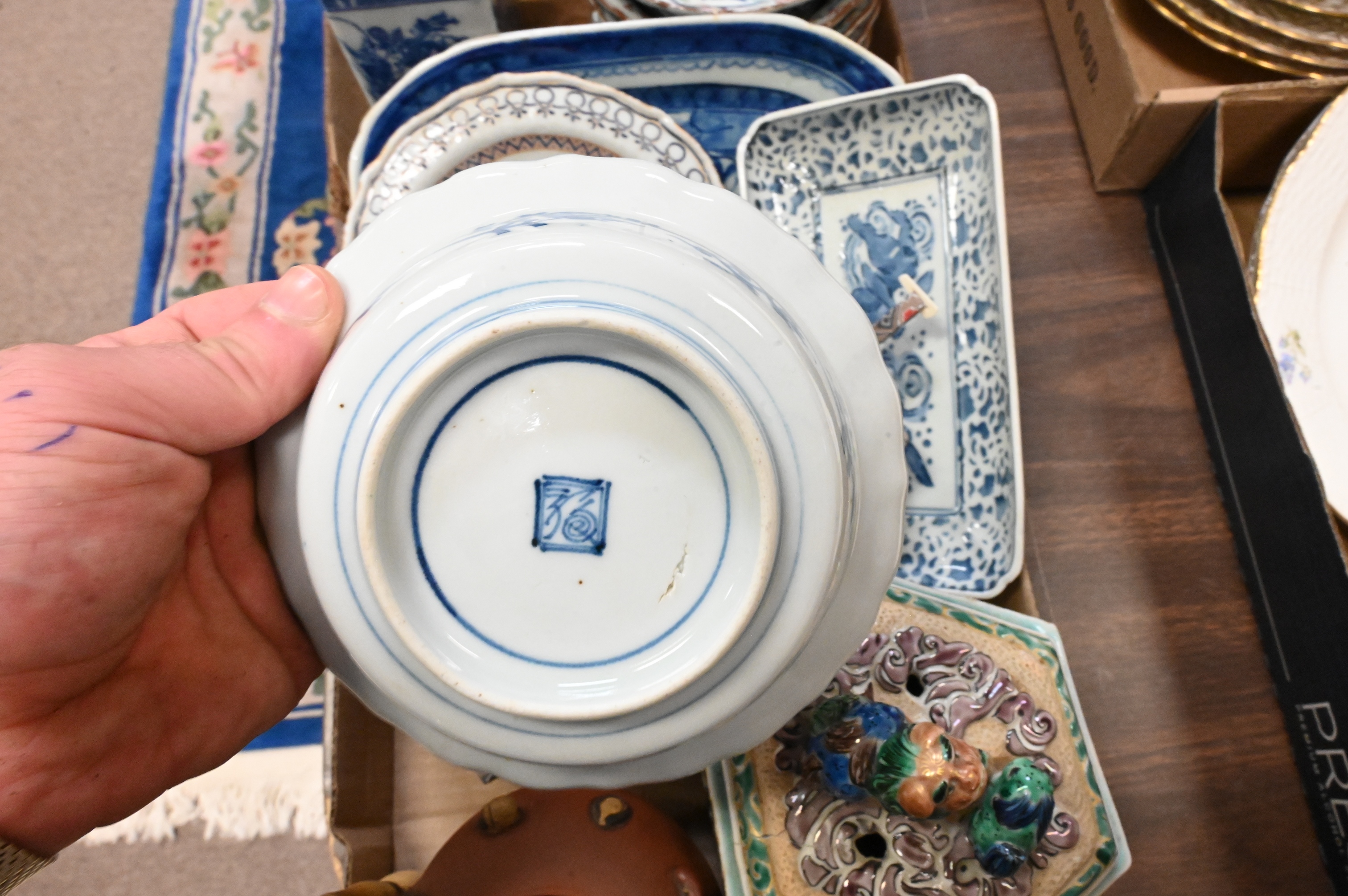 Republic Yixing nut and seed clay teapot (now lacking lid) height 4 inches, enameled ceramic incense burner (repairs to lid) blue and white covered ginger jar with carved wood lid, height 9 3/4 inches, blue and white Canton landscape platter, pierced porcelain brush pot, orange peel glaze armorial plate, snuff bottle depicting a bridge crossing scene on one side and a ship scene on the other side, etc…