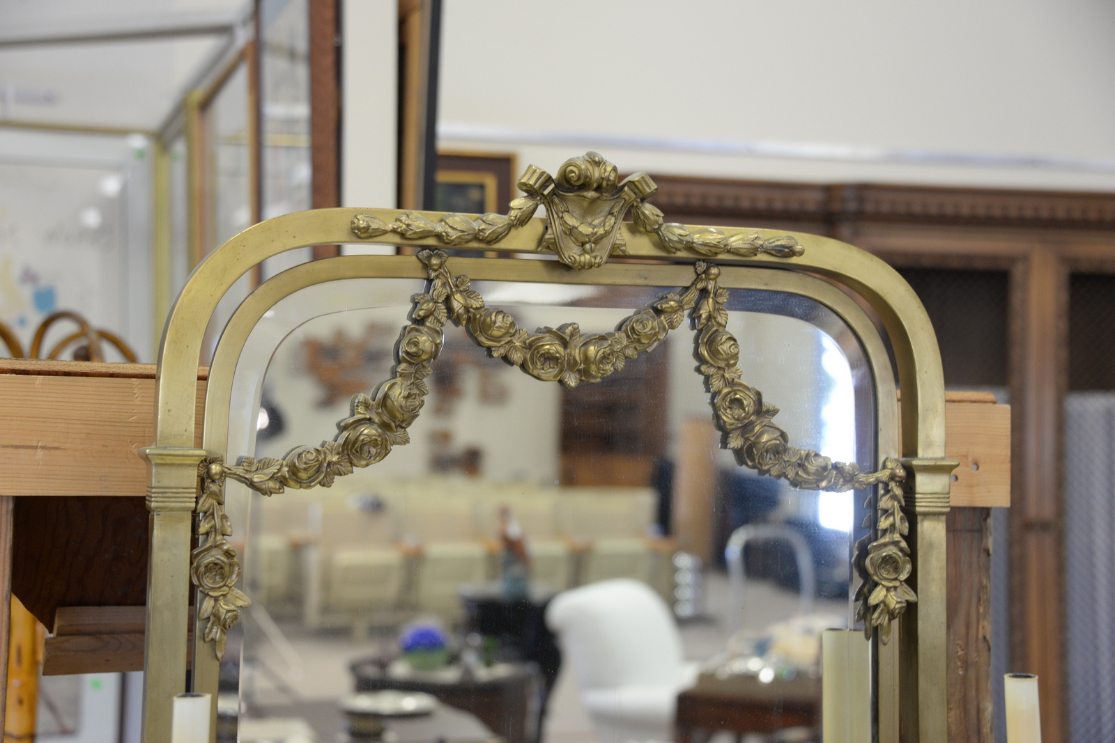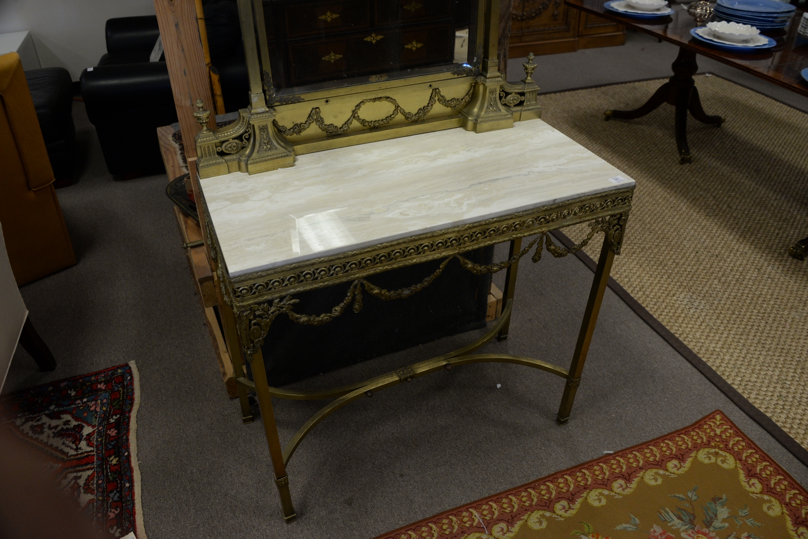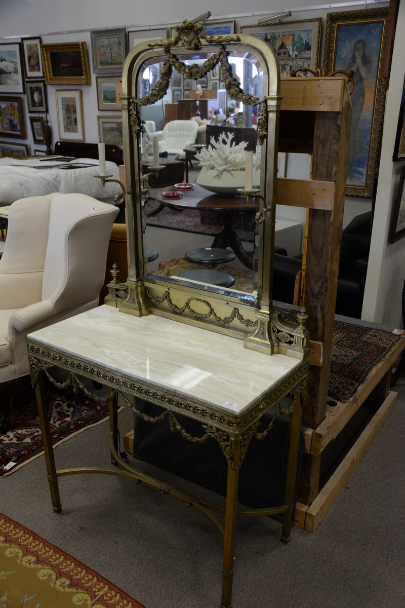 Lot 397: Victorian brass vanity and mirror with candle sconces and marble top. ht. 32in., wd. 36in., dp. 18in., total ht. 73in.