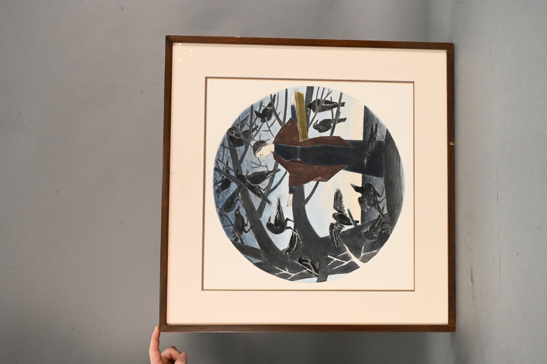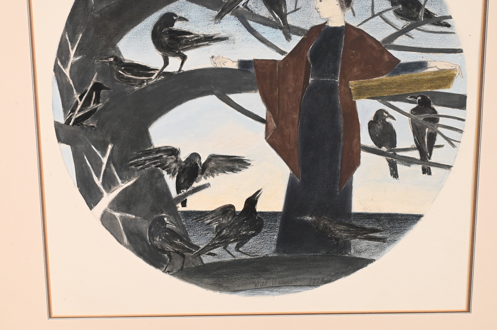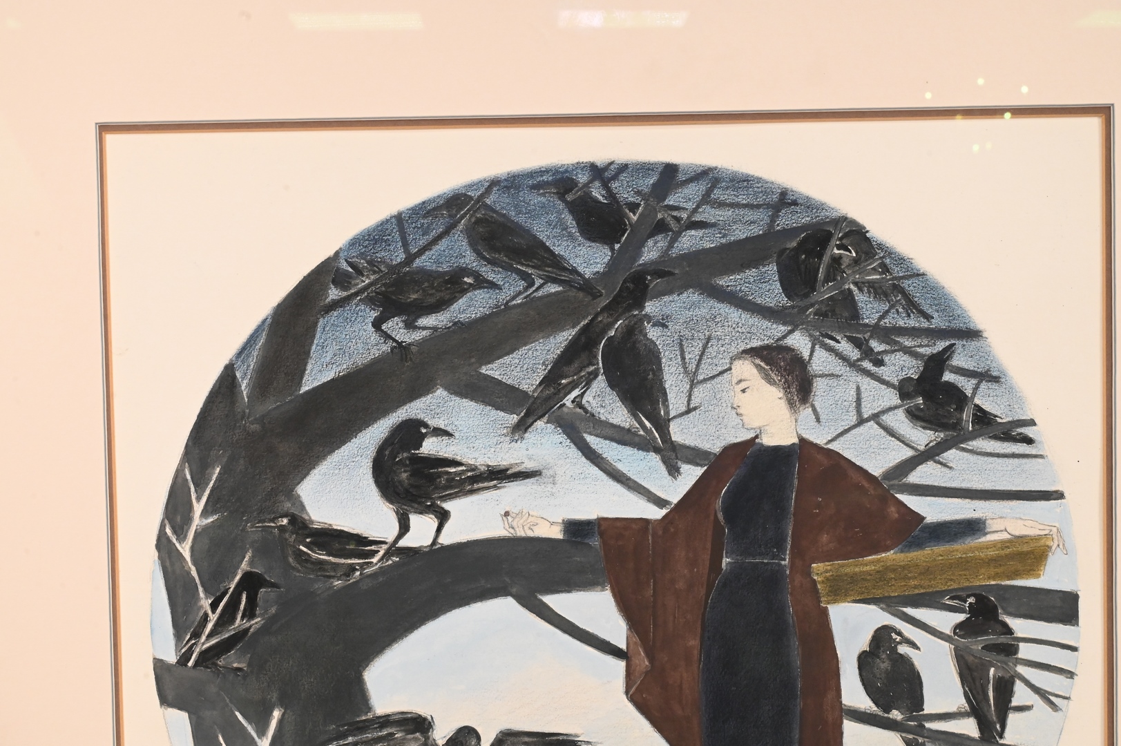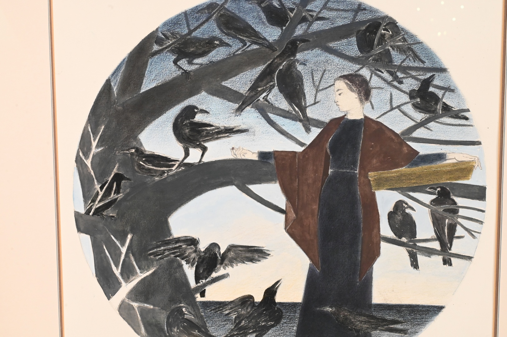 depicting Ariadne leaning against branch with black birds