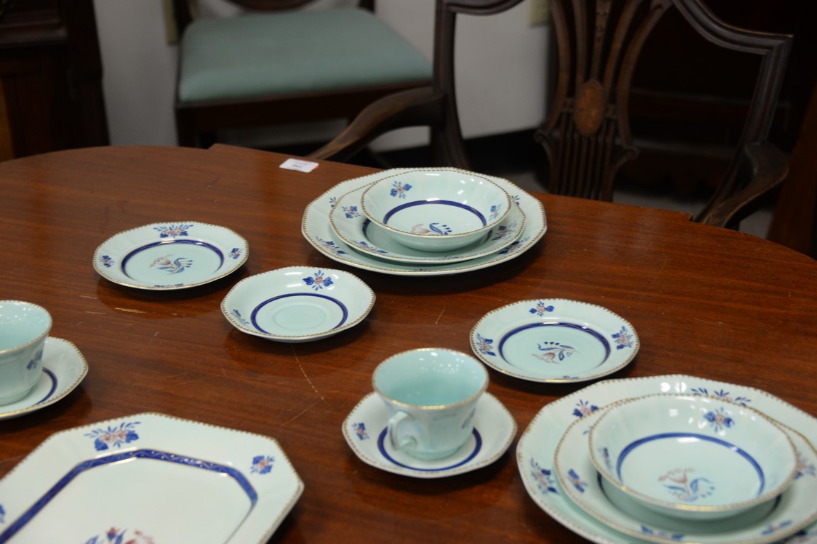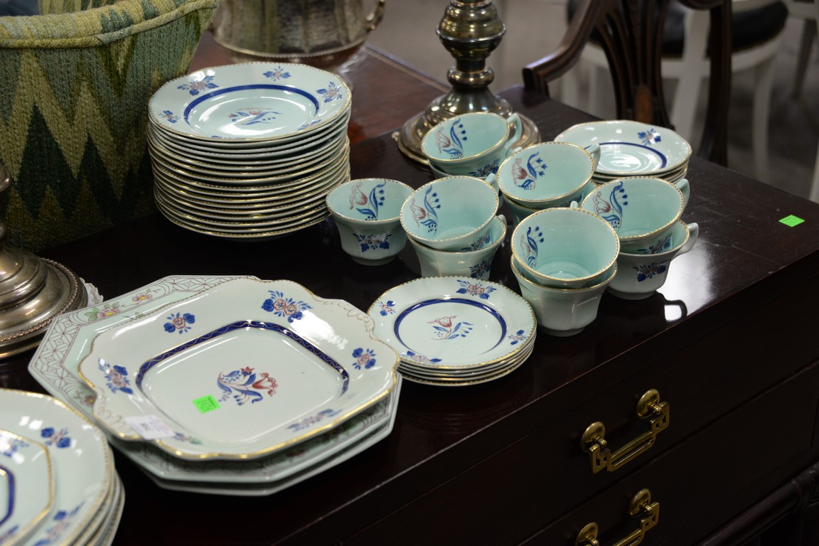 Lot 398: Adams England china set, Calyx Ware to include Singapore Bird pattern serving trays, service for 11.