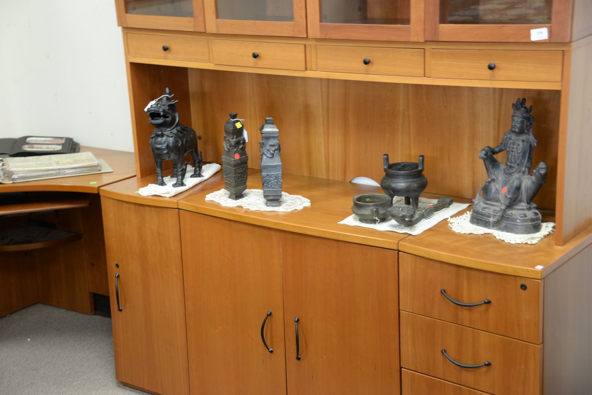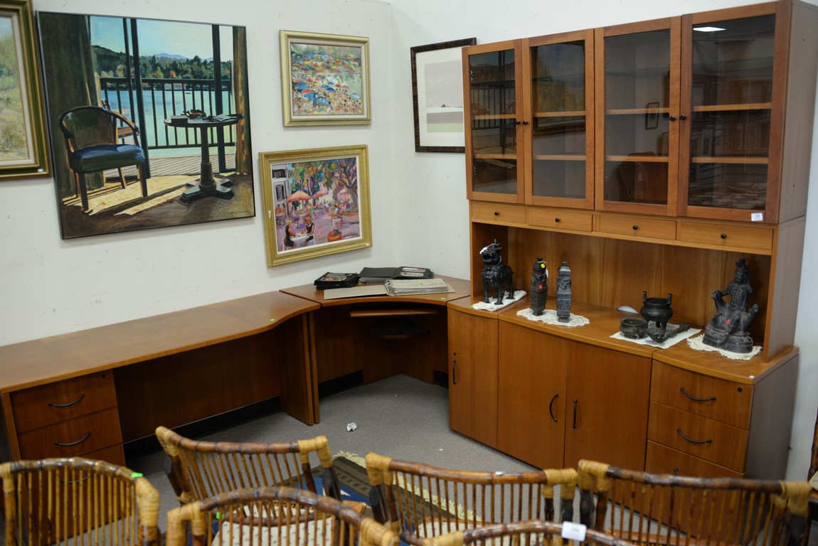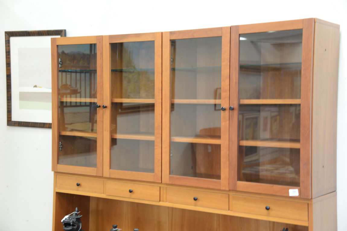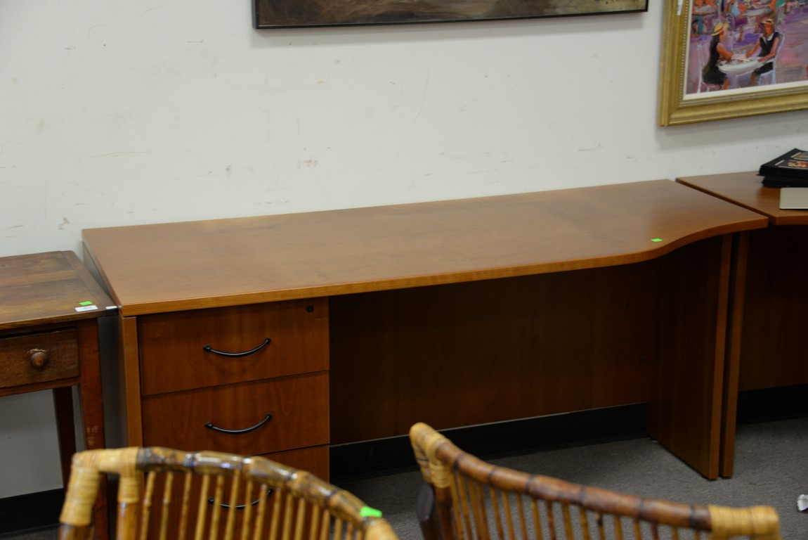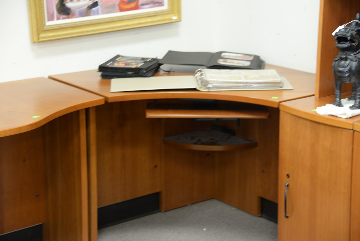 Lot 398: Cherry desk/credenza unit, eight parts including file cabinet, corner desk, cabinets, and drawers. ht. 80 in. both sides 98 inches …