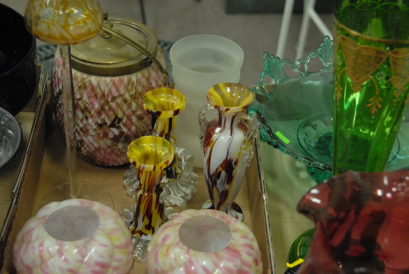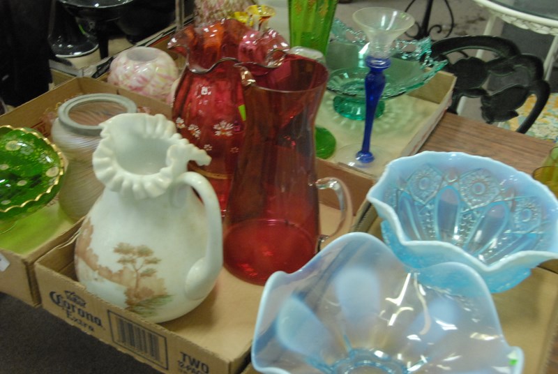 Five box lots to include two cranberry pitchers, art glass, art glass cracker jar, and dishes.