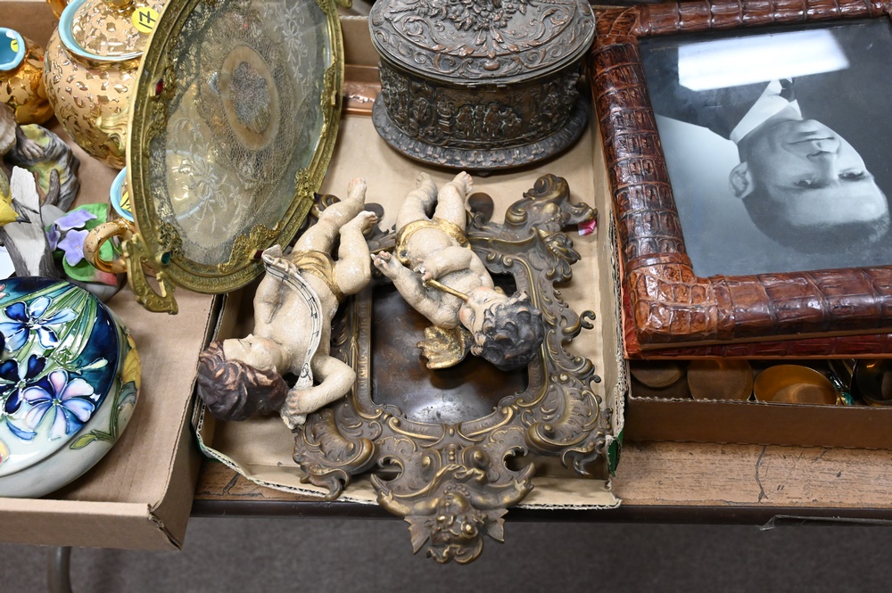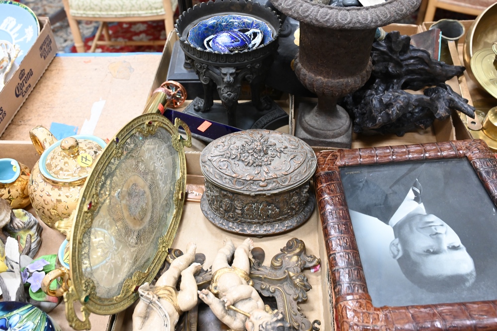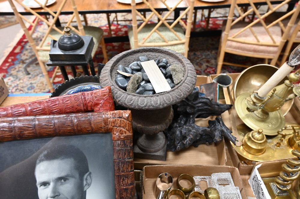Four Tray Lots of Metal and Brass Items, napkin rings, iron urn, bronze frame, copper box, etc.