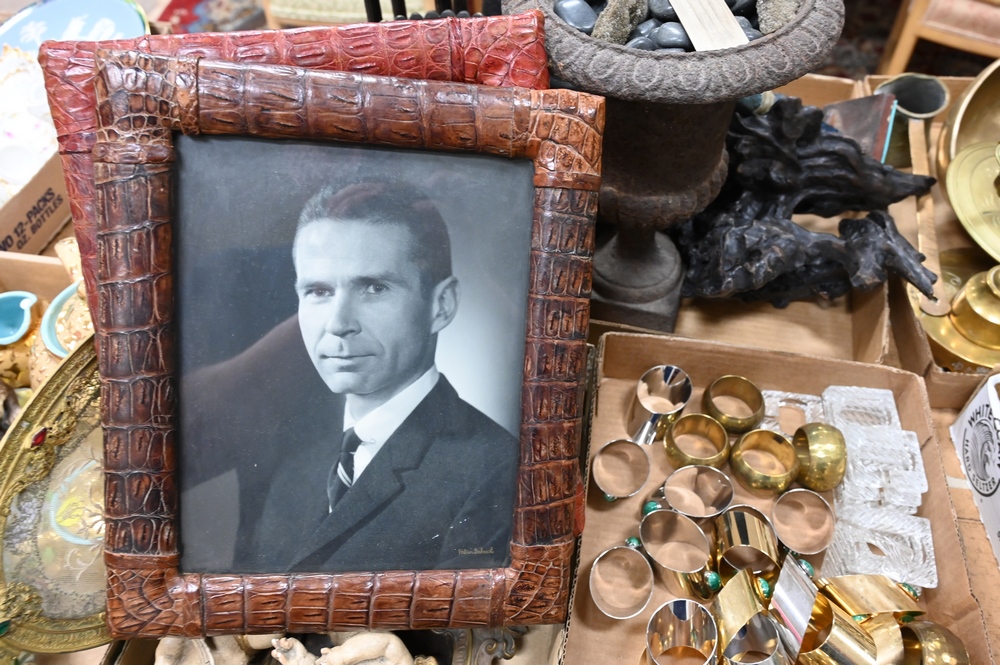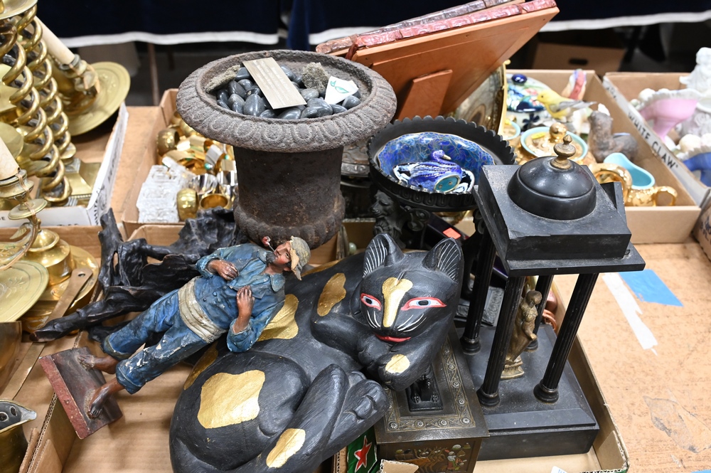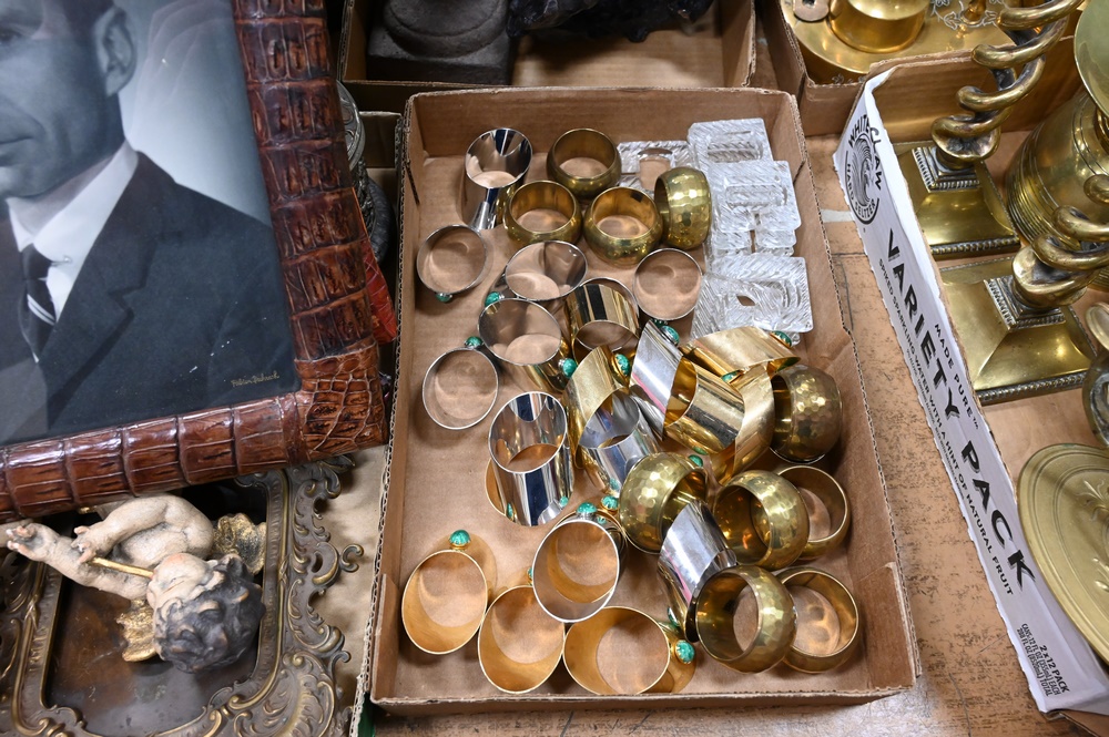 Lot 398: Four Tray Lots of Metal and Brass Items, napkin rings, iron urn, bronze frame, copper box, etc.