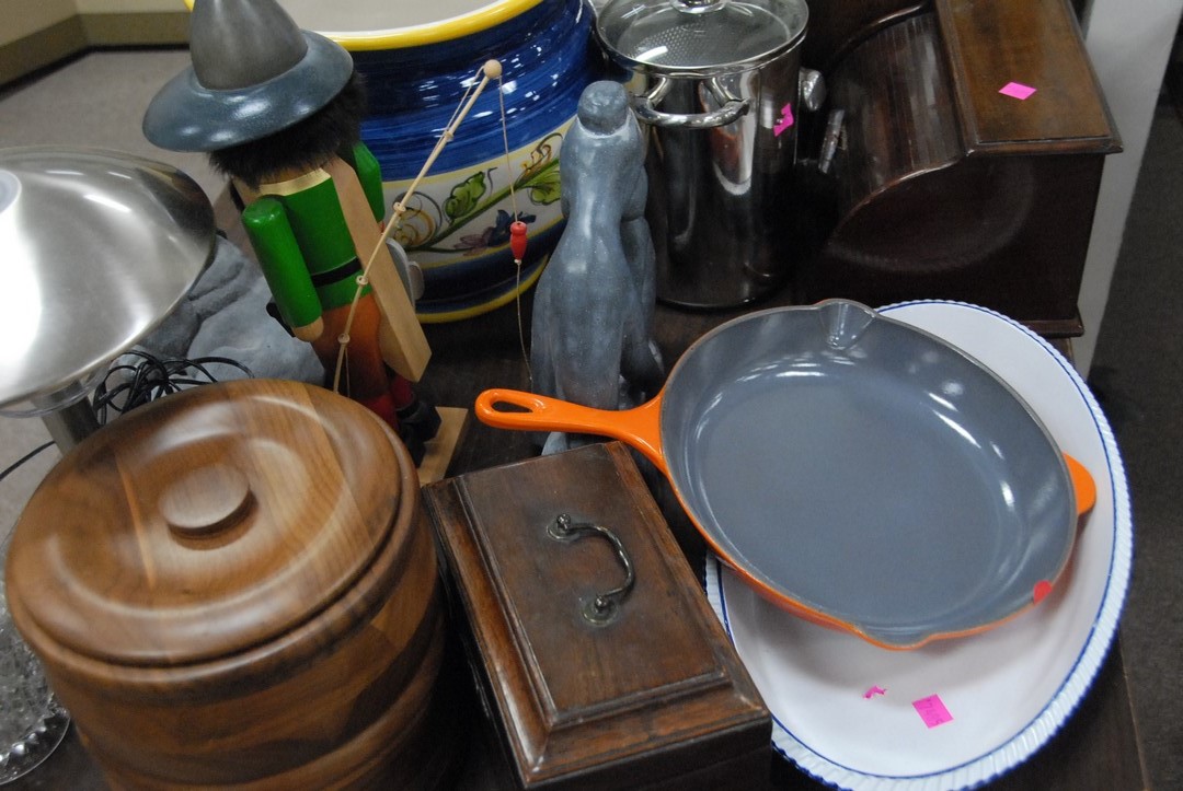 Four Winton Armetale Reggae pewter, Le Creuset France pan, and Dansk bowl.