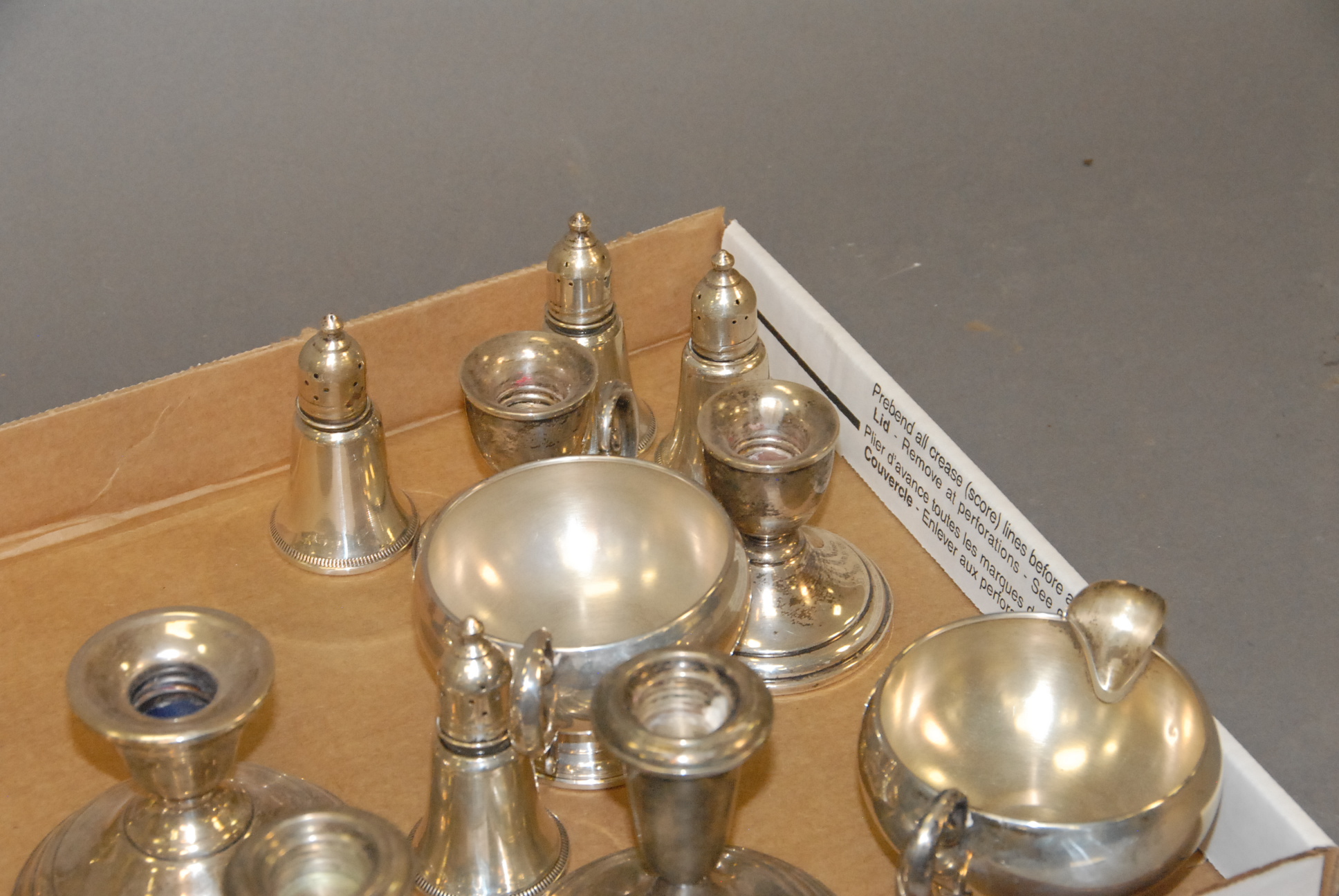 Group of eight weighted candlesticks, four sterling weighted salt and peppers, and weighted creamer and sugar.