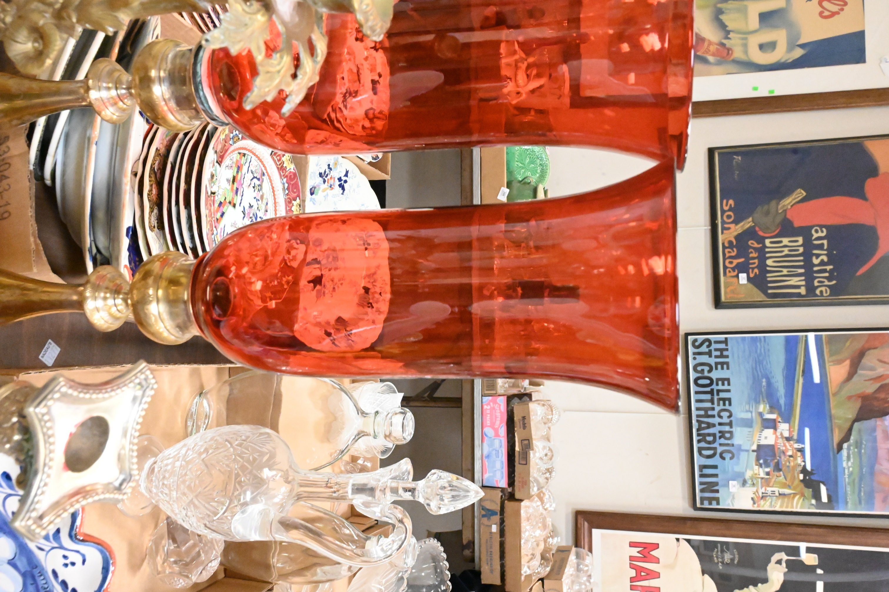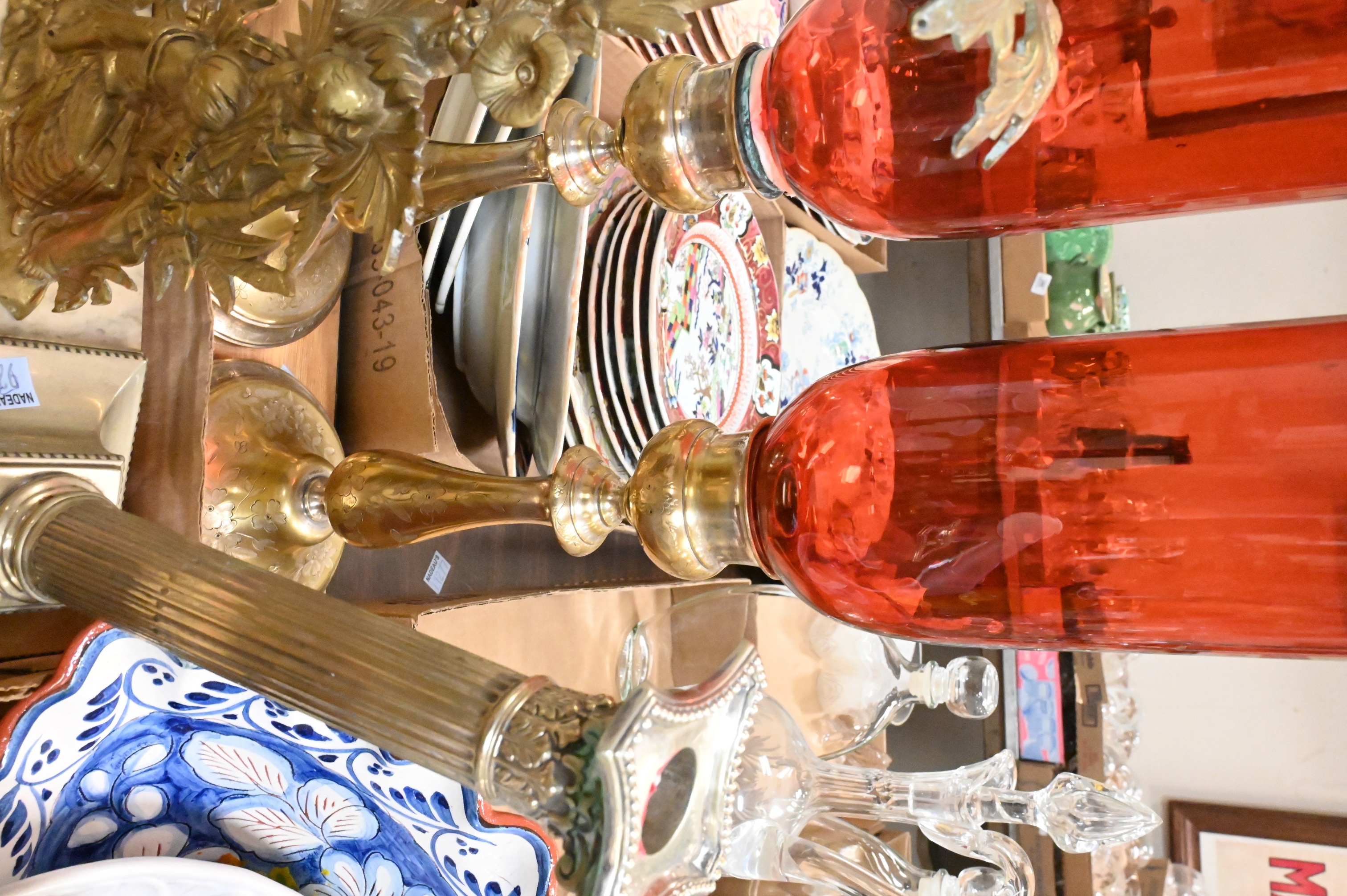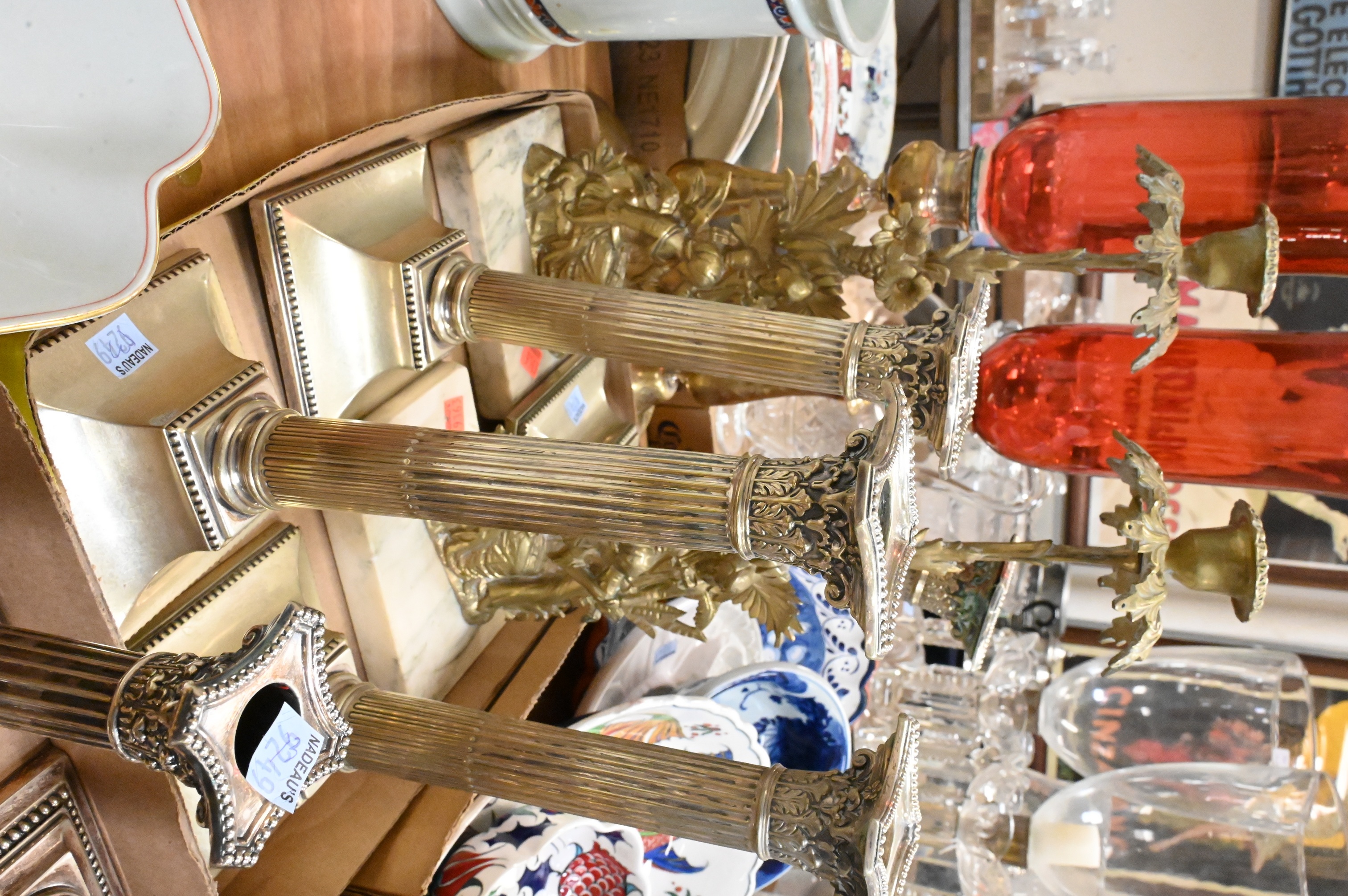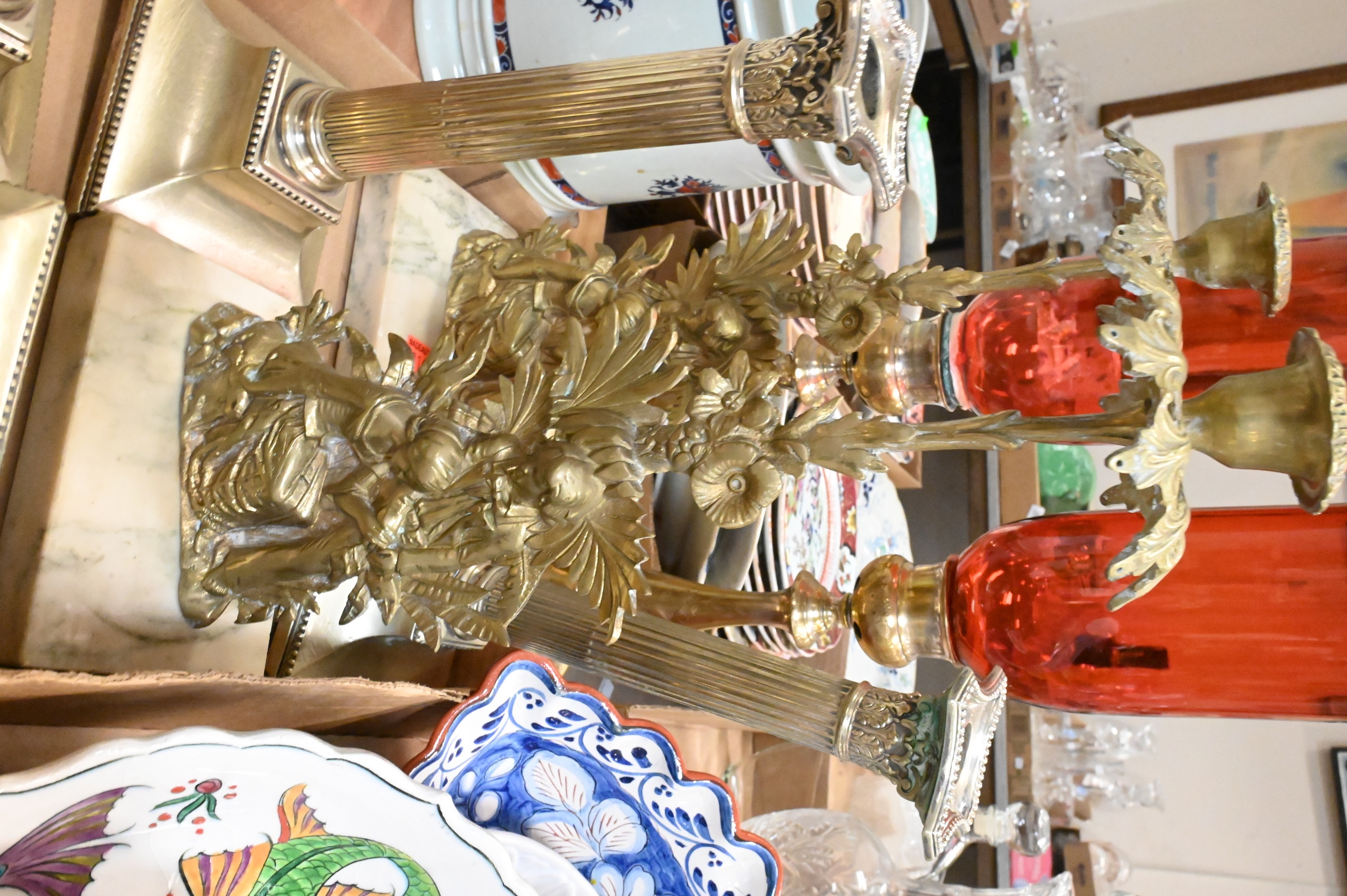 four fluted Gorham corinthian column form candlesticks, four taller column form candlesticks, height 11 inches, one repousse, pair of American gilt brass “Paul et Virginie” candlesticks (now lacking prisms) claw footed brass candlesticks along with pair of brass candlesticks having cranberry glass hurricane shade, height 20 inches