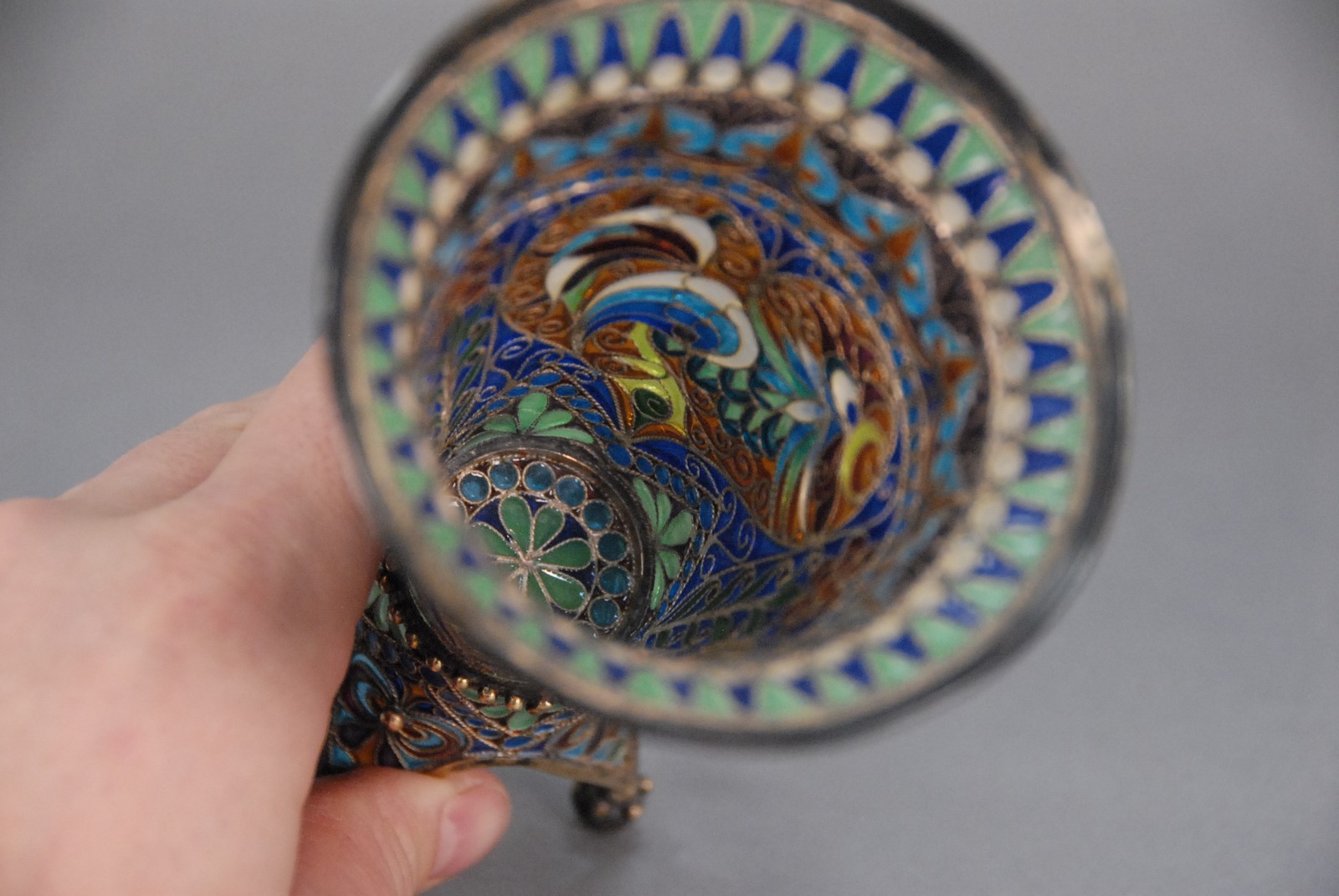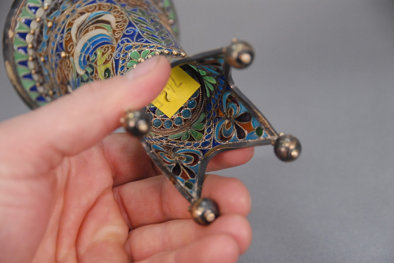 Lot 398: Russian silver plique-a-jour vase having flared rim on round tapering body, three layers of bead work on four legs ending in ball feet with mark of N. 084NHHNK0B6 P. Ovchinni Kov 1905-10. ht. 7 in.