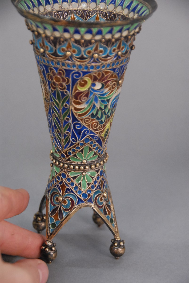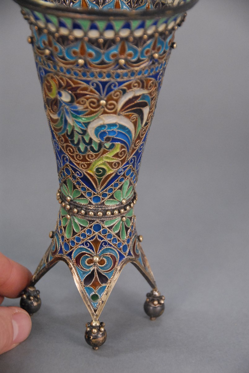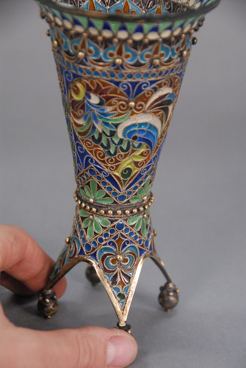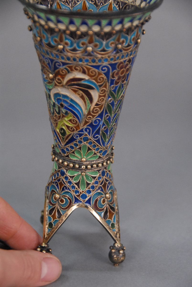 Russian silver plique-a-jour vase having flared rim on round tapering body, three layers of bead work on four legs ending in ball feet with mark of N. 084NHHNK0B6 P. Ovchinni Kov 1905-10. ht. 7 in.