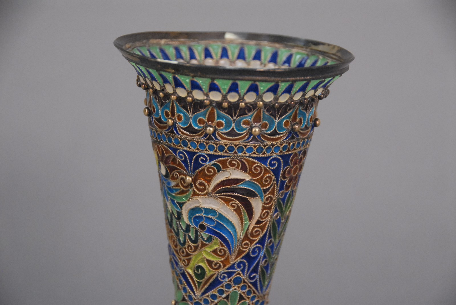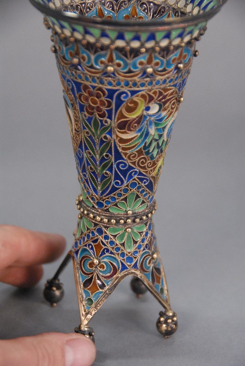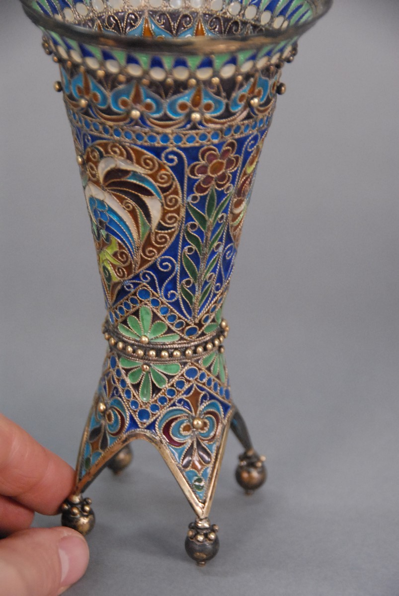 Russian silver plique-a-jour vase having flared rim on round tapering body, three layers of bead work on four legs ending in ball feet with mark of N. 084NHHNK0B6 P. Ovchinni Kov 1905-10. ht. 7 in.