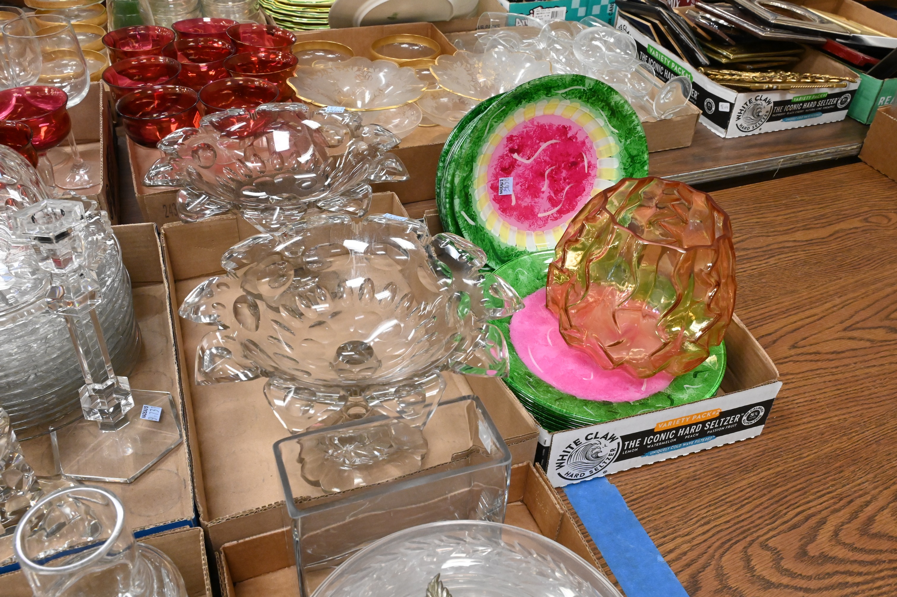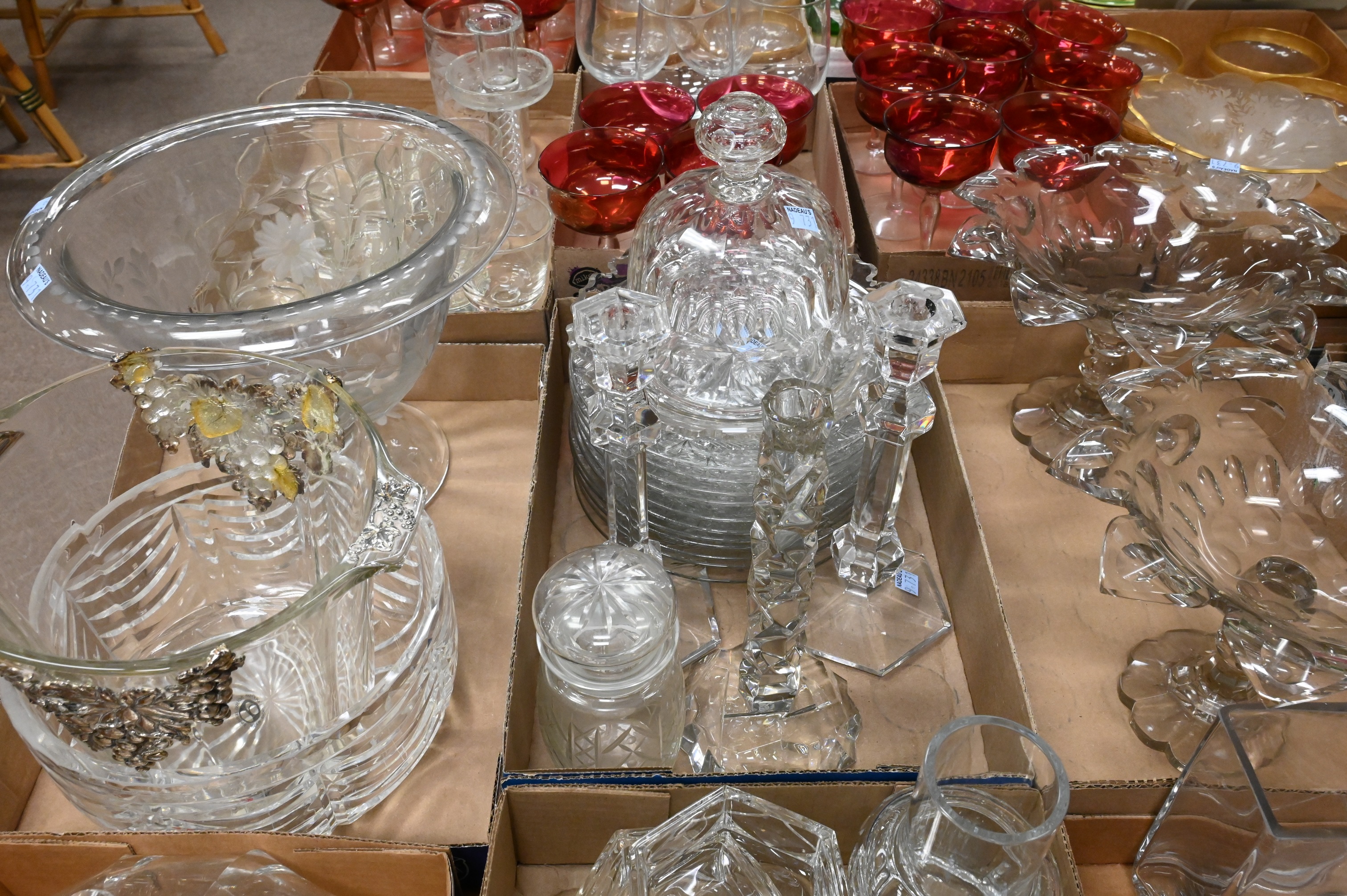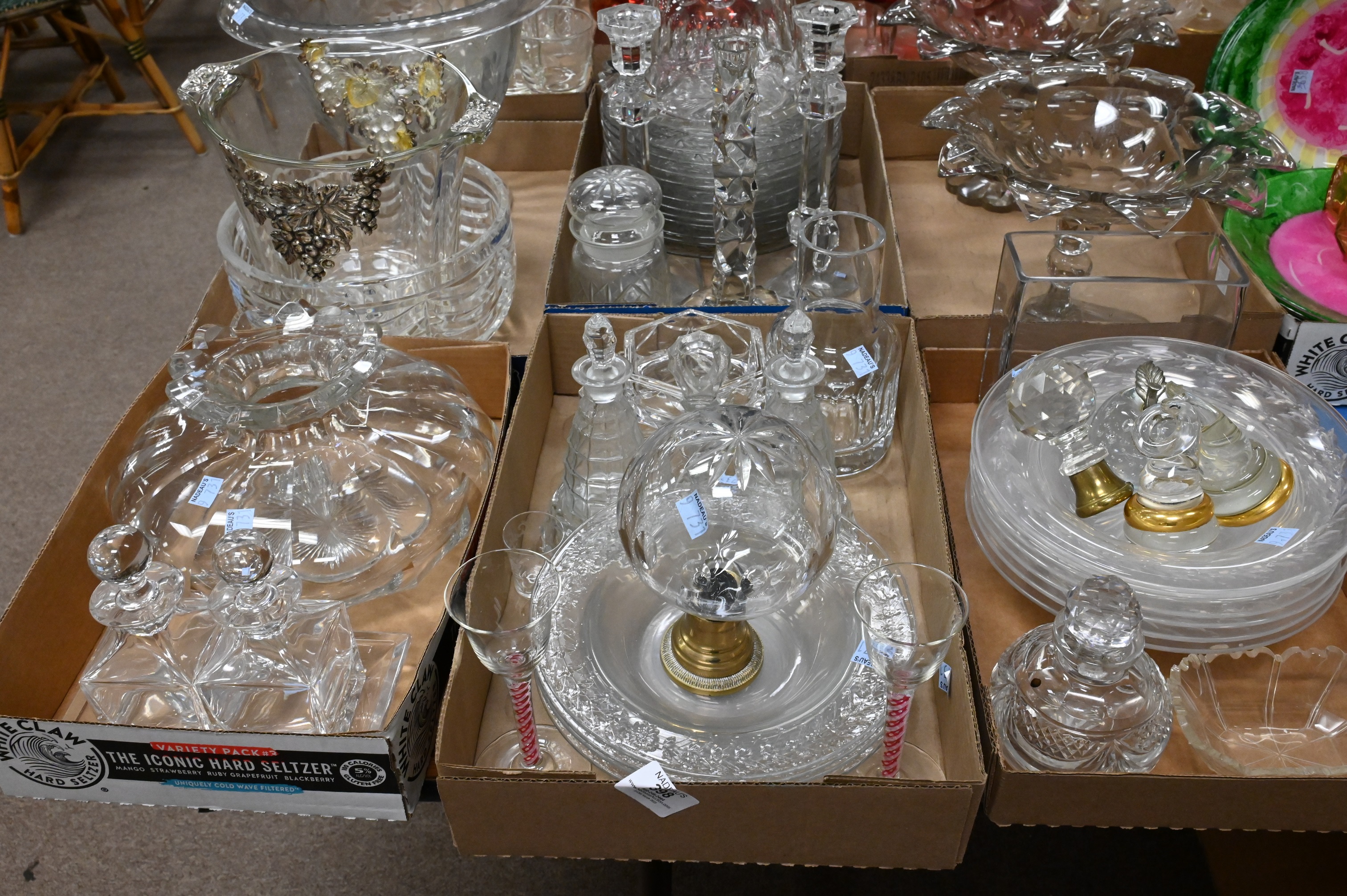 to include pair of compotes, ice bucket with grape leaf mounts, decanters, candle sticks, plates, vignette watermelon plates, etcetera