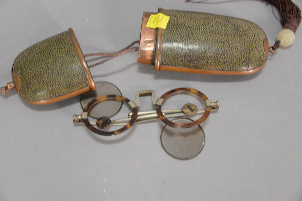 Shagreen and copper eyeglass case with tortoise shell framed glasses as is.