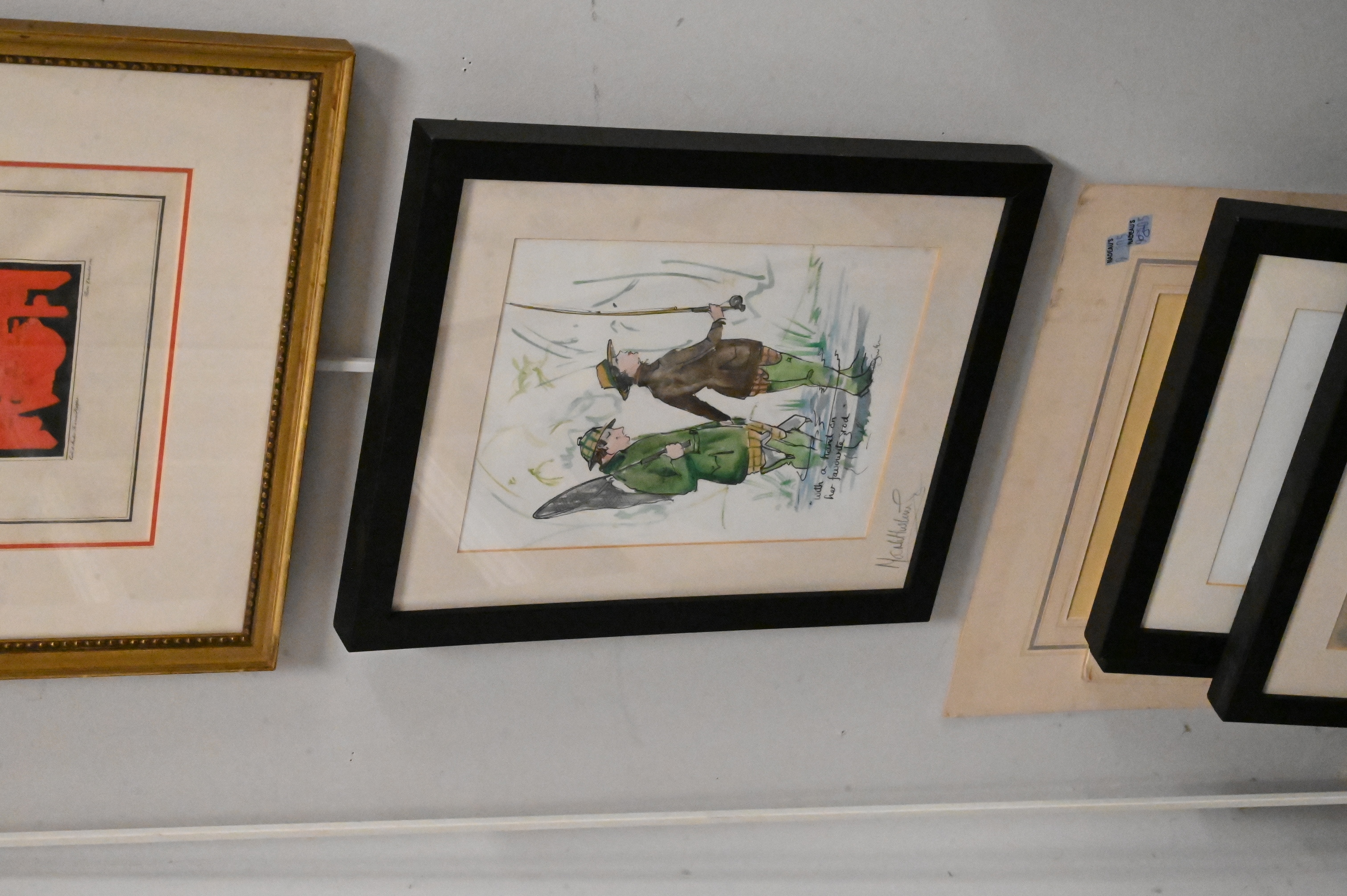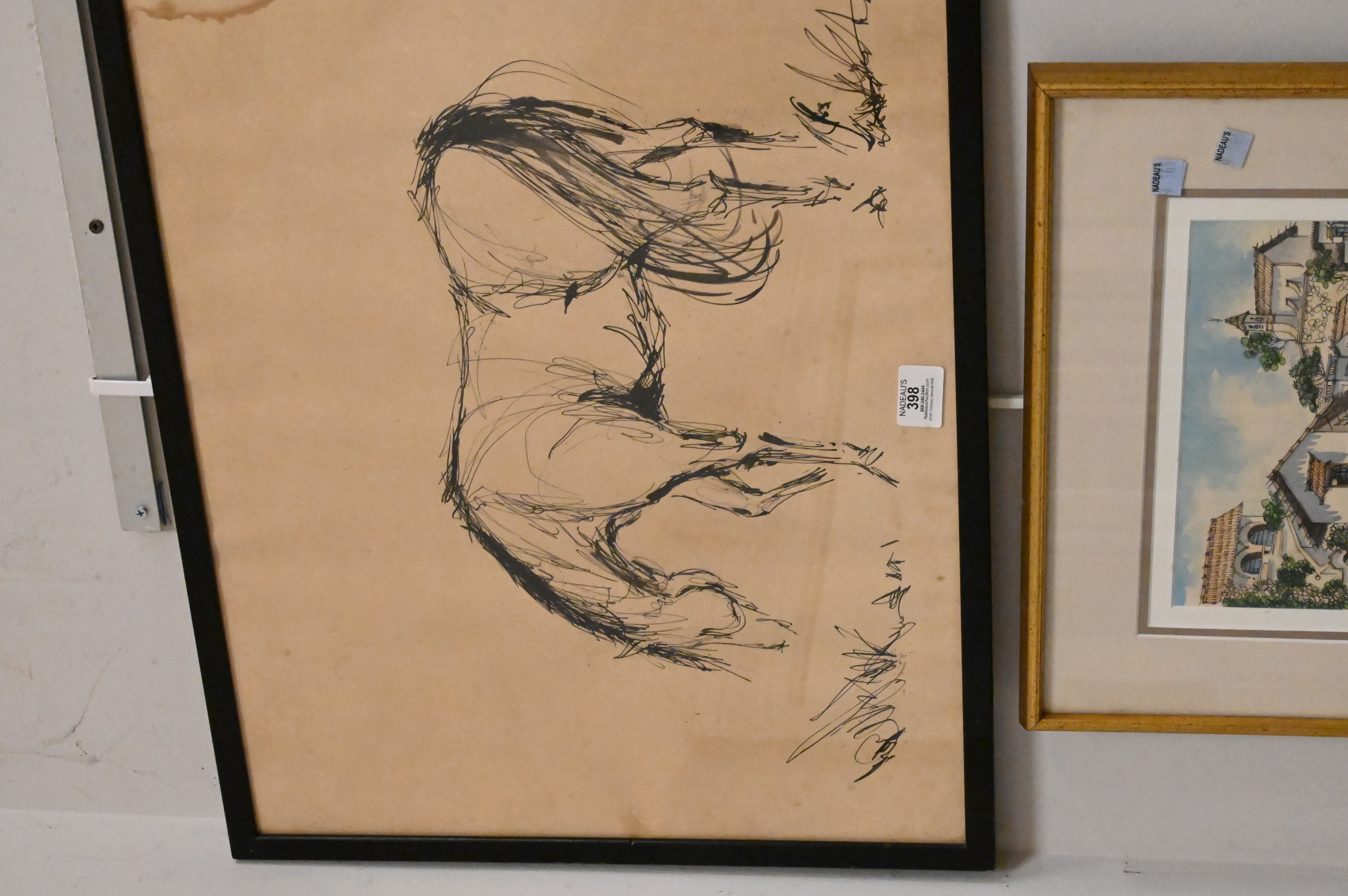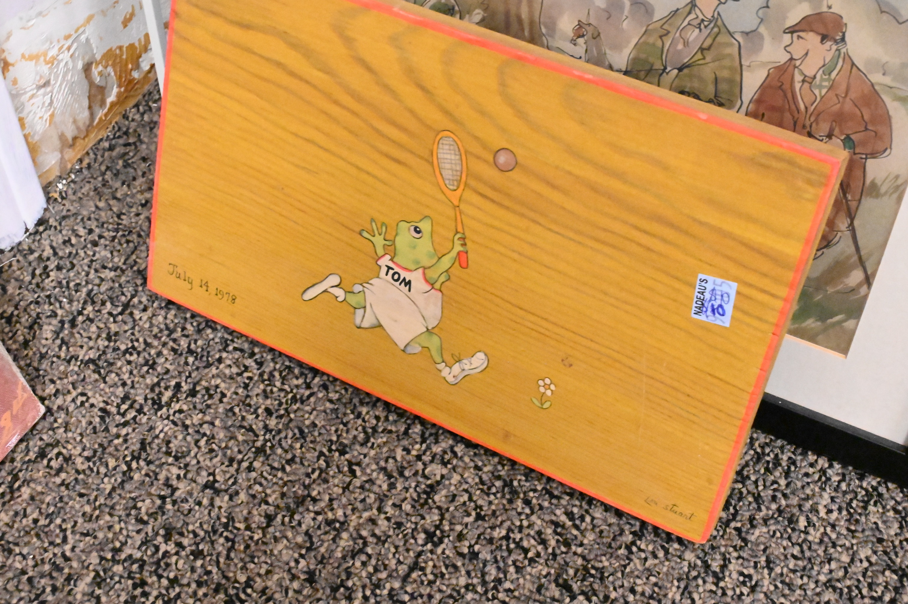 oil portrait of a horse signed Cecilia Barrow 1997, sketch of a horse in pen and ink, Pin Morales (American 1943-2019) mixed media after Pietro Vaincher, four lithographs after Mark Huskinson (British 1935-2018), needlepoint, Lou Stuart oil on wood frog paintings etc..