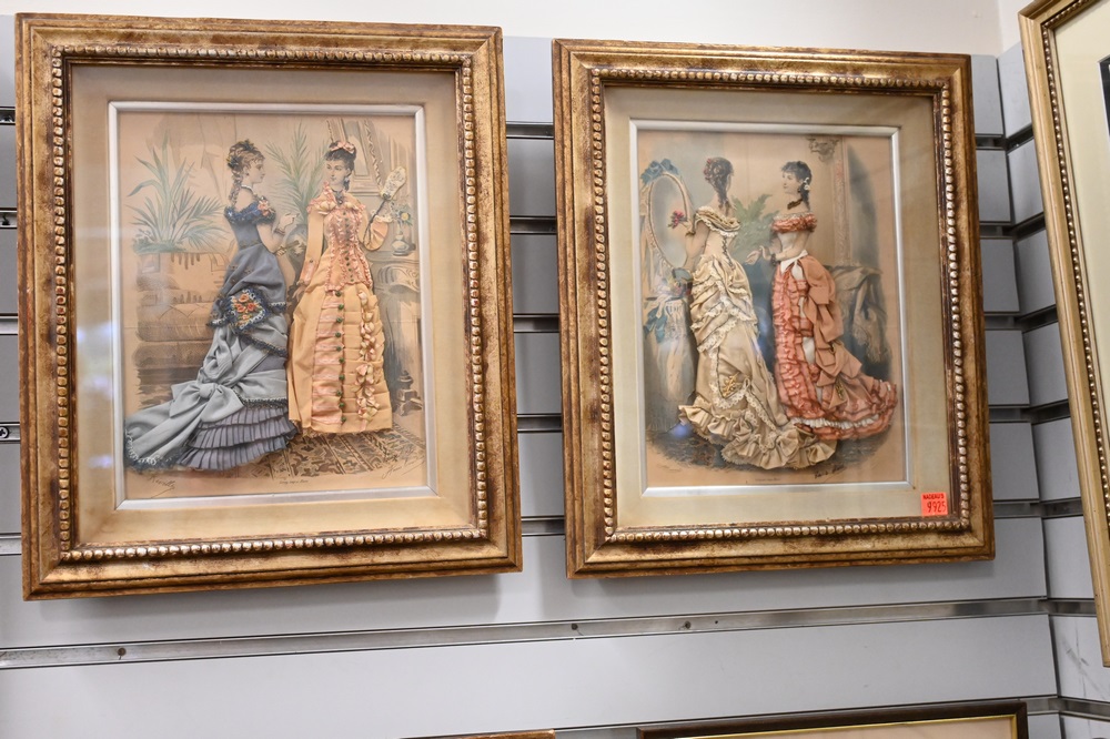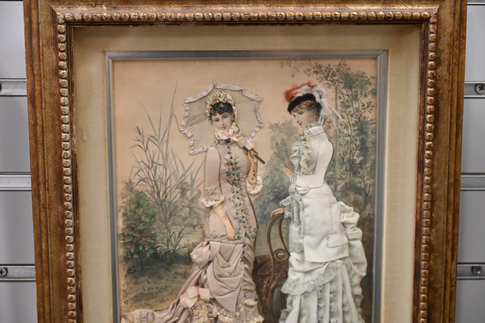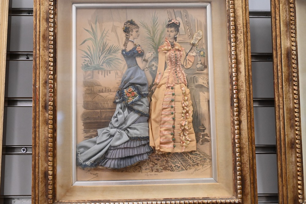 Lot 398: Three Piece Lot of Framed Fashion Prints, having embroidered dress details and hand coloring, each inscribed along the lower edge, sight size 10″ x 8 1/2″.