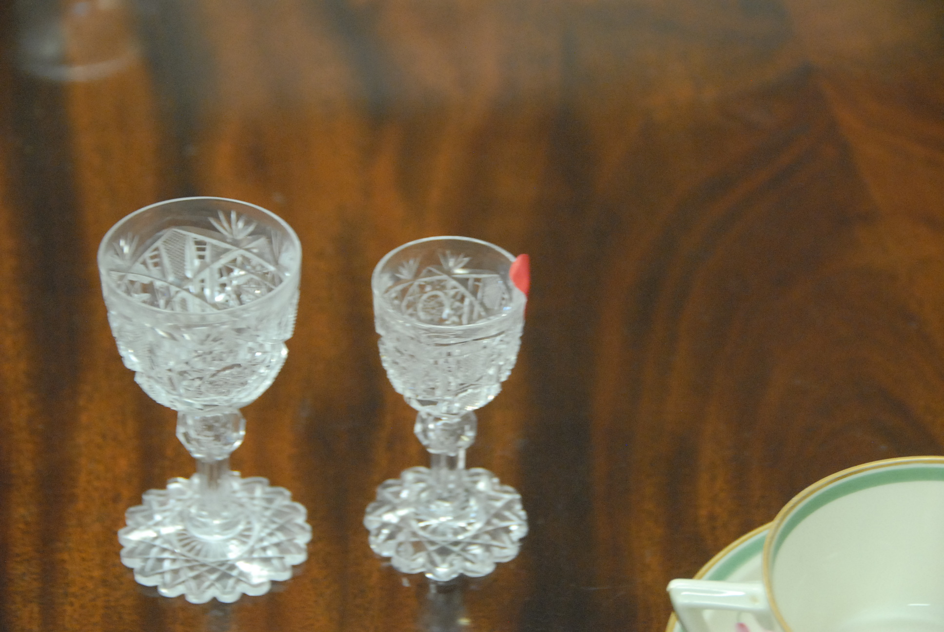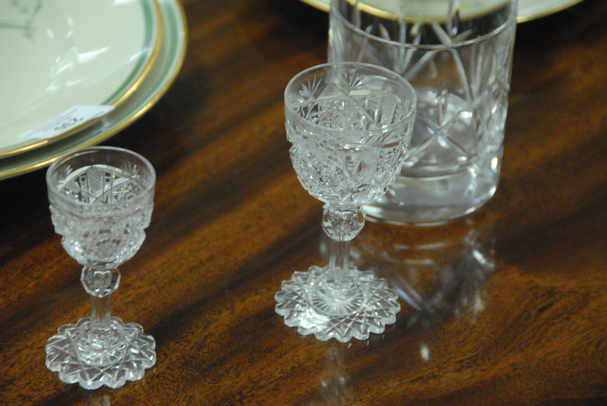 Lot 398: Two sets of cut glass stemmed cordials including set of ten and set of seven.ht. 3 1/2 in. to 4 in.