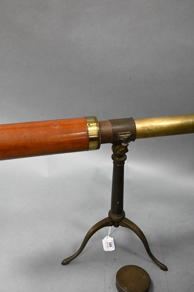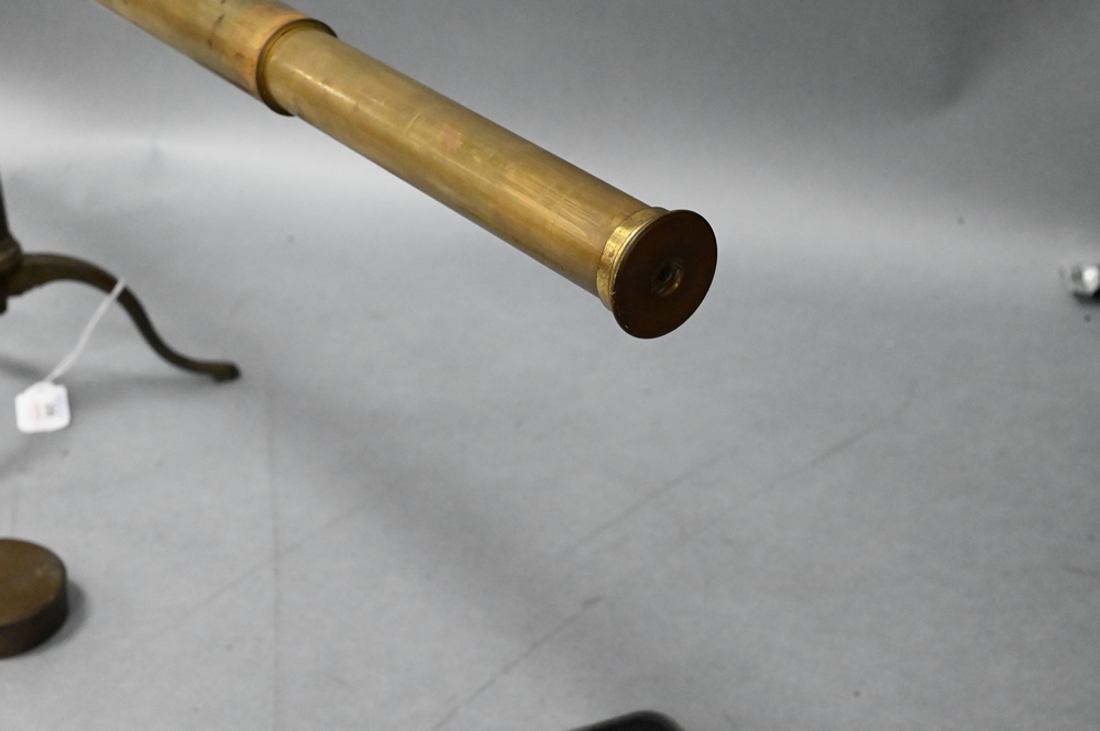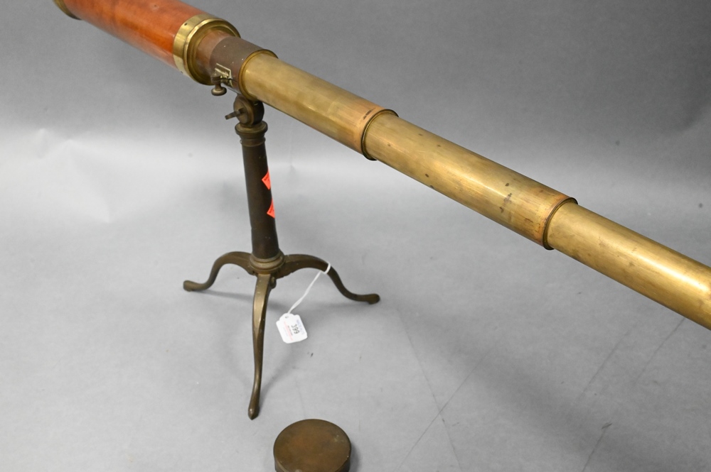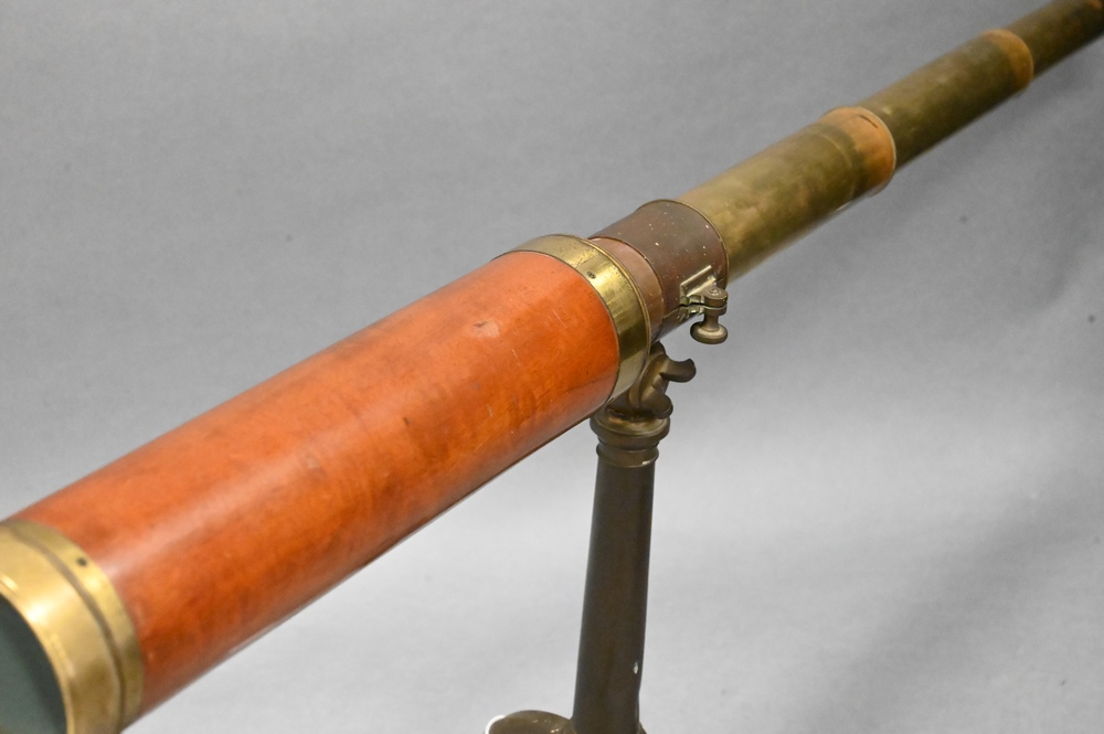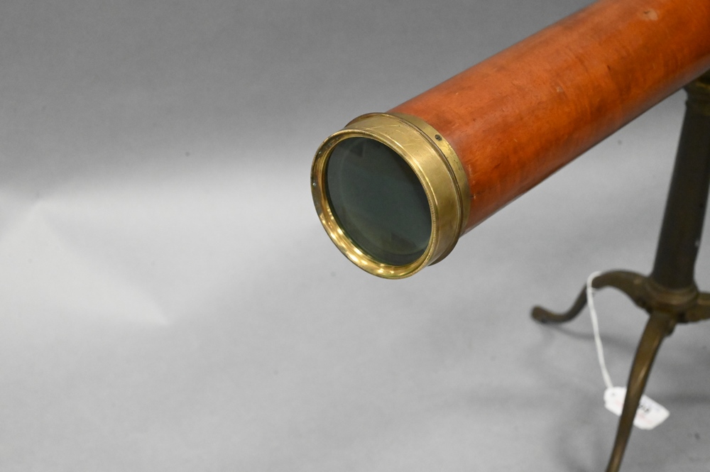 19th Century English Telescope, wood and brass on heavy brass tripod stand, height 12 inches, length 36 inches.