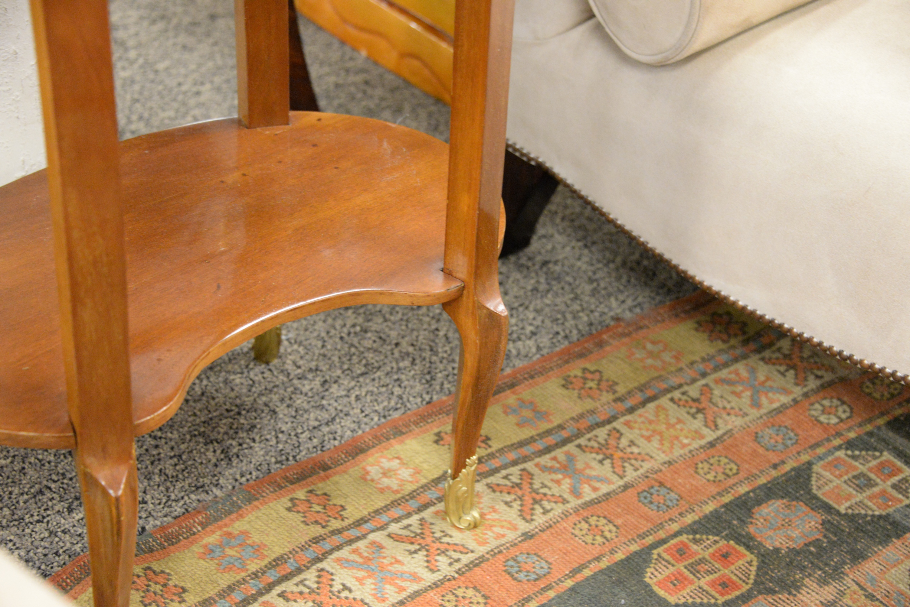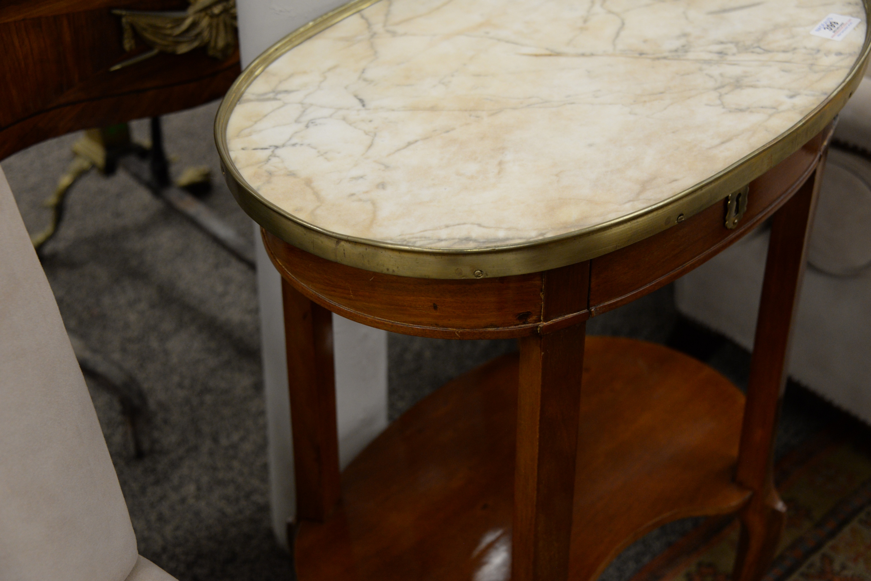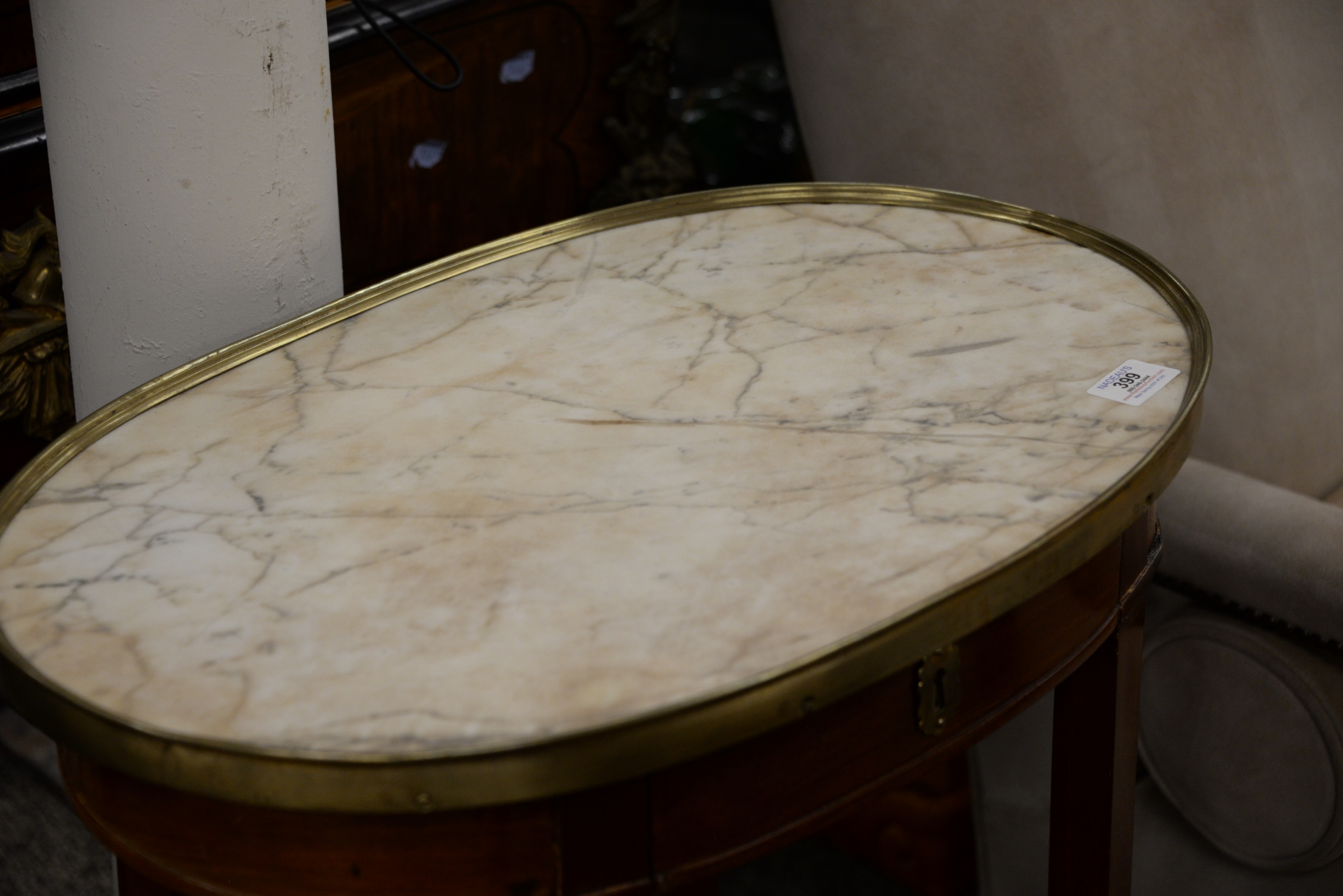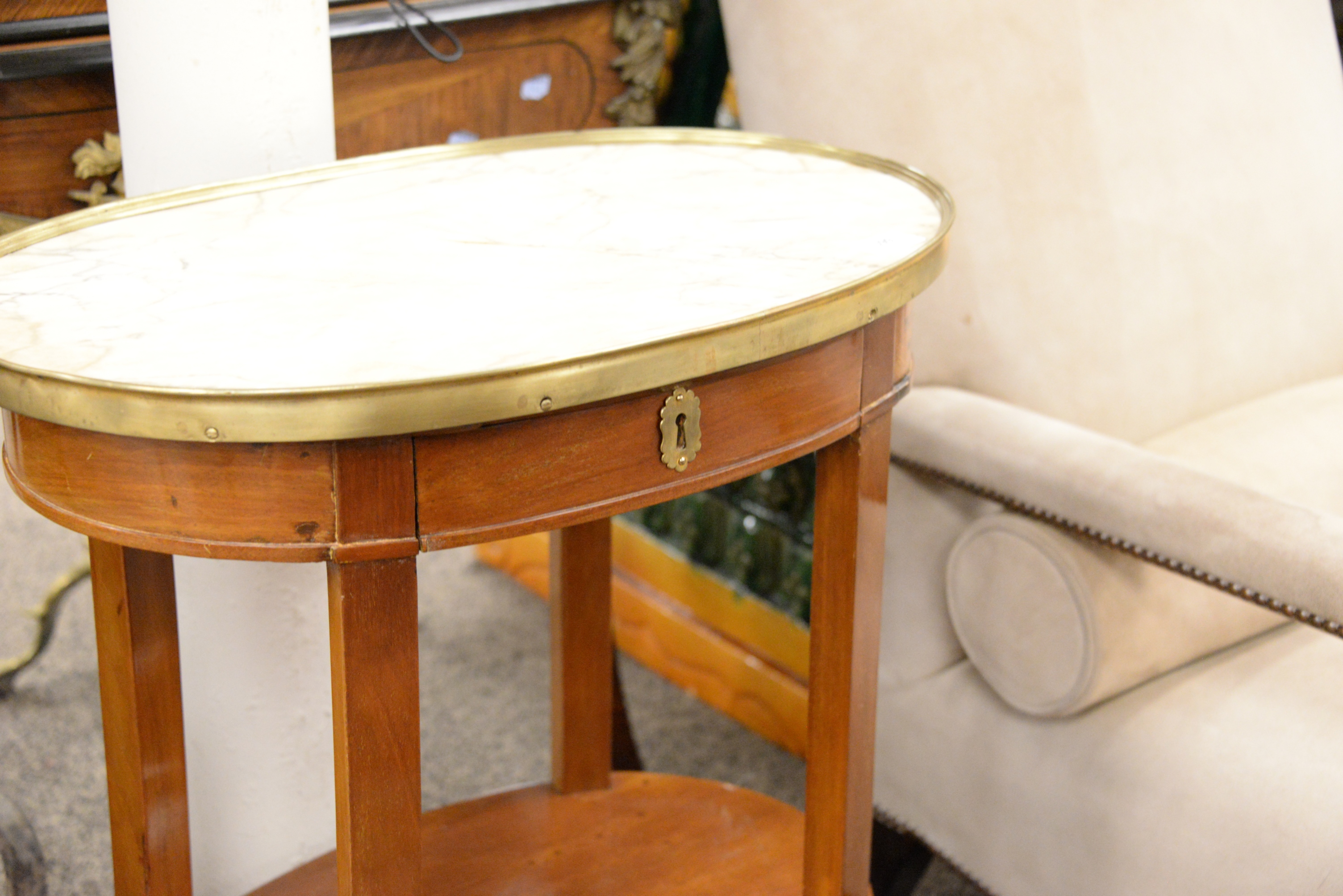 19th Century French Marble Top Side Table, having brass gallery over single drawer, all set on cabriole legs, height 28 inches, top 15 1/4″ x 22 3/4″.