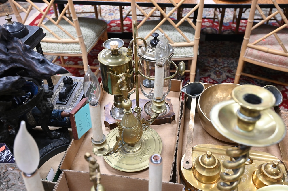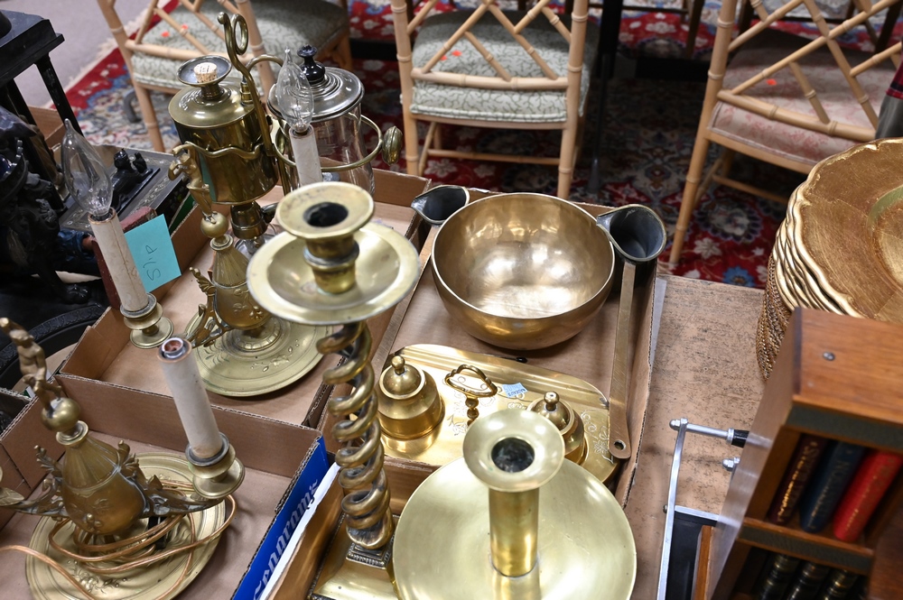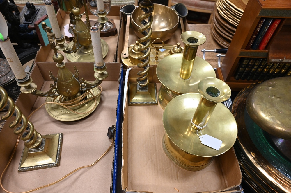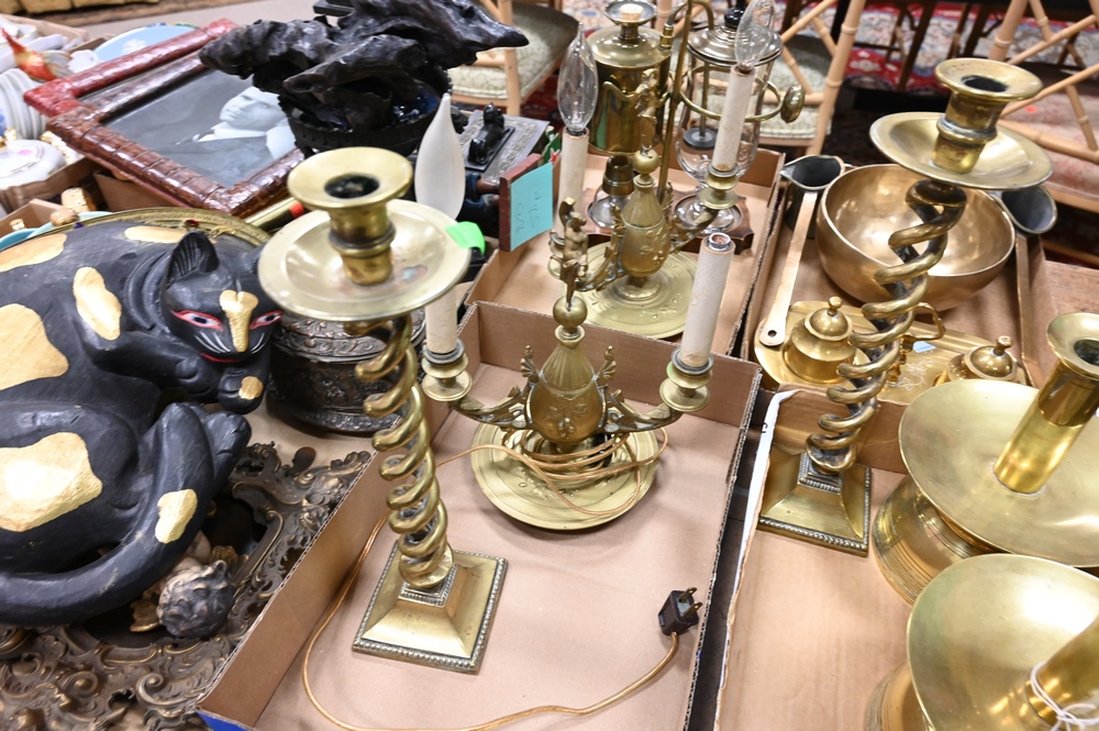 Lot 399: Assorted Brass Grouping, to include pair of Victorian brass figural candelabras, having partially clad figure finial with two arms each electrified, twist candlesticks, desk set, large candlesticks, etc.