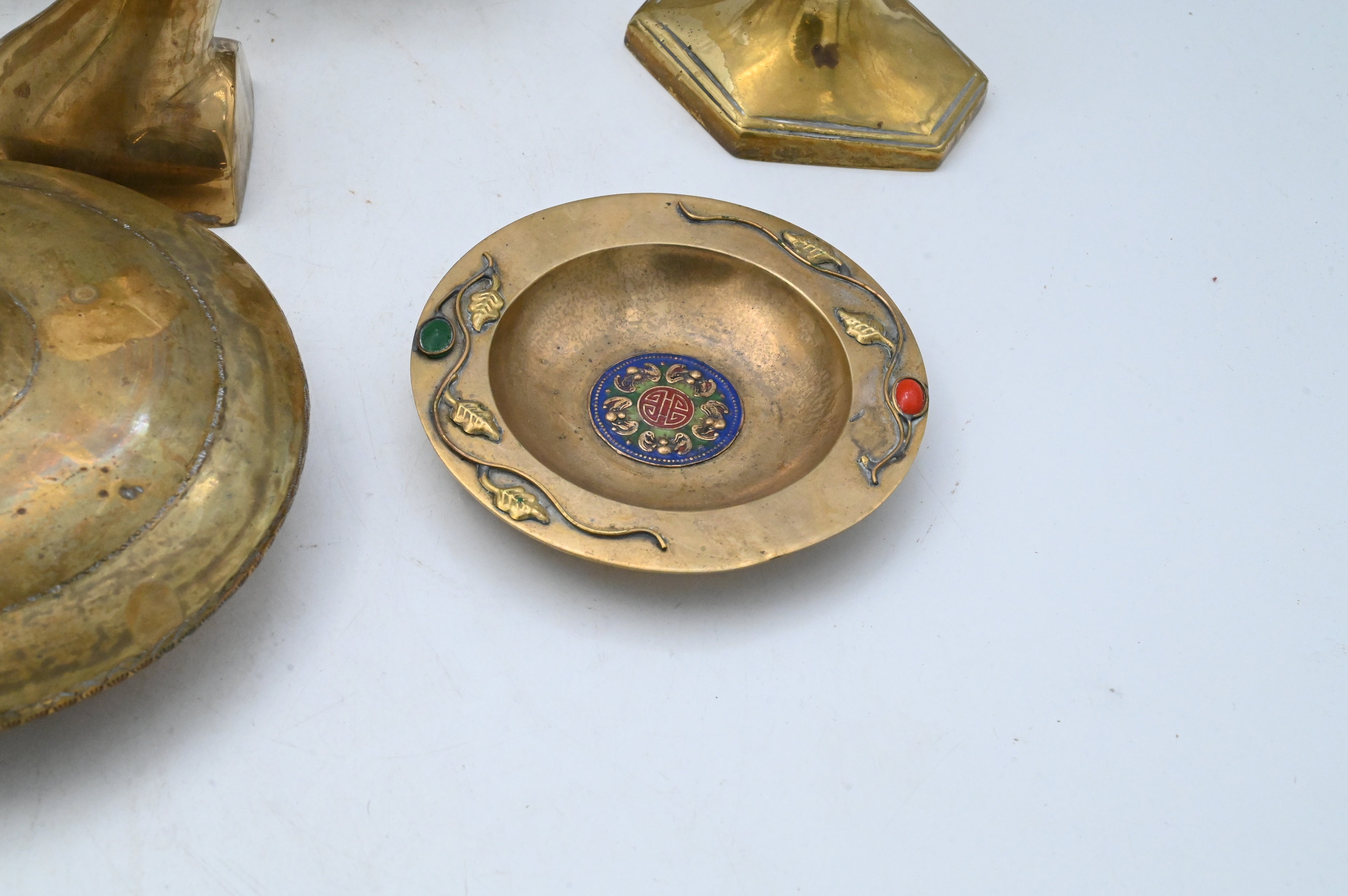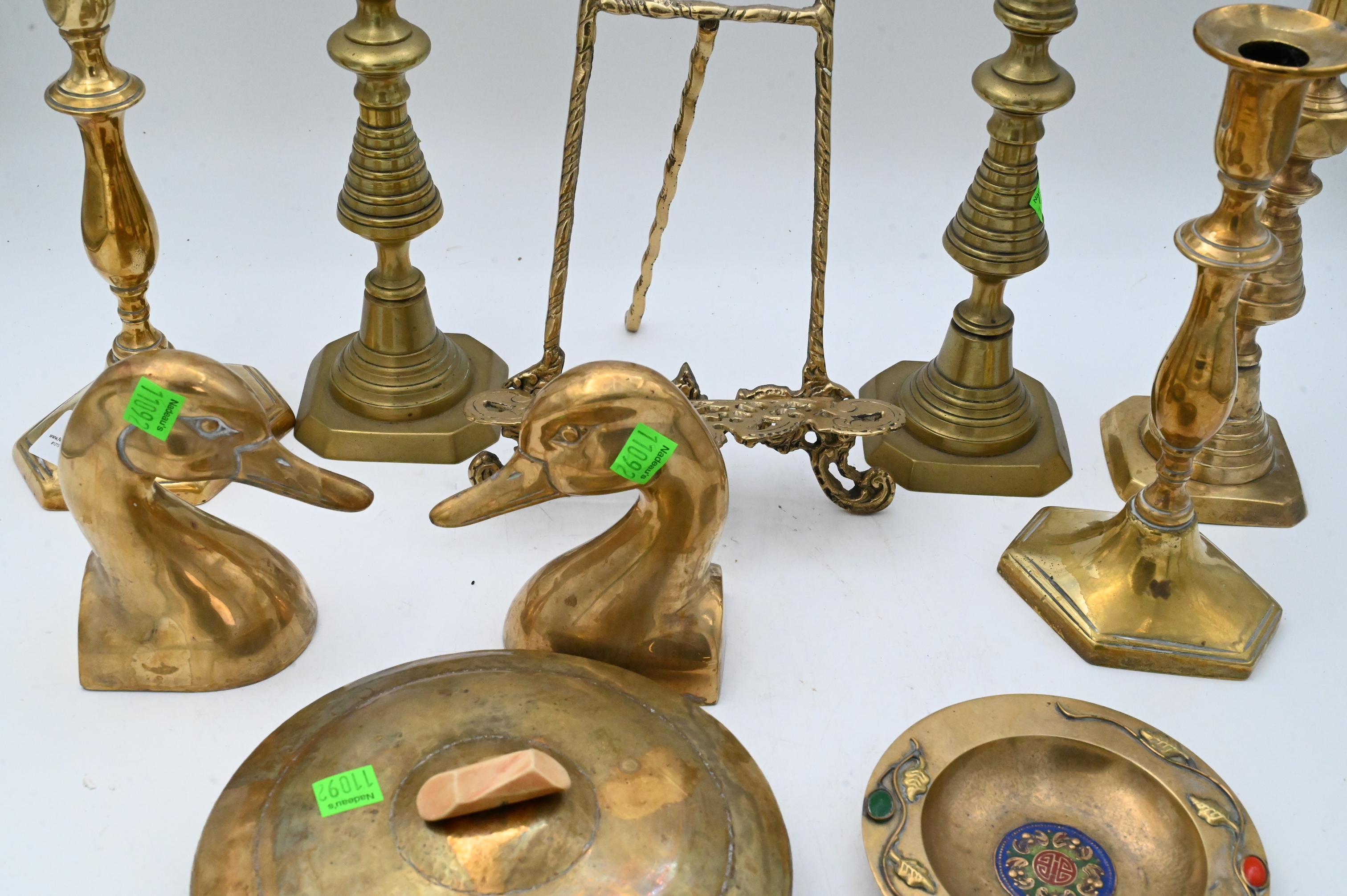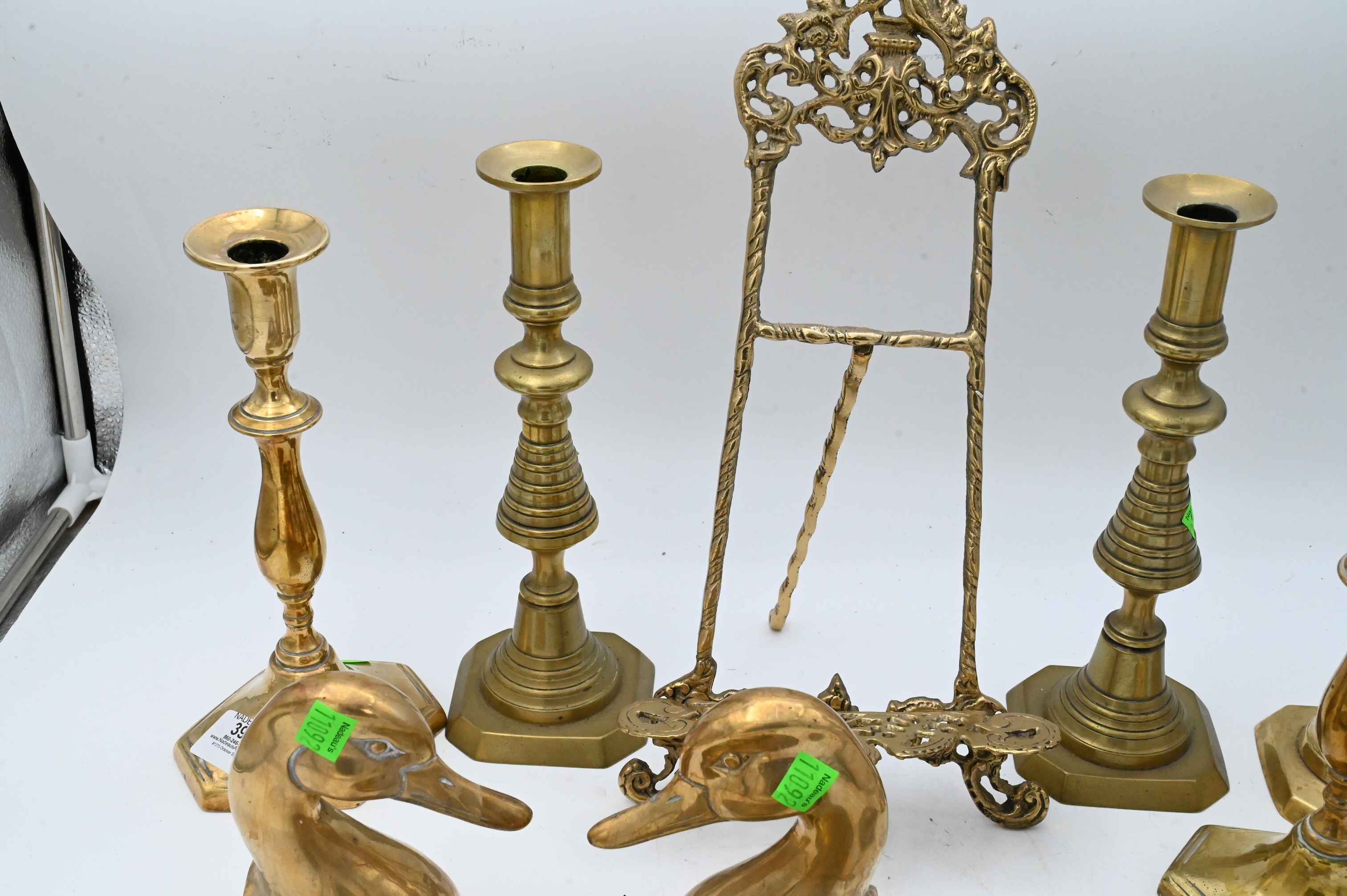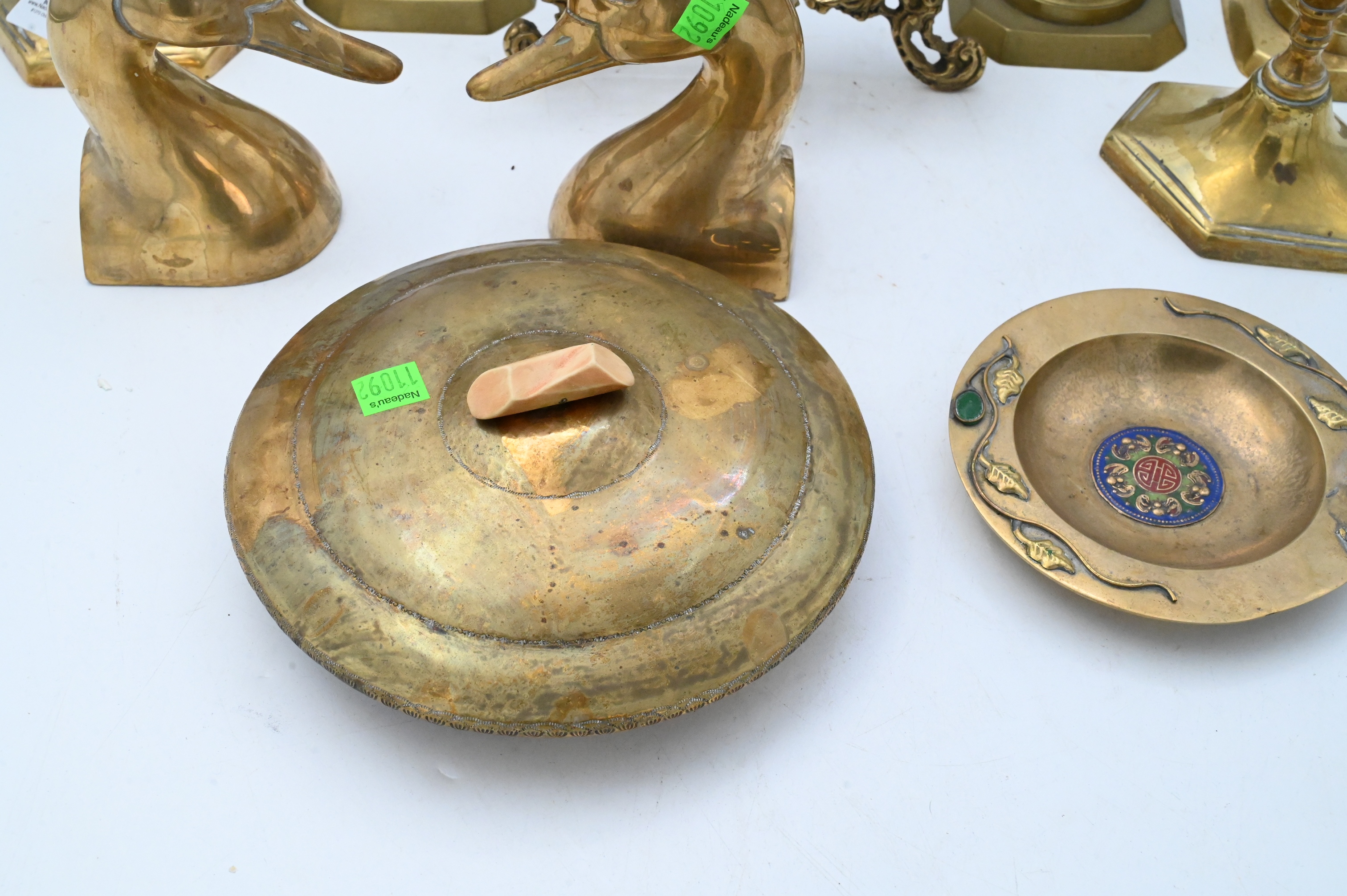 five candlesticks, two easels, goose head andiron finials, inlaid plate and covered dish