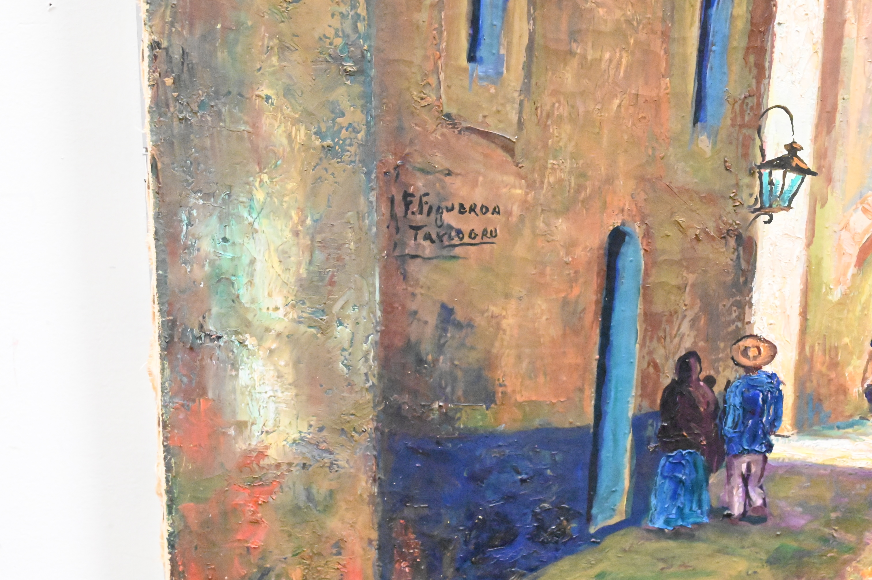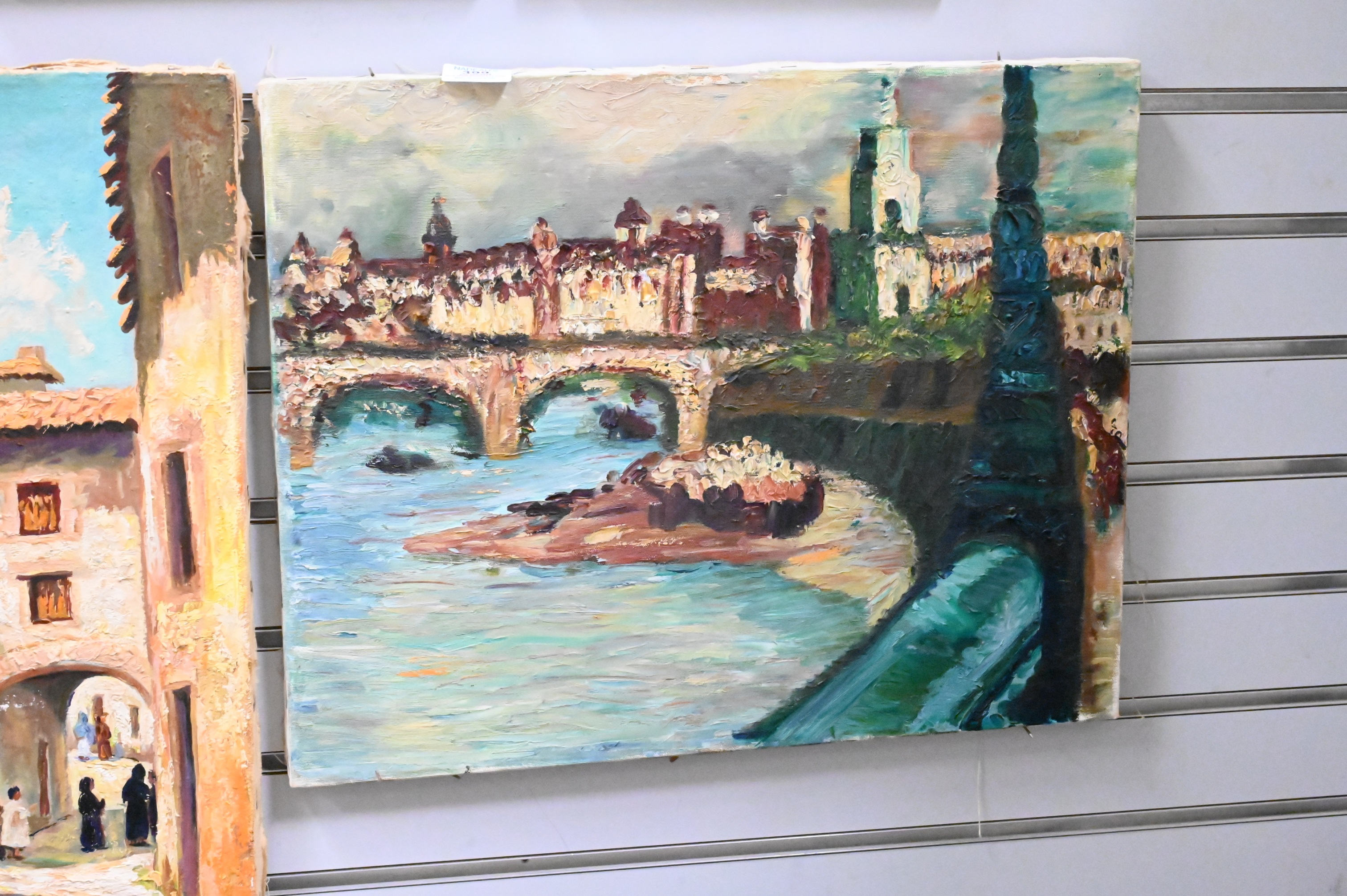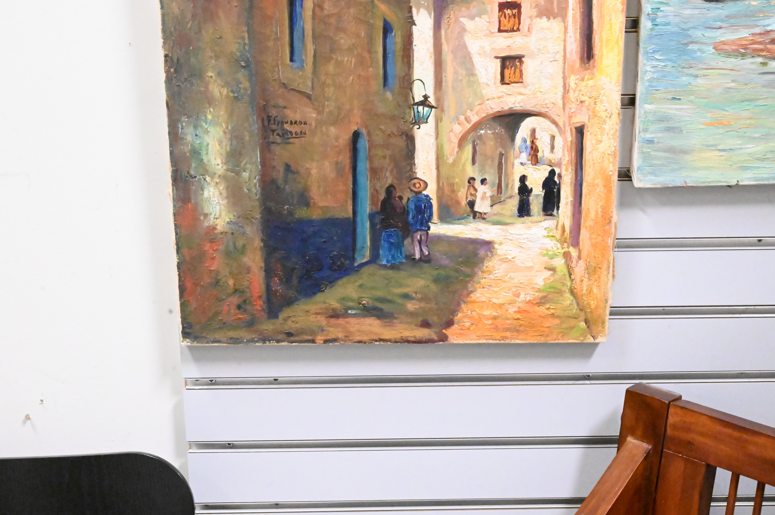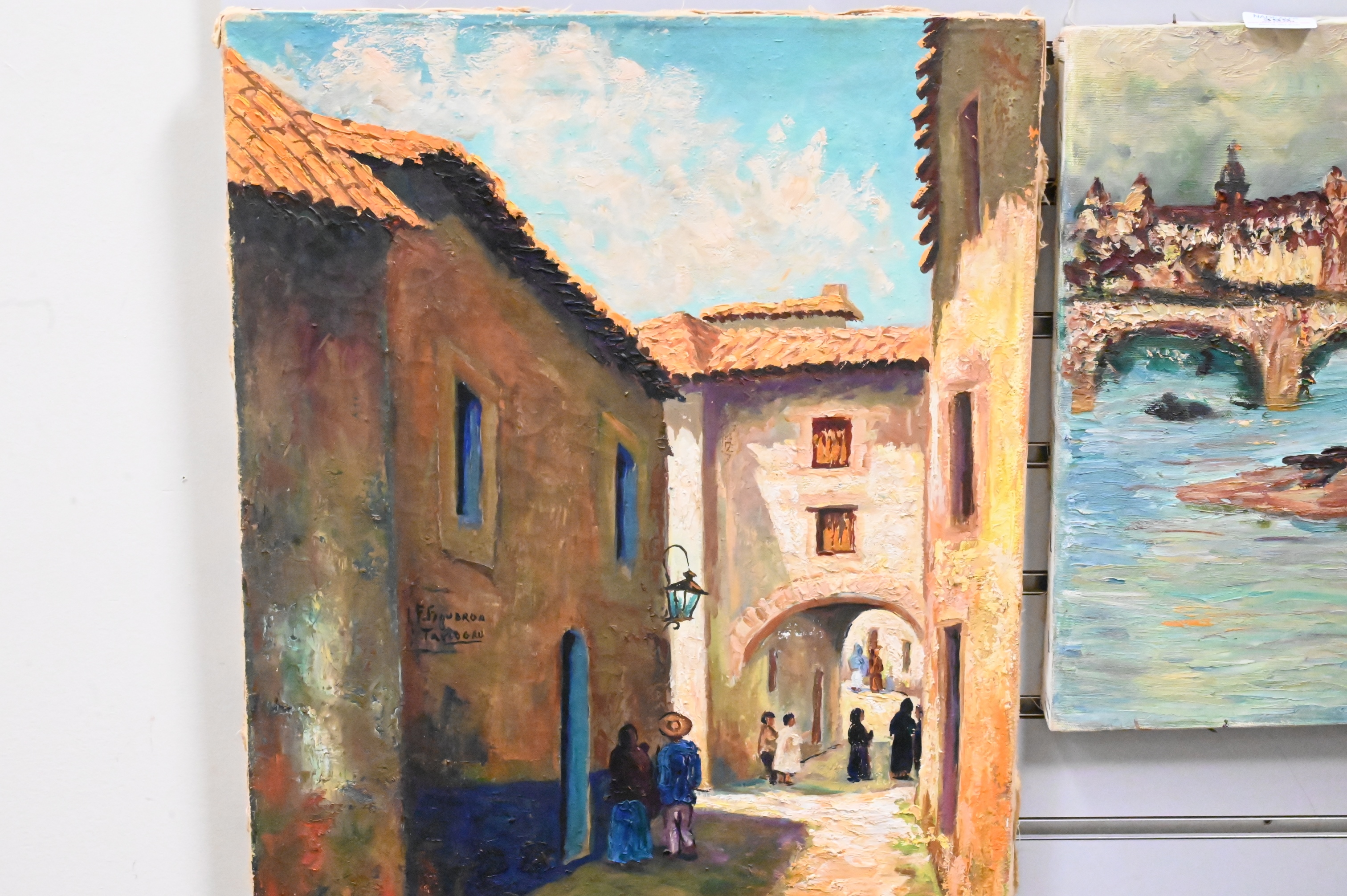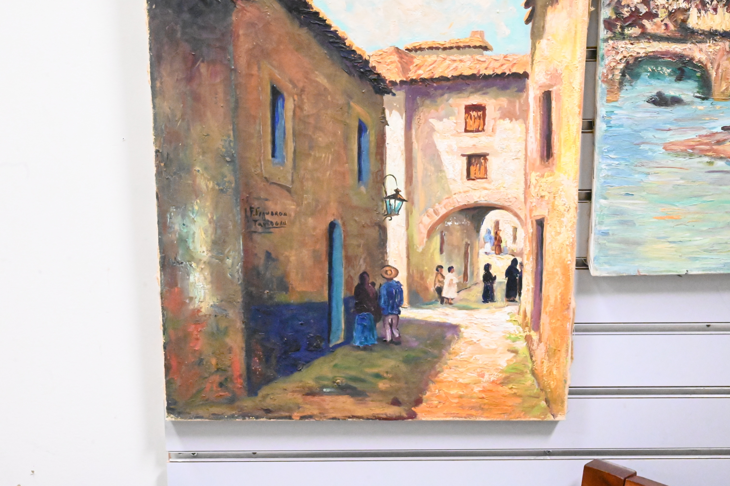 Fidel Figueroa (b. 1966), two landscapes, oil on canvas, to include a village scene, signed lower left, 23″ x 17 1/2″; along with London Bridge, unsigned, 16″ x 20″.