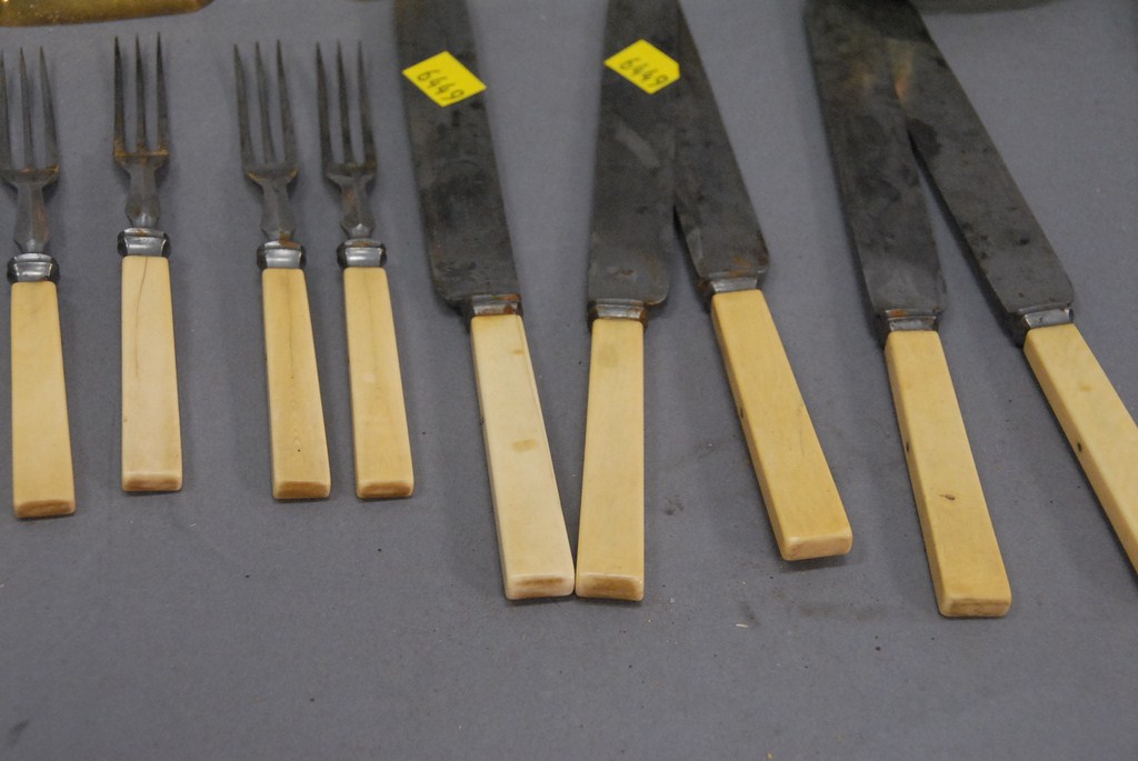 Lot 399: Group lot group of early ivory handled knives, three tine forks, pair of brass push up candlesticks, small pewter plate, and brass …
