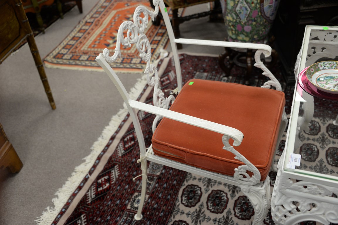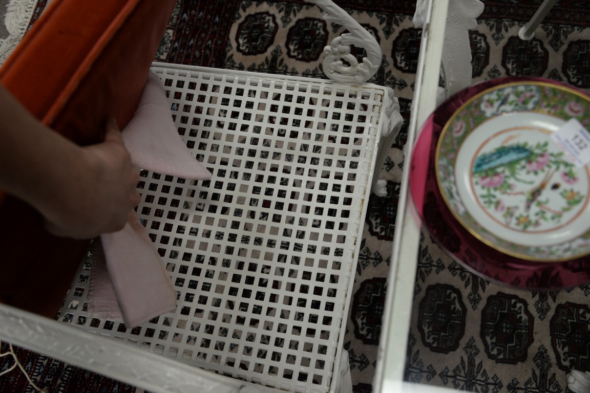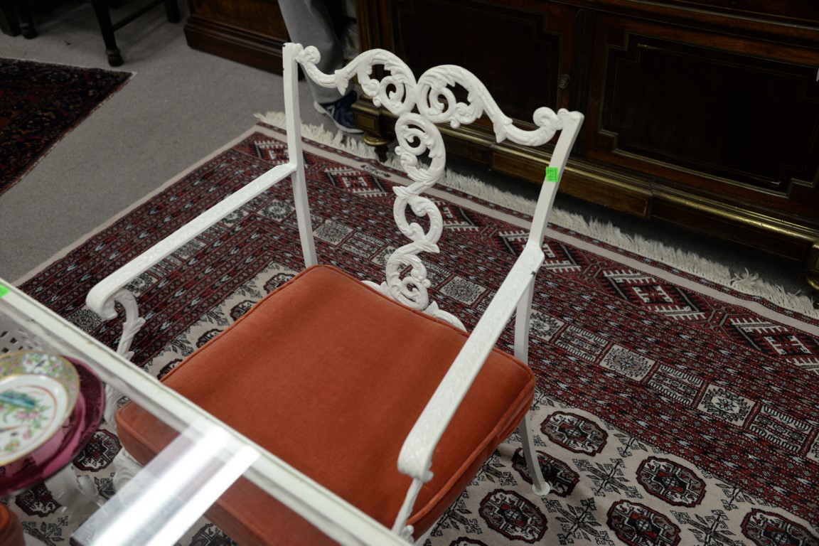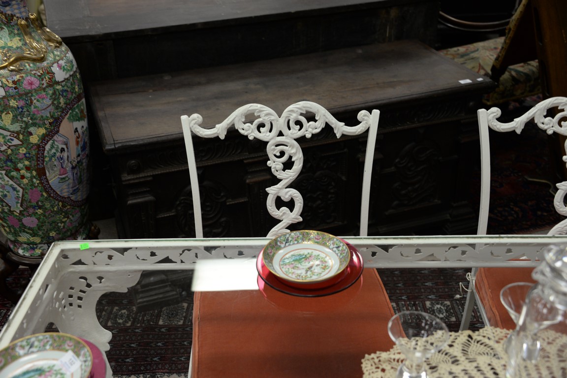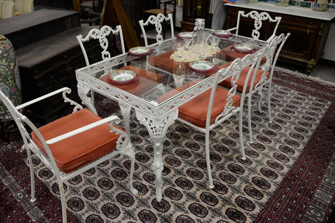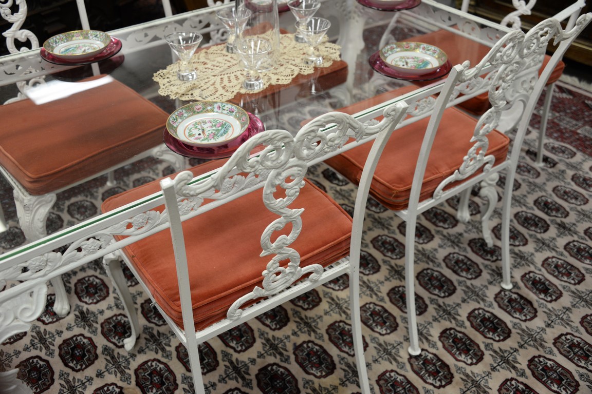 Lot 399: Iron patio set with glass top table and six chairs, each with woven iron seats, ht. 29in., top: 30 x 61.