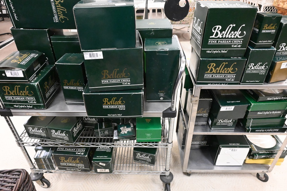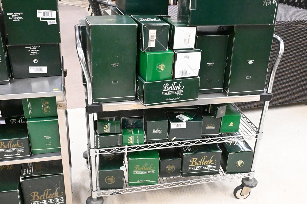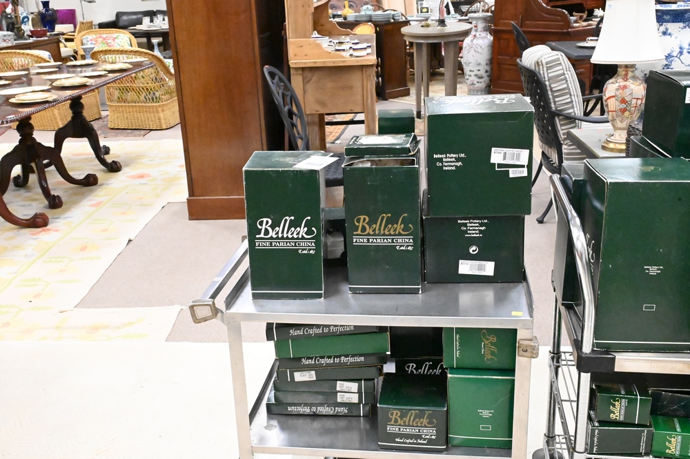 Lot 399: Large Group of Belleek, in original boxes, to include trays, vases, cups, teapots, Christmas plates, candlesticks, etc. Provenance: Collections of Norma Reilly, New Jersey.