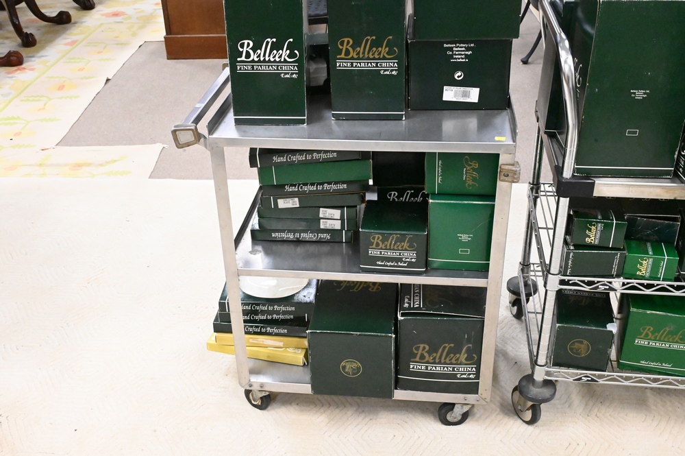 Large Group of Belleek, in original boxes, to include trays, vases, cups, teapots, Christmas plates, candlesticks, etc. Provenance: Collections of Norma Reilly, New Jersey.