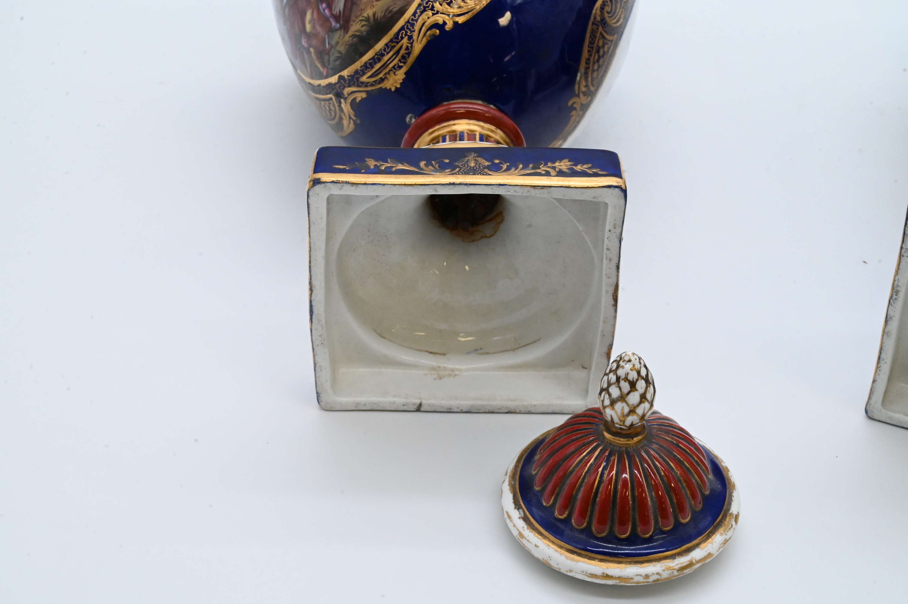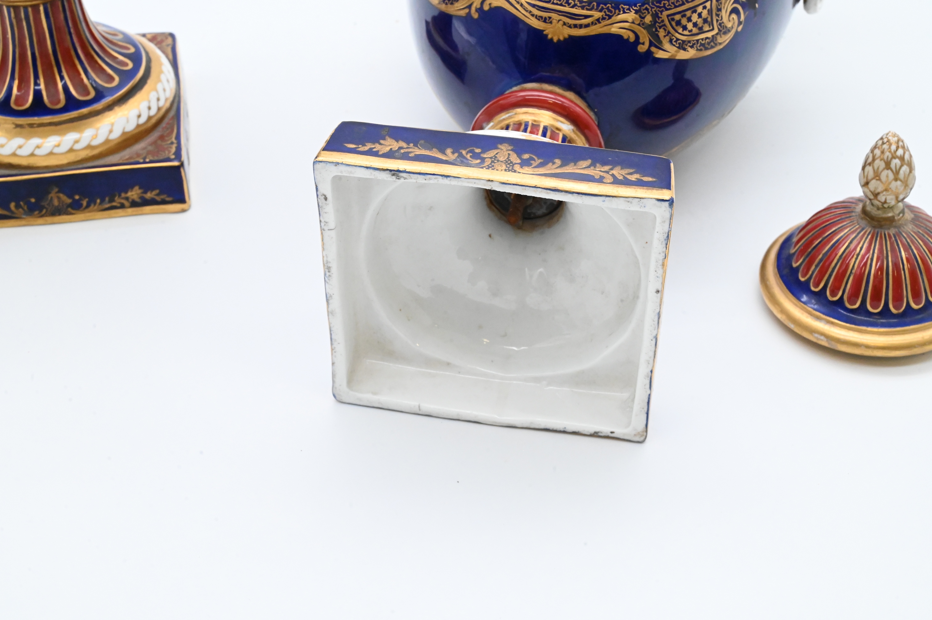 having domed covers surmounted by pineapple finials, each with scrolled handles and baluster-form bodies raised on square bases, decorated in deep cobalt blue, turquoise, burgundy, and gilt, centered on oval cartouches painted with classical trophies and floral garlands. The necks and bases are accented with vertical ribbing