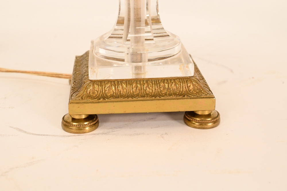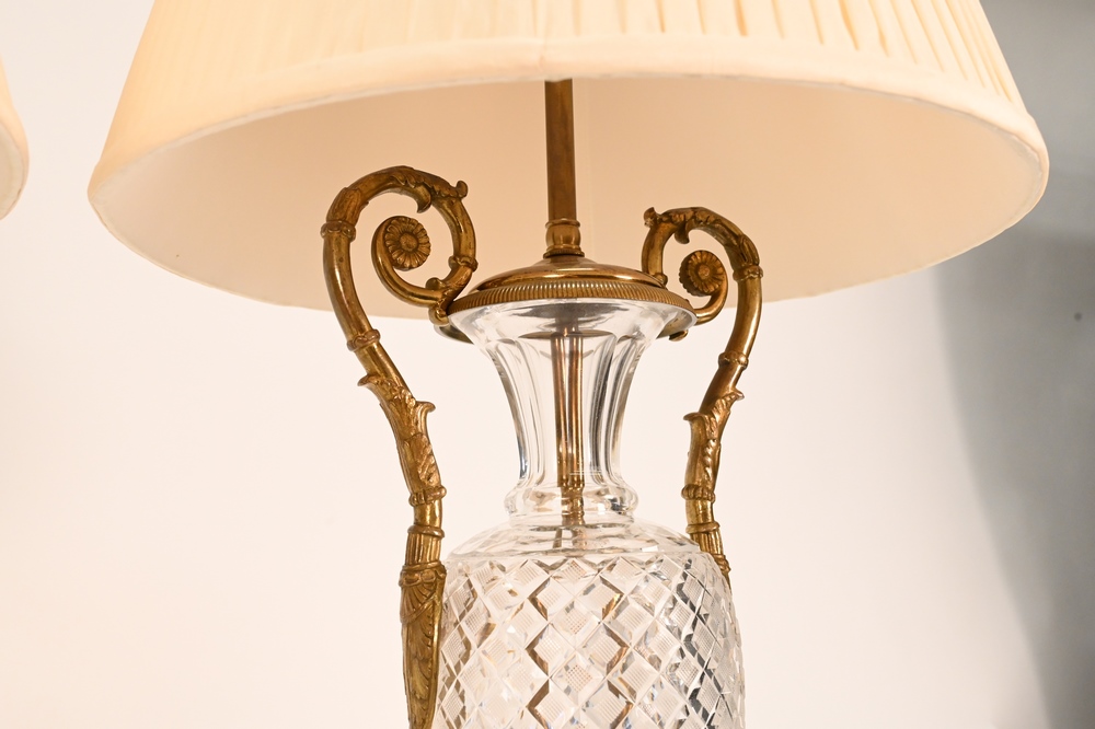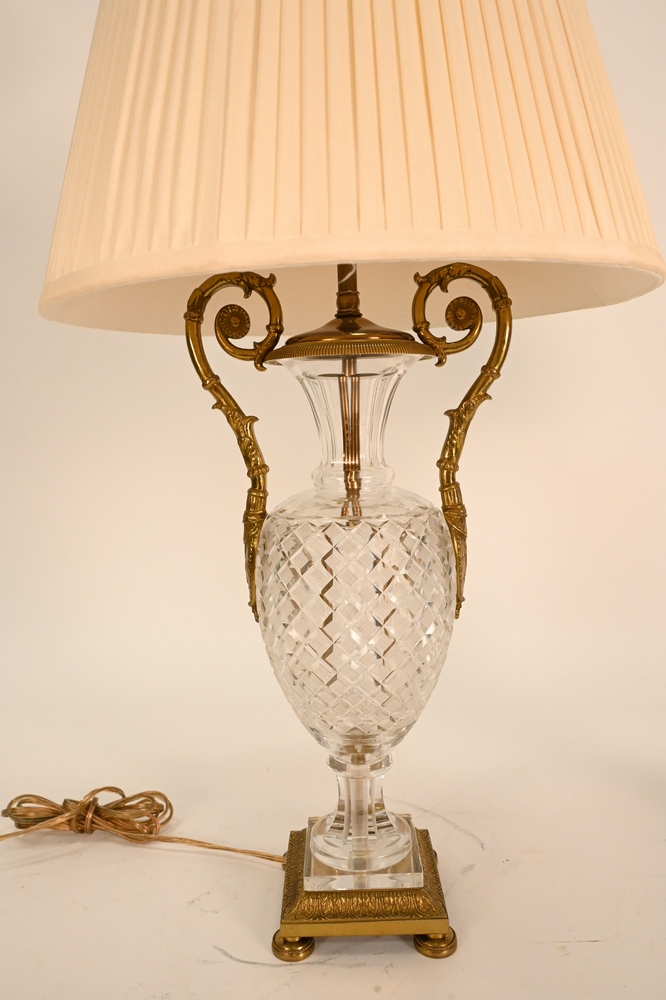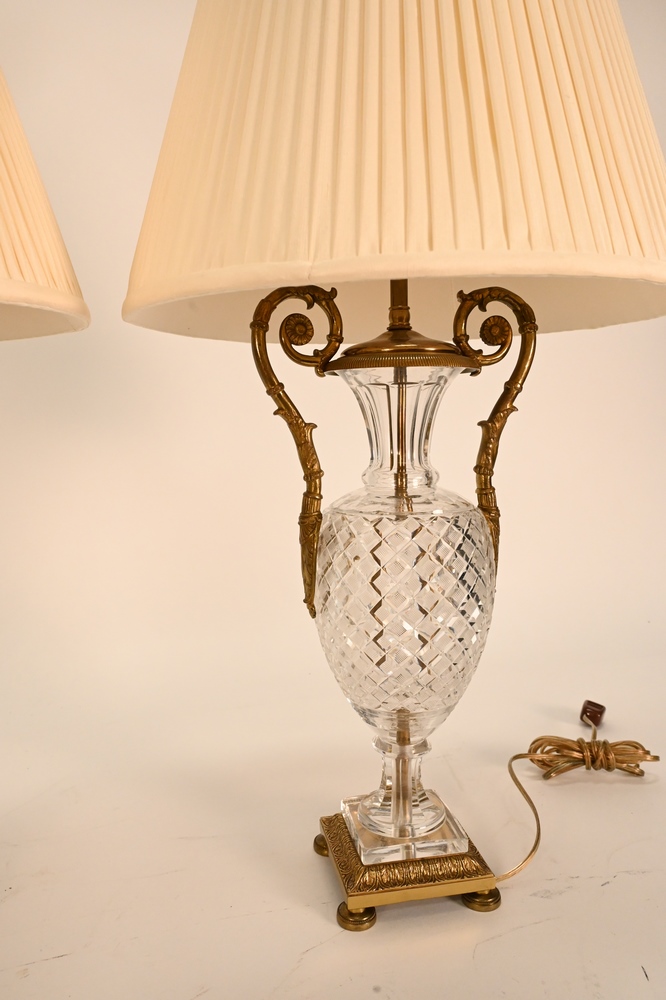 Lot 399: Pair of Baccarat Cut Crystal Lamps, Empire style having bronze mounted handles on bronze square vase, height 29 inches.