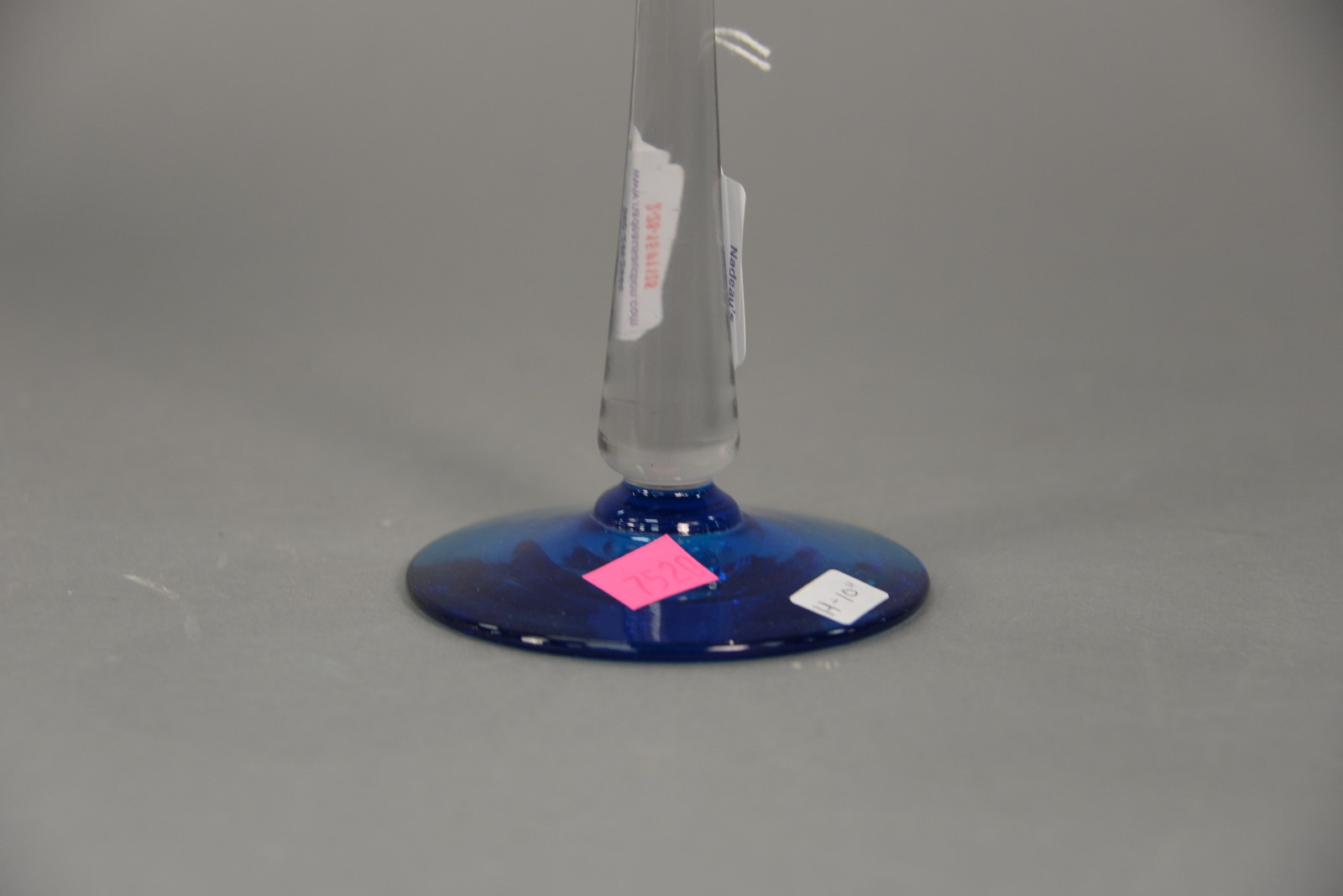 Lot 399: Sinclaire candlestick clear stem with contrasting blue foot and top, marked with water mark on bottom.ht. 10 in.