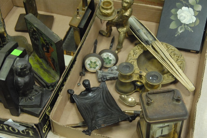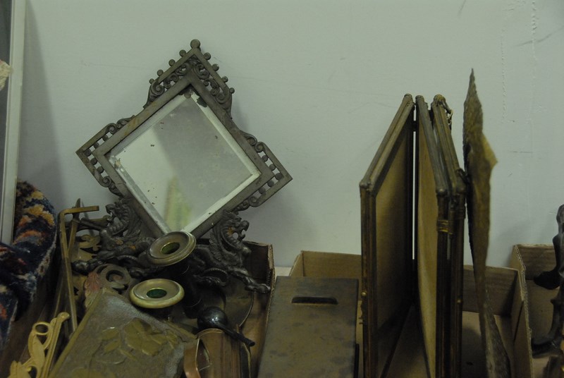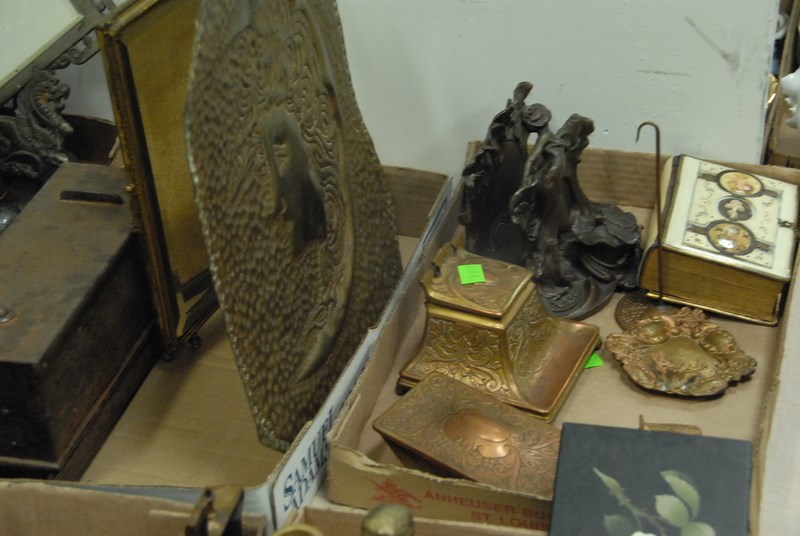 Six box lots including metal work, desk set, bookends, figures, mirrors, and silverplate.