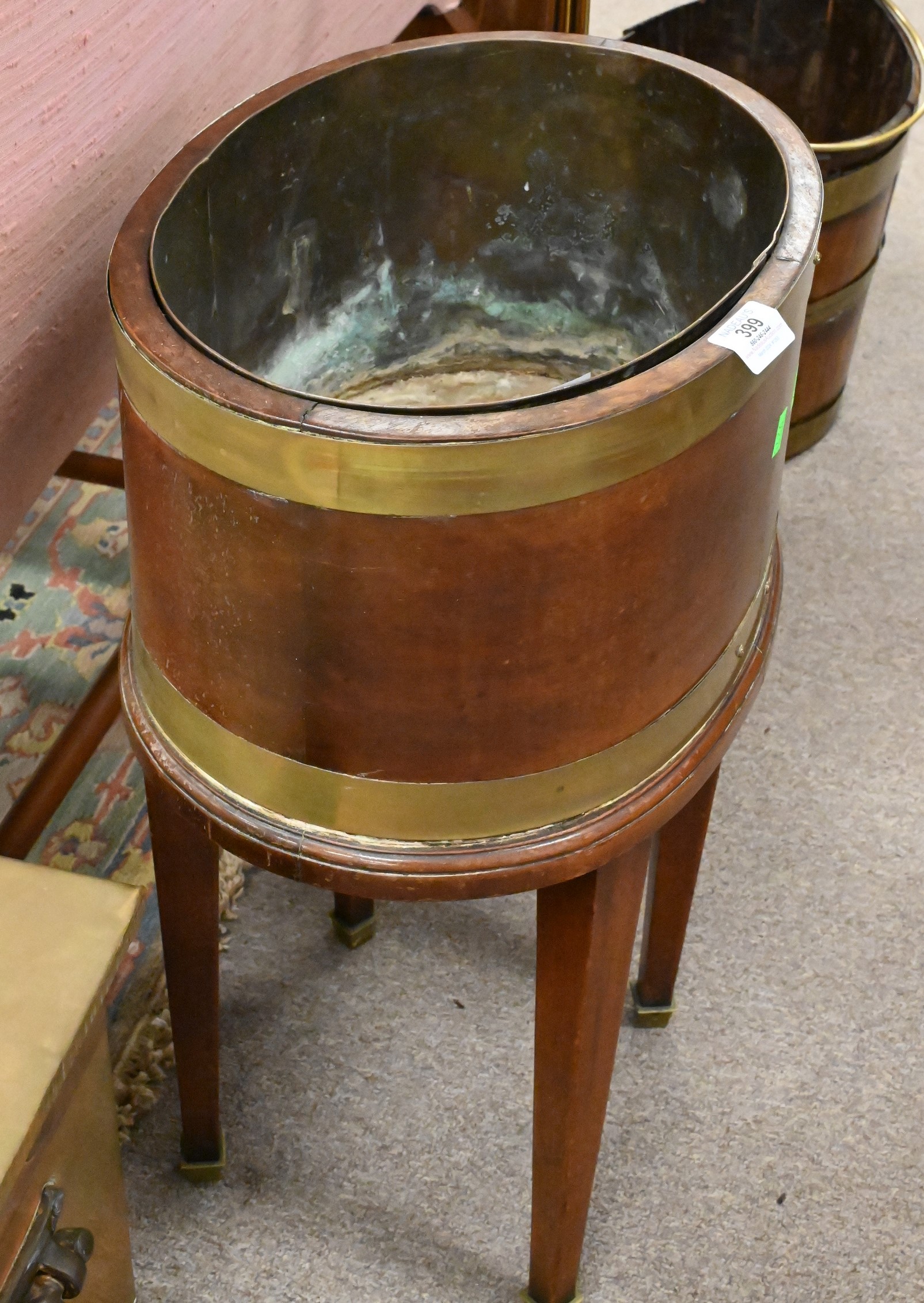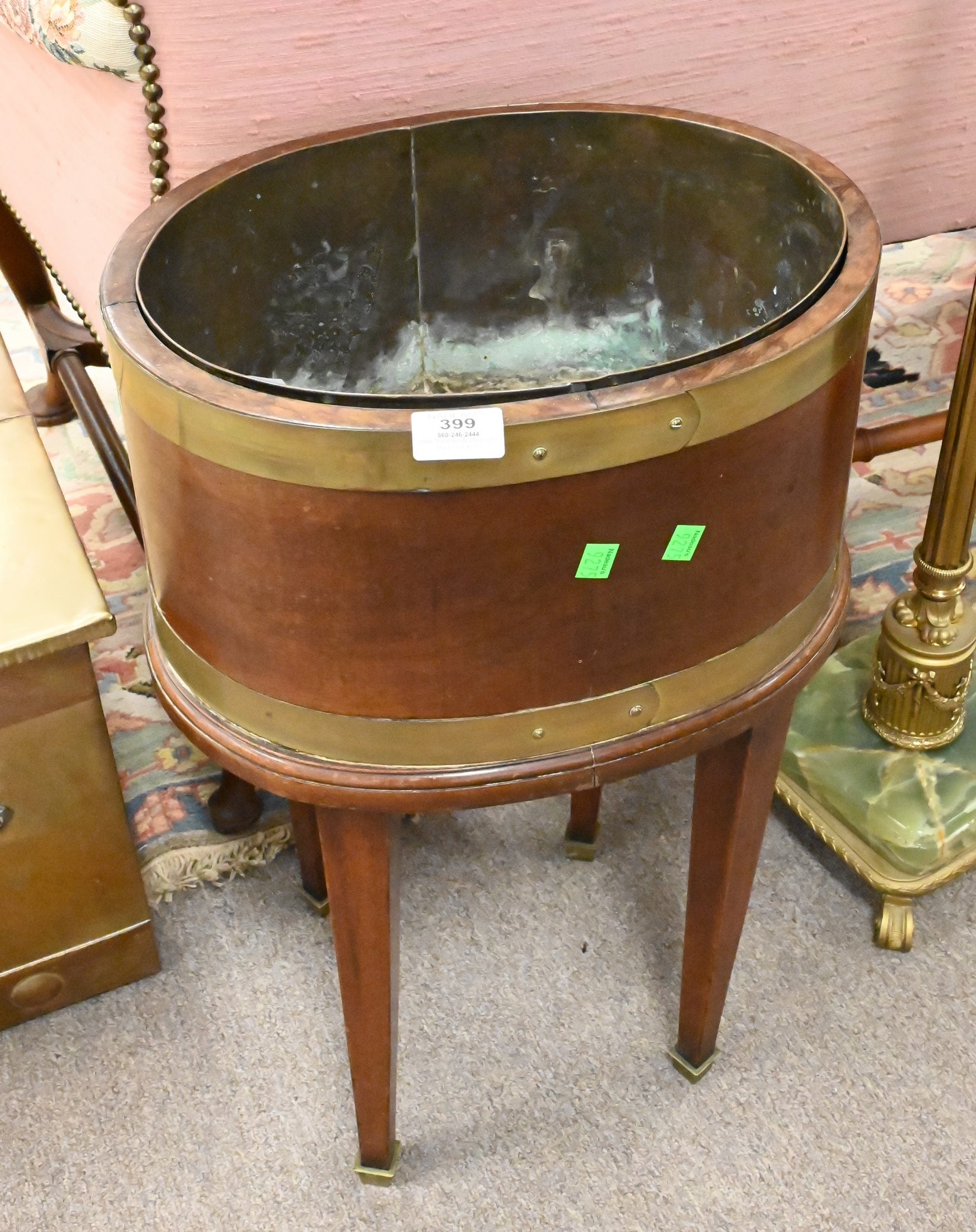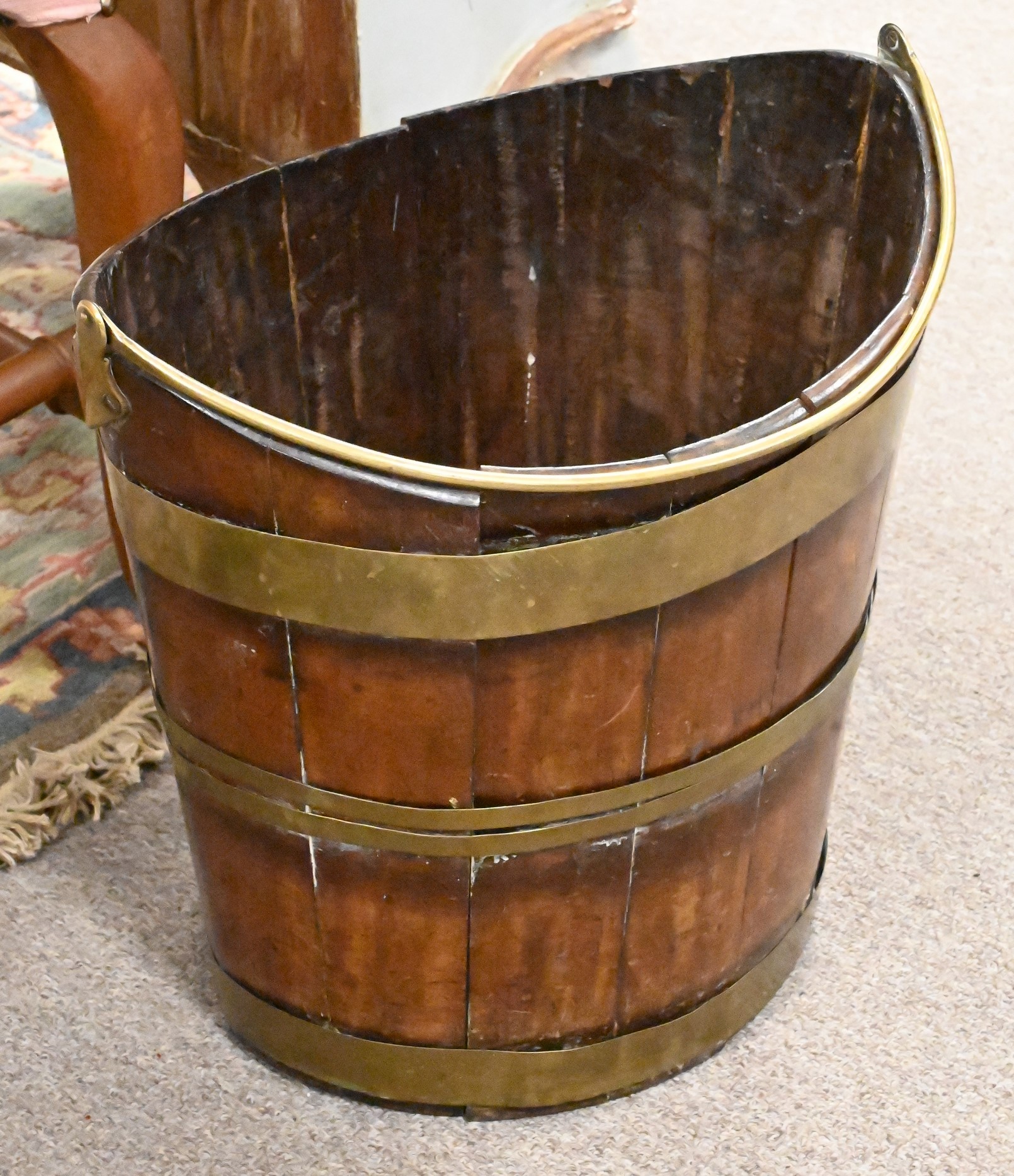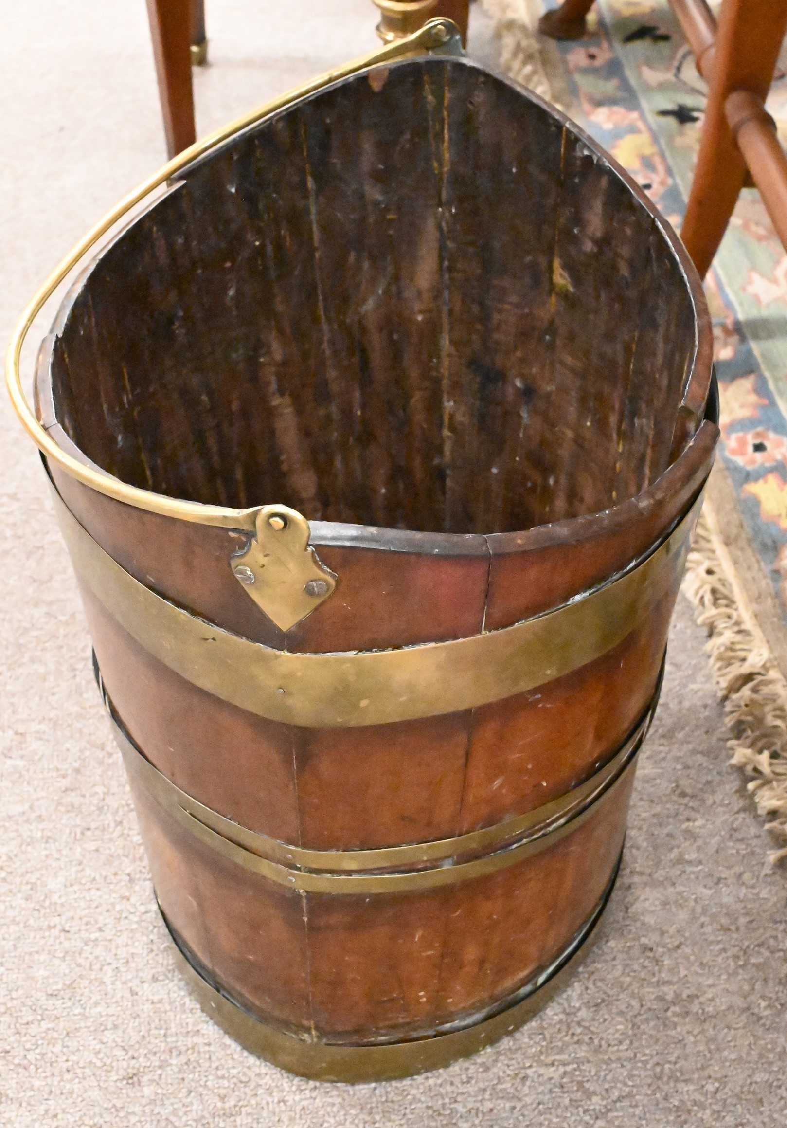 to include mahogany brass bound cellarette set on tapered legs and mahogany brass bound bucket with handle, along with brass box